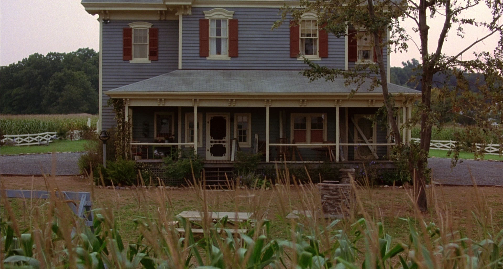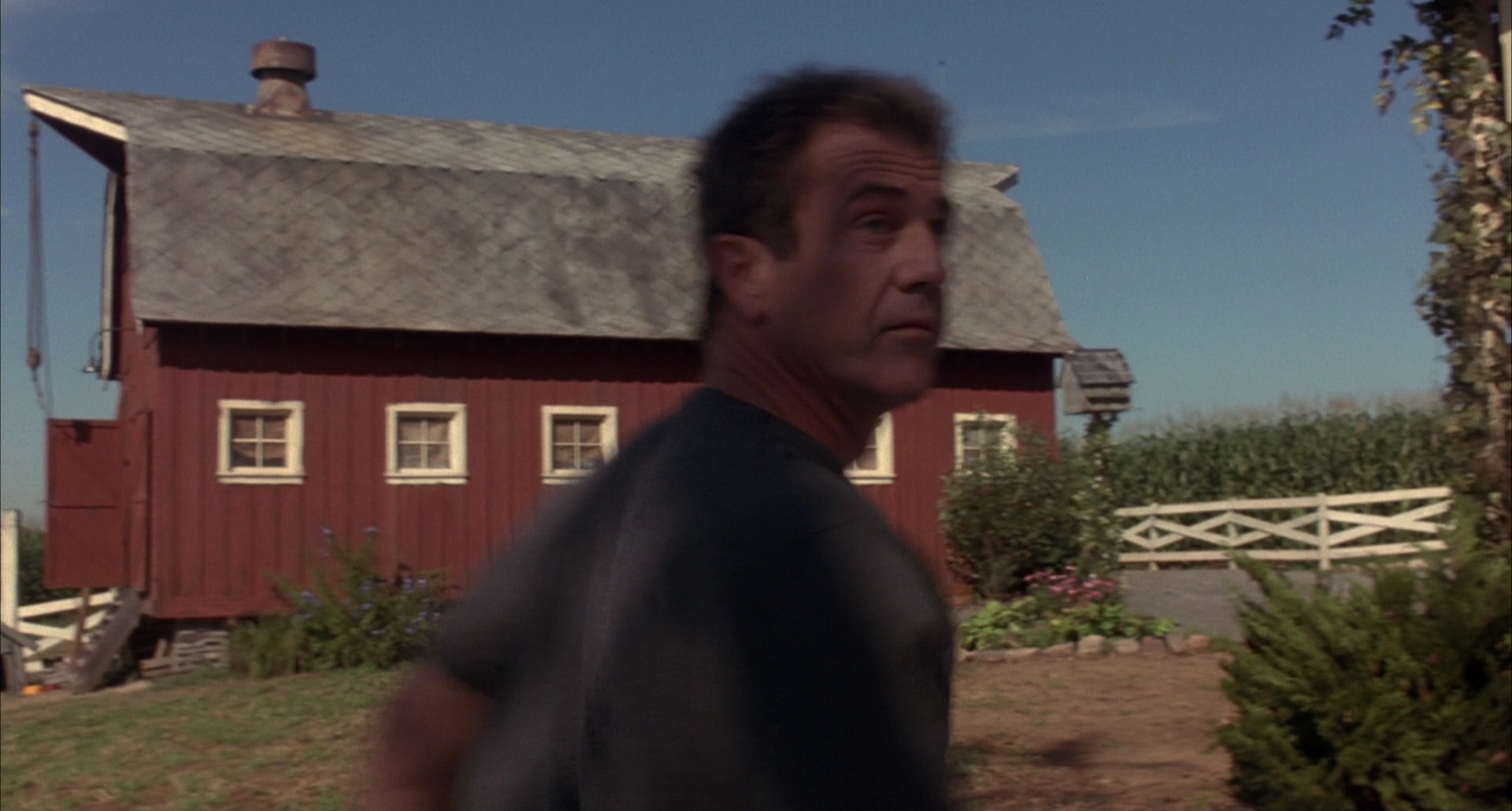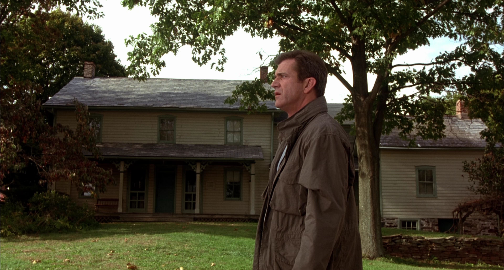 One of this author’s most vivid memories from the first viewing of Signs is a number of external shots with a peculiar interaction between people and some breathtakingly attractive buildings. Wide-angle lenses and low-angle shots co-operate to make the Hess family residence loom over the characters, in a way that feels both benign and unsettling, as if the beautiful structure could topple and crush them at any time: