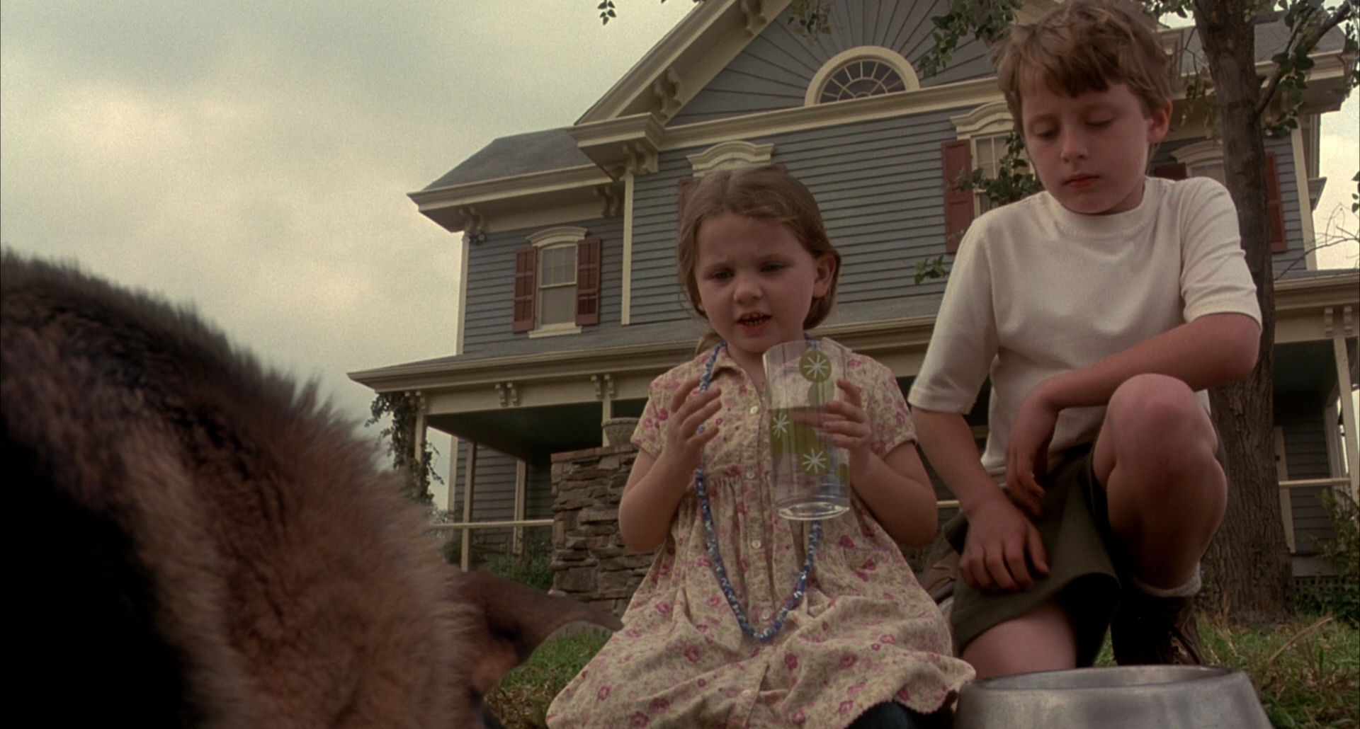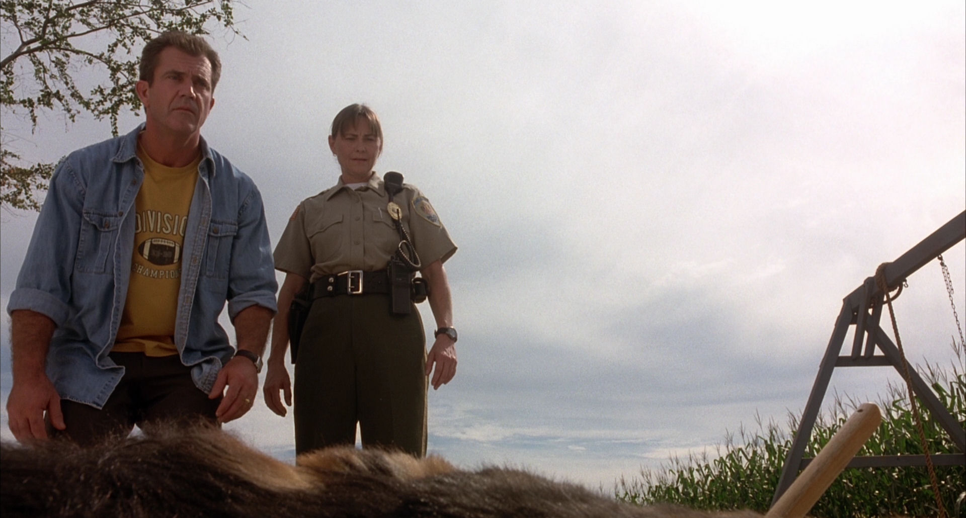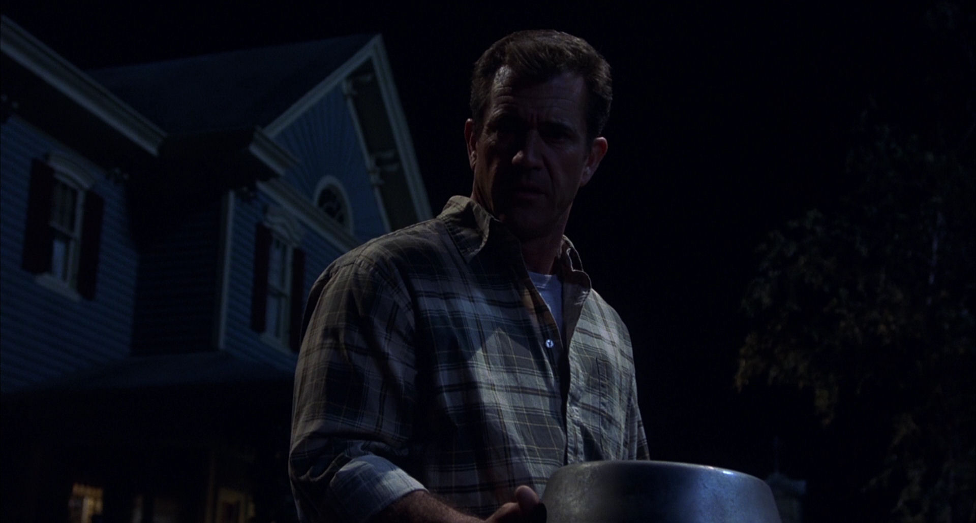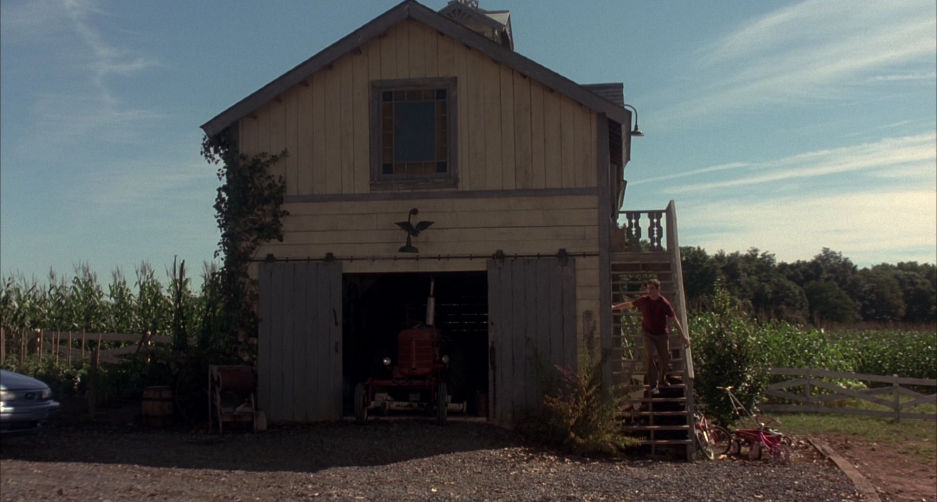 One of this author’s most vivid memories from the first viewing of Signs is a number of external shots with a peculiar interaction between people and some breathtakingly attractive buildings. Wide-angle lenses and low-angle shots co-operate to make the Hess family residence loom over the characters, in a way that feels both benign and unsettling, as if the beautiful structure could topple and crush them at any time:
