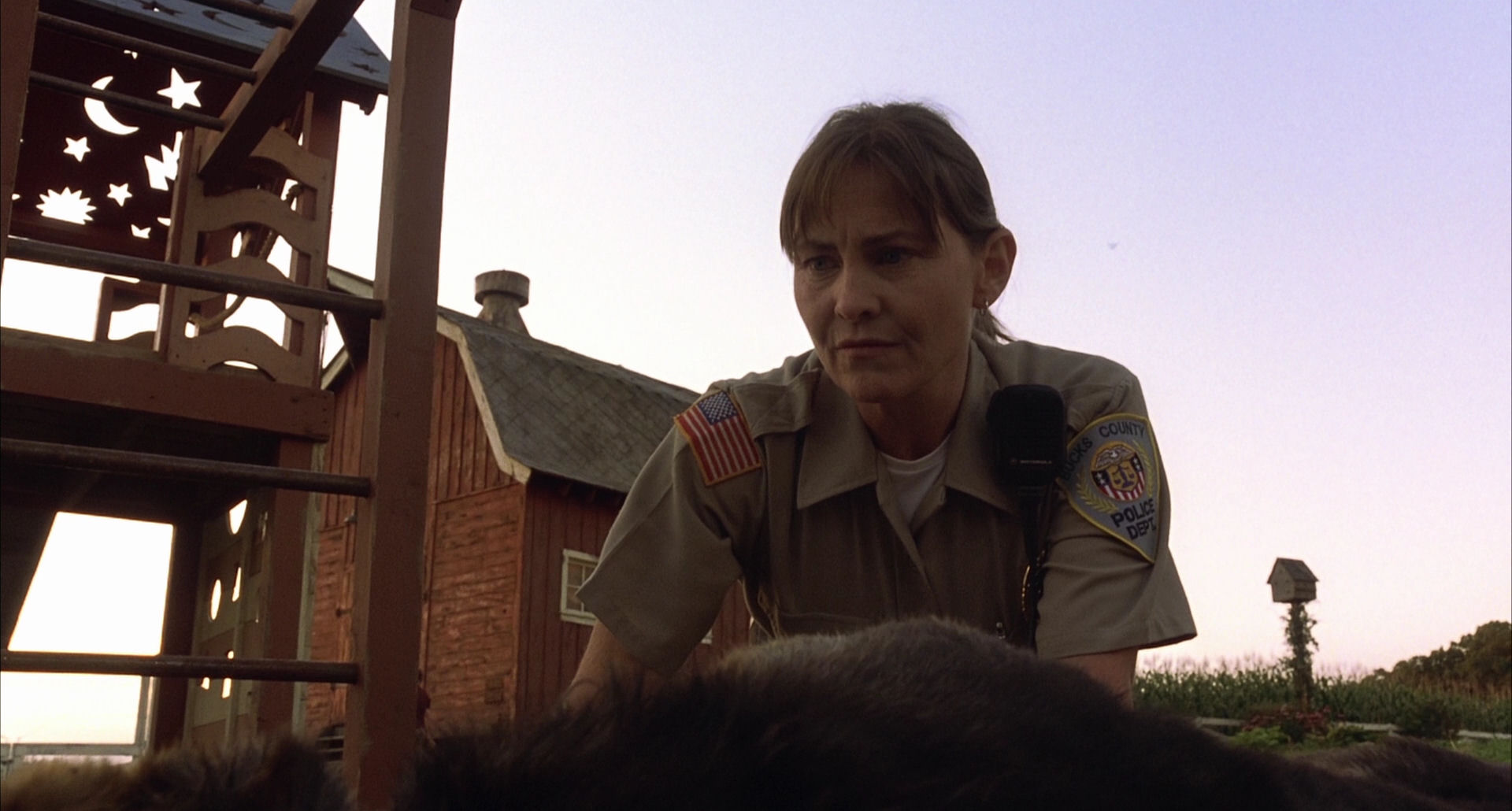 Even more than in The Sixth Sense (see here and here), doors are a central motif in Signs. One of its finest moments occurs as the sheriff drives away after having interrogated the family about the nightly visitor. The music is elegiac and mournful, blending in with a voice from a news report about the aliens – one undercurrent of the scene is that it is the last time we see the sheriff in this time plane, and she might well have died during the later invasion.