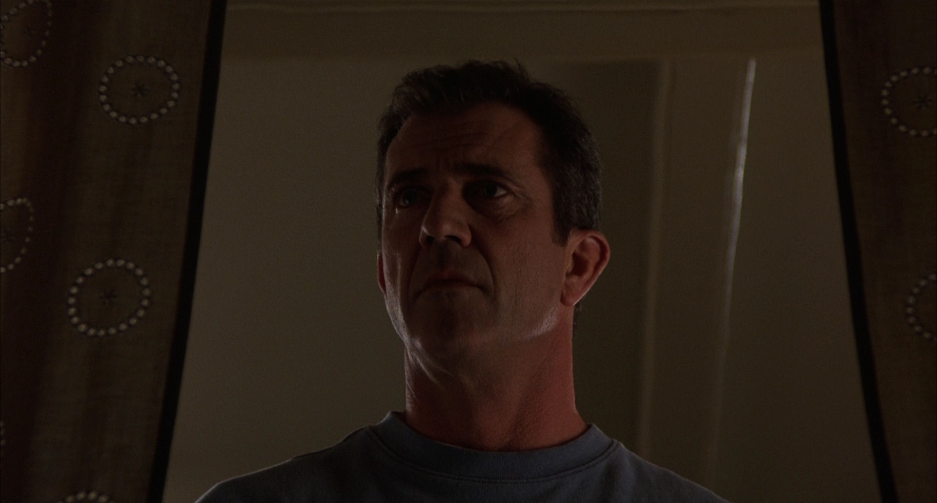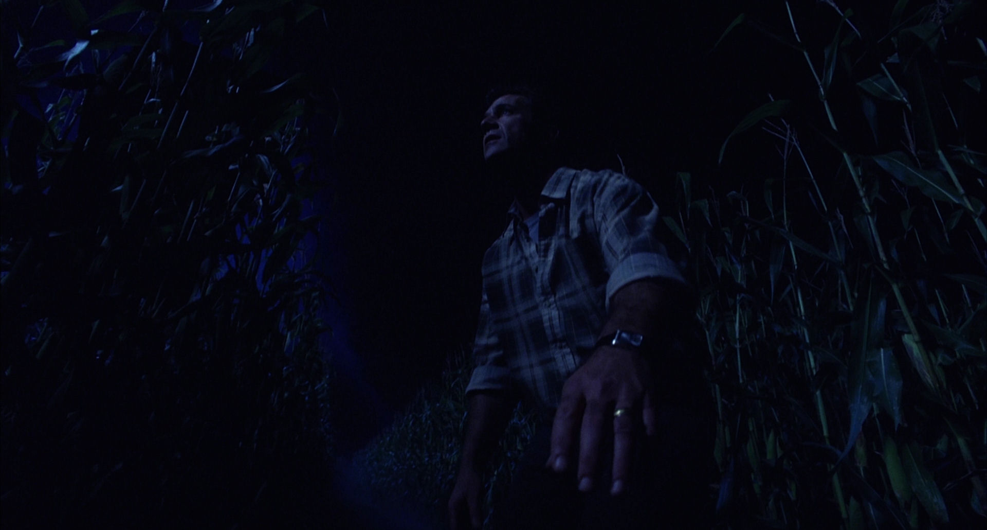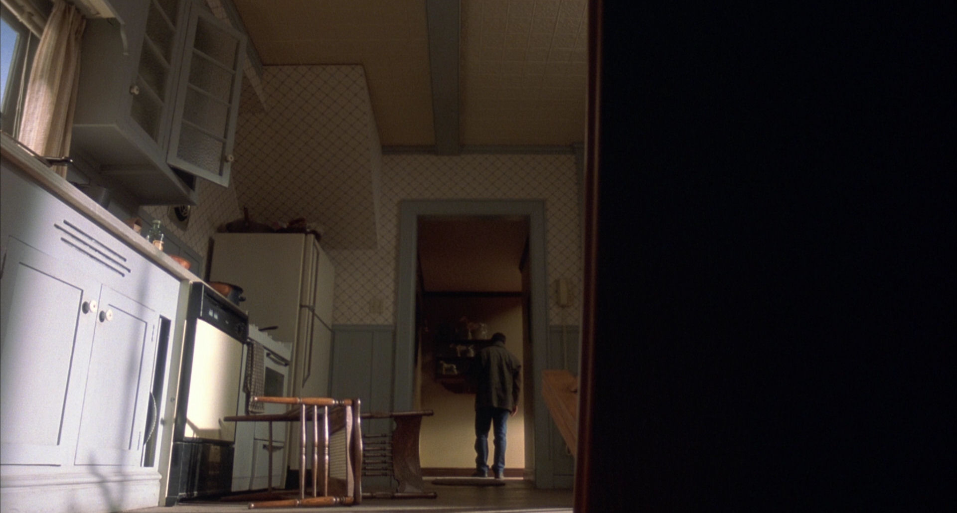 There is also a parallel with the cornfield scene, where he was (1) talking to an unseen alien presence as if it were a human being; (2) using an object, a flashlight; (3) fled the scene in abject horror; (4) through a passage; (5) shot with a wide-angle lens to make him run “faster”. But there has been development in Graham’s character, because in the kitchen he stops in the doorway…