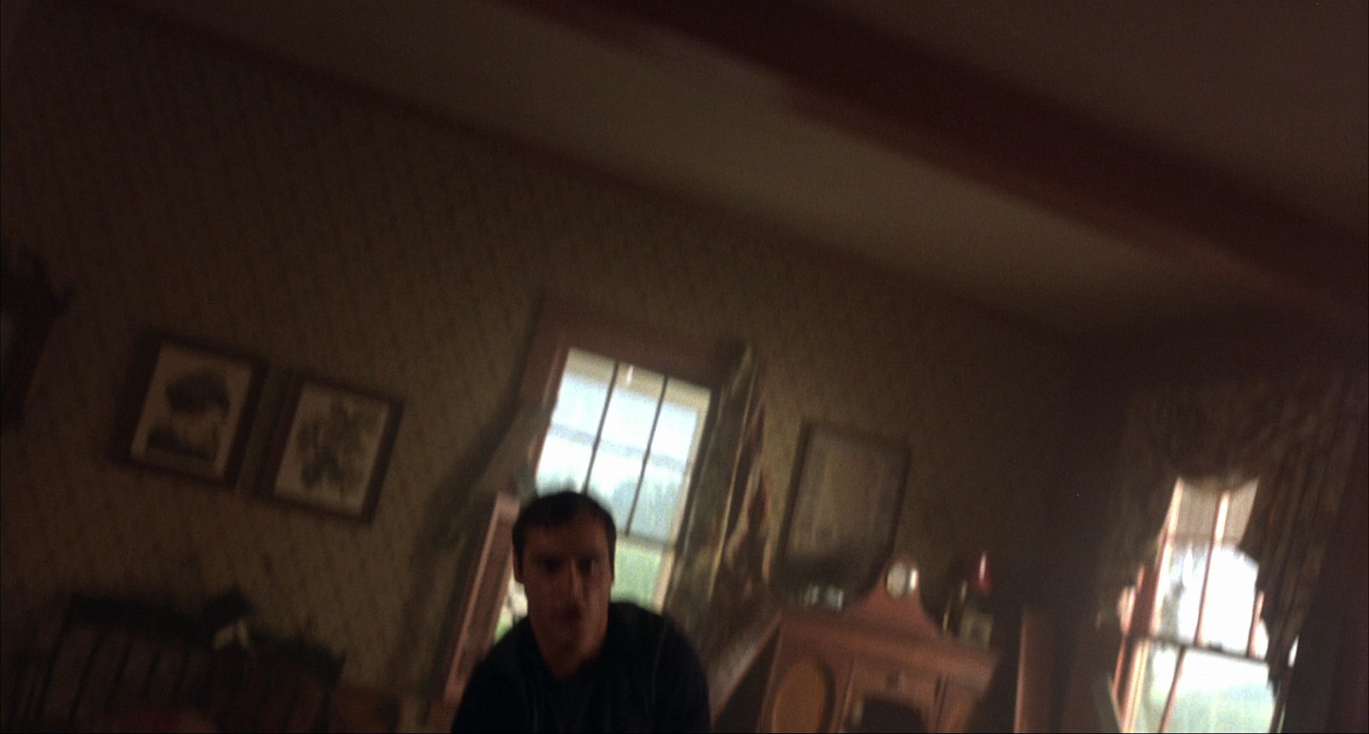 A very chilling situation: there is definitely something pacing behind the door. As soon as Graham starts talking, it freezes – mirroring the frozen video – in the position of the rightmost image. It remains like that for a long time, as shots alternate between the door and Graham. In a touch of light comedy, he pretends to be a policeman. In line with his mood the same morning, he is in denial, preferring to believe everything is the work of the local good-for-nothings…