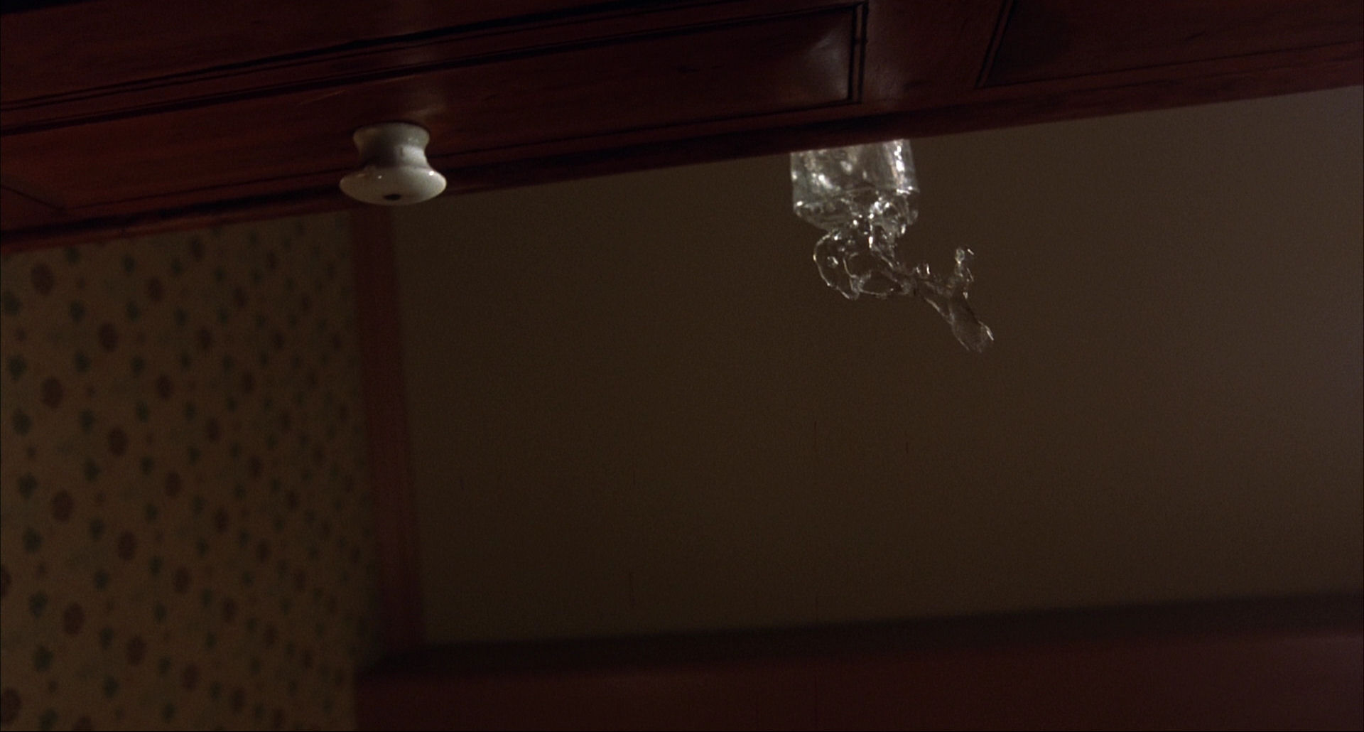 This glass is a very specific one: when it soon topples the family discover water’s destructive effect. The following slide show selects key moments of the revelation and the alien’s demise. The climactic moment is a 16-second shot from the alien’s subjective point-of-view, where the whole frame becomes drenched in water – possibly as an homage to the last shot of Hitchcock’s Spellbound, where the gun is fired right into the villain’s face.