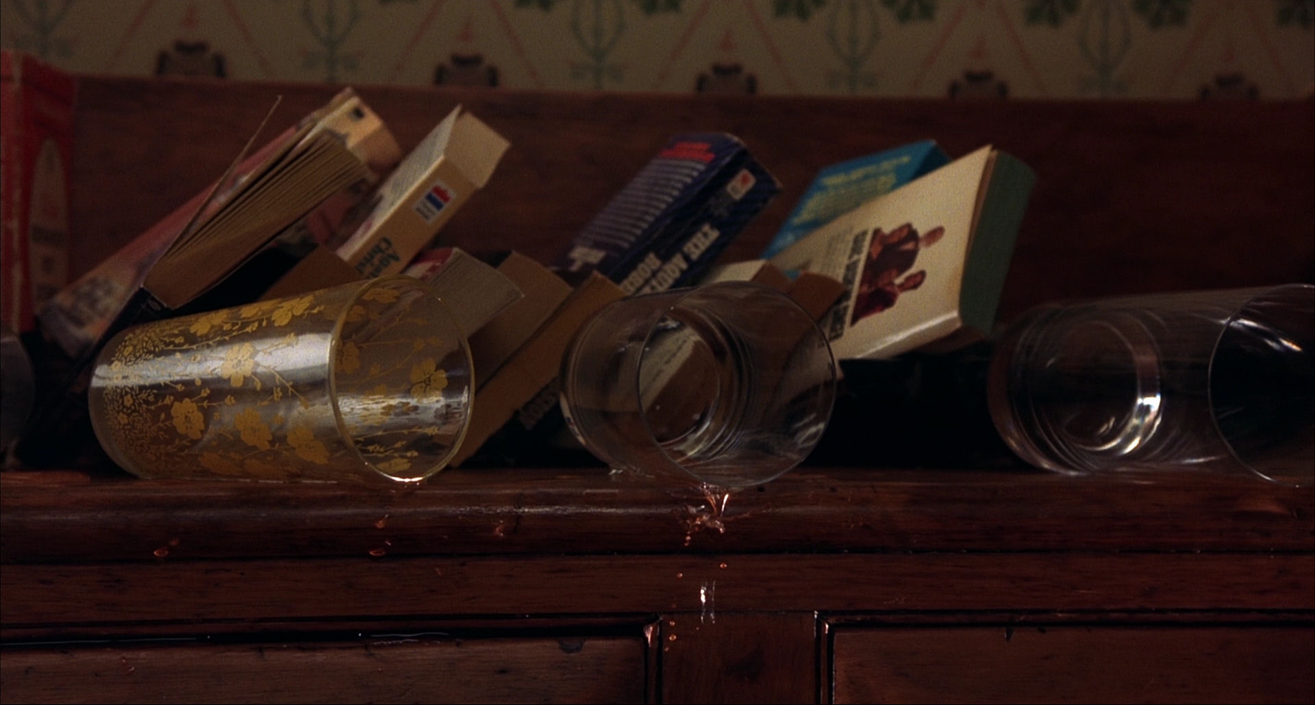 The slide show ends with a number of overturned glassed forming a series of circles. And perhaps the placement of the glasses perched on top of the TV in the earlier scene was not accidental – directly “above” the aliens reported about on the news, like the glass above the alien that spilled its content from the top of the bureau.