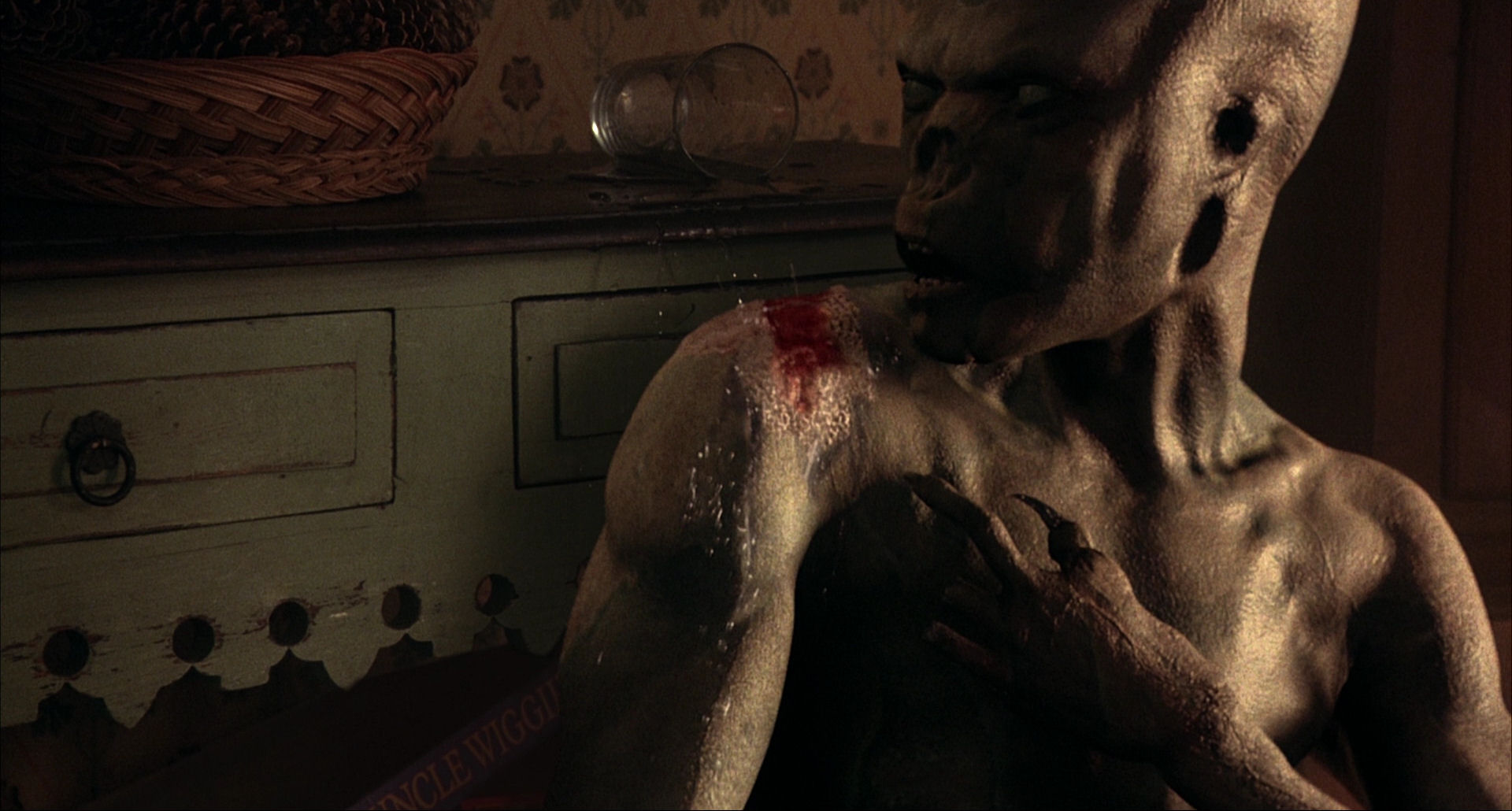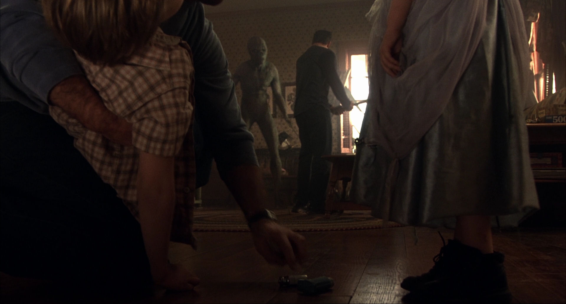 The video was also preparation for the pantry door scene. In the car we saw that Reddy was hurt, but the video proved the aliens aliens are manifestly real. This makes us approach the current scene with much greater apprehension, which is only increased by Graham’s own denialist attitude. As discussed in the first article, the scene is also clearly connected to the “horror show”. Part of this is through contrast: the awful din from the birthday party children in the video leads directly to a scene marked by absolute silence.