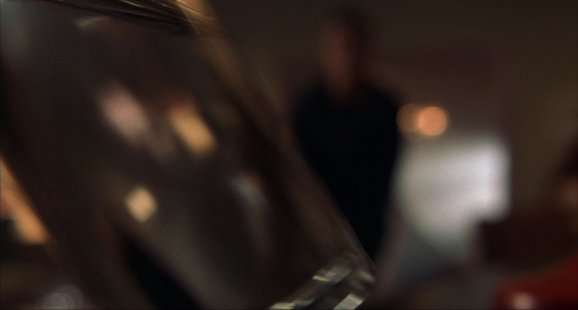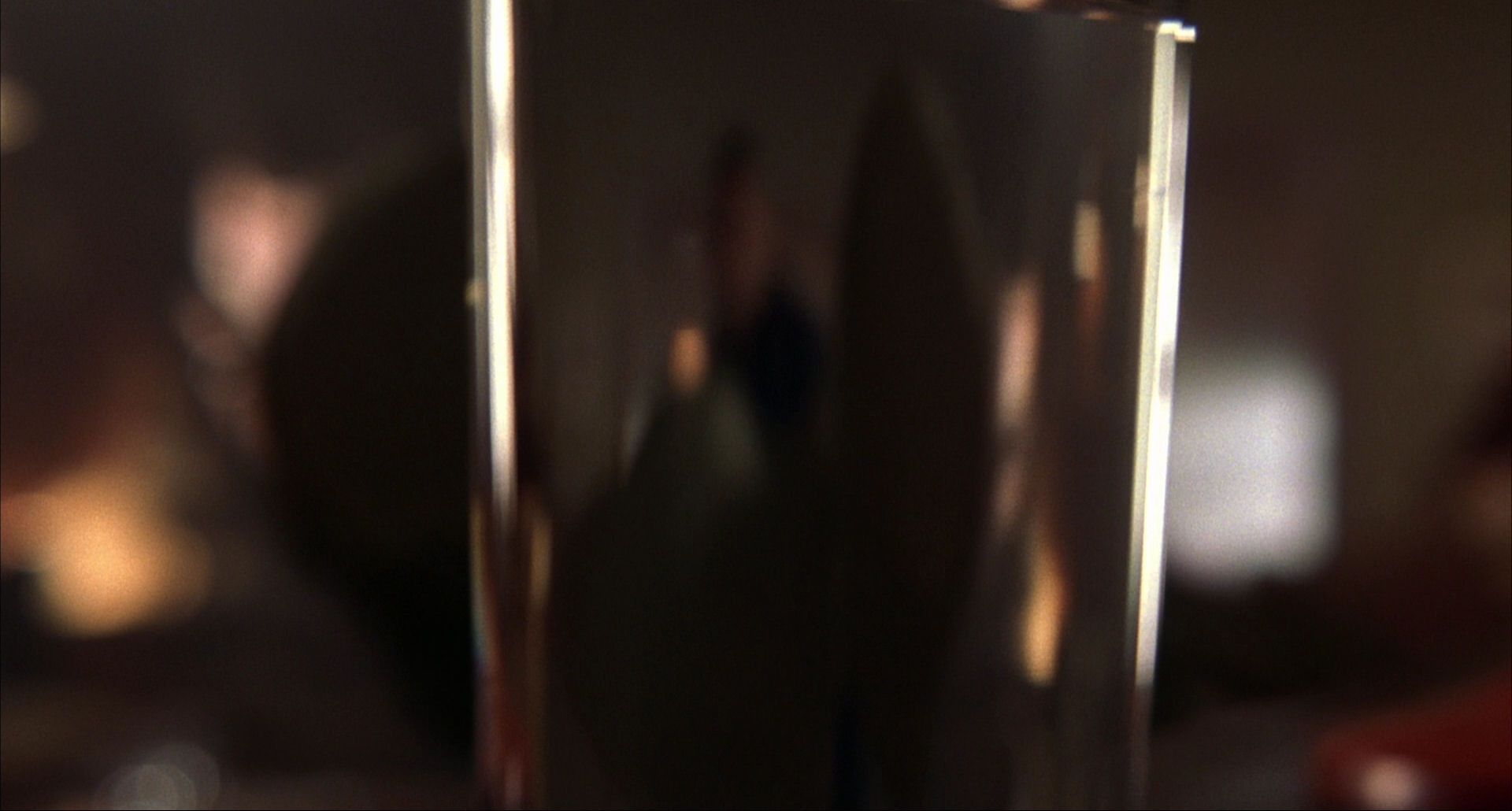 The image starts to dissolve into a close-up of two glasses of water on top of the TV (thus “close” to the aliens)…