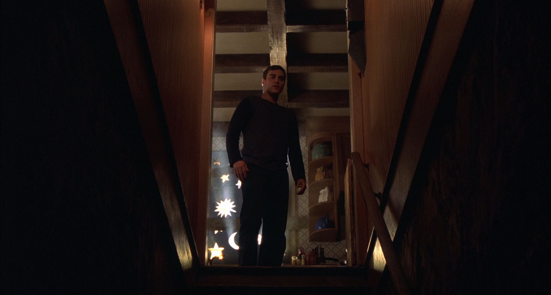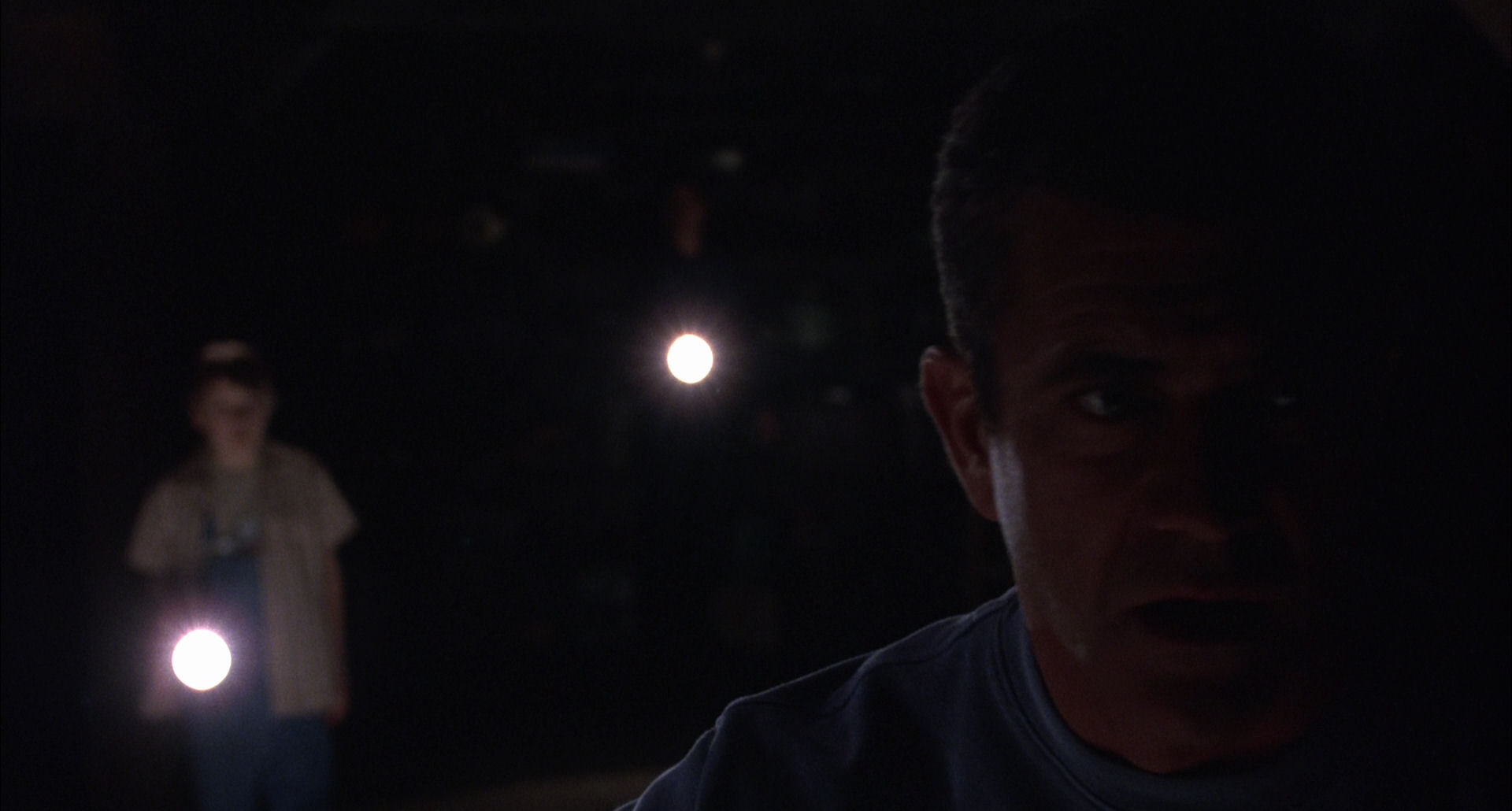 Even though in almost every department, Signs is a less audacious film than its immediate predecessor Unbreakable, it still utterly flies in the face of mainstream cinema’s fast cutting approach. Perhaps its most daring shot as regards static duration is the 57-second one (above) where Merrill goes upstairs to see if the aliens have left the house. For most of the shot the camera fixedly gazes up the cellar stairs while he slowly ascends, and for 13 seconds it just stares at an empty image, except for strangely luminous shapes on the boarded-up window.