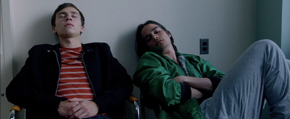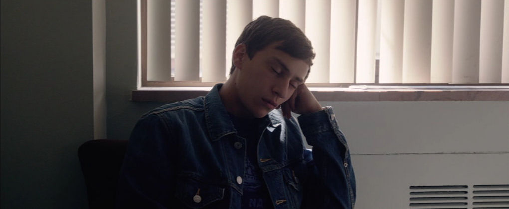 Below is the start and end point of the film’s most elaborate and art-film-like scene – the teenagers visit a school to find the real identity of Jay’s boyfriend – a 91-second take where the camera twice swivels around its own axis, before it closes in on a situation framed by a door: