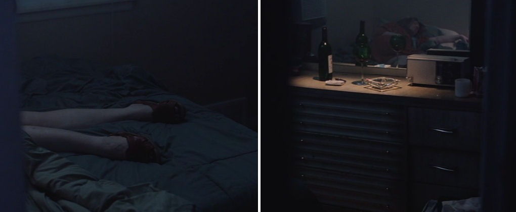 Drinking is even further connected to the Follower: at two occasions crushed cans have been hung up in windows, as an alarm signal if a Follower should enter. Jay’s hysterical, rather odd exclamation «I need water!» when she is afraid that a Follower at any time could enter the bedroom, also fits the pattern, as well as glasses of orange juice being a vital part of the two stylised shots of plates of food (here). Very soon after the first occurrence, the camera is mysteriously gliding along the kitchen worktop before it ends up gazing at the mothers of Jay and Greg, drinking wine together. One motivation behind this movement is probably to have the faucet appear in the shot. Finally, Jay’s mother is almost always depicted with wine glasses and bottles nearby.