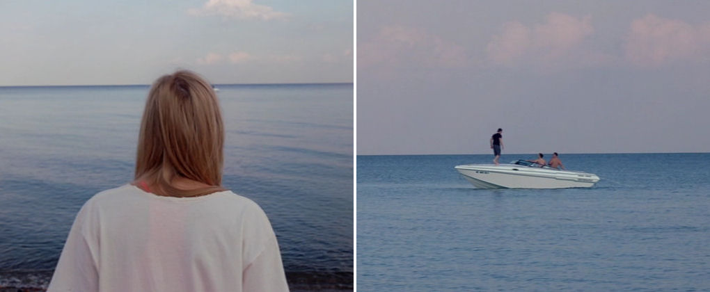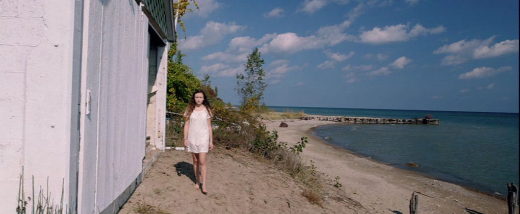 Below follows a small slide show displaying other situations where larger bodies of water are important: Jay and her boyfriend have a date at a shore. The sea is visually prominent in the scenes at the cabin owned by Greg (Daniel Zovatto), Jay’s neighbour and classmate. One of the Follower bodies turning up there is filmed with the sea conspicuous in all her three shots, giving it an even more unsettling air since “she” resembles the girl of the prologue. Finally, Jay swims out to three boys in a boat to engage them in sex.