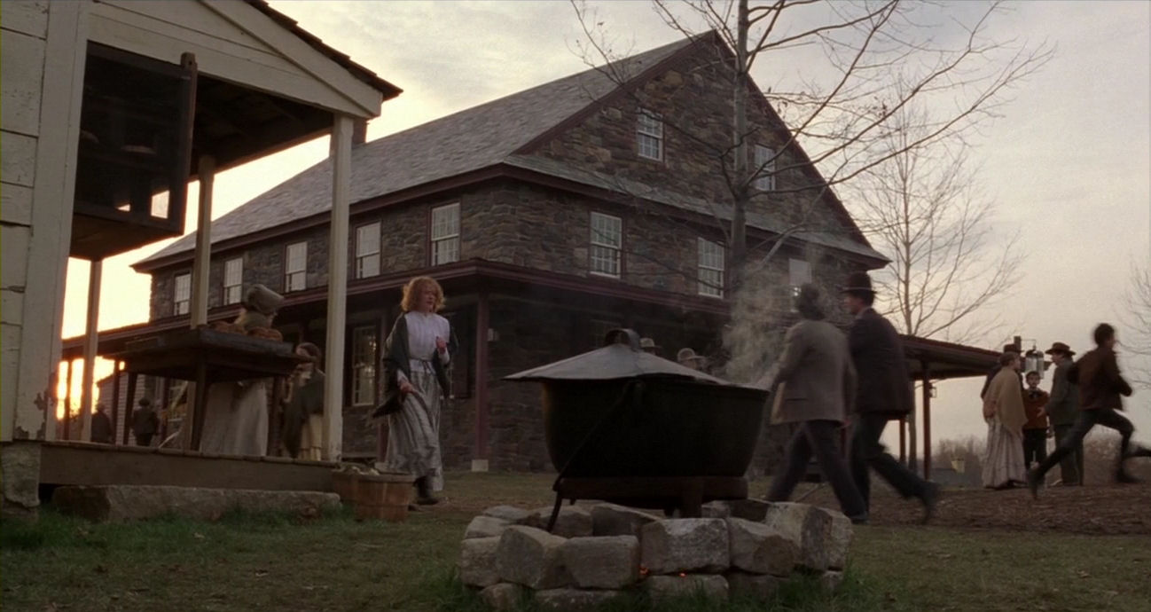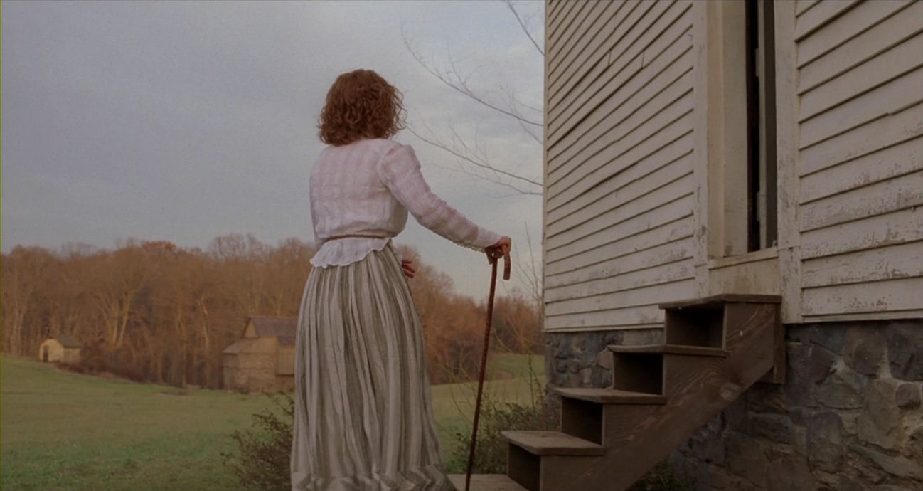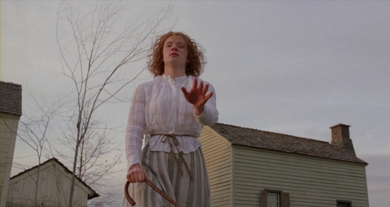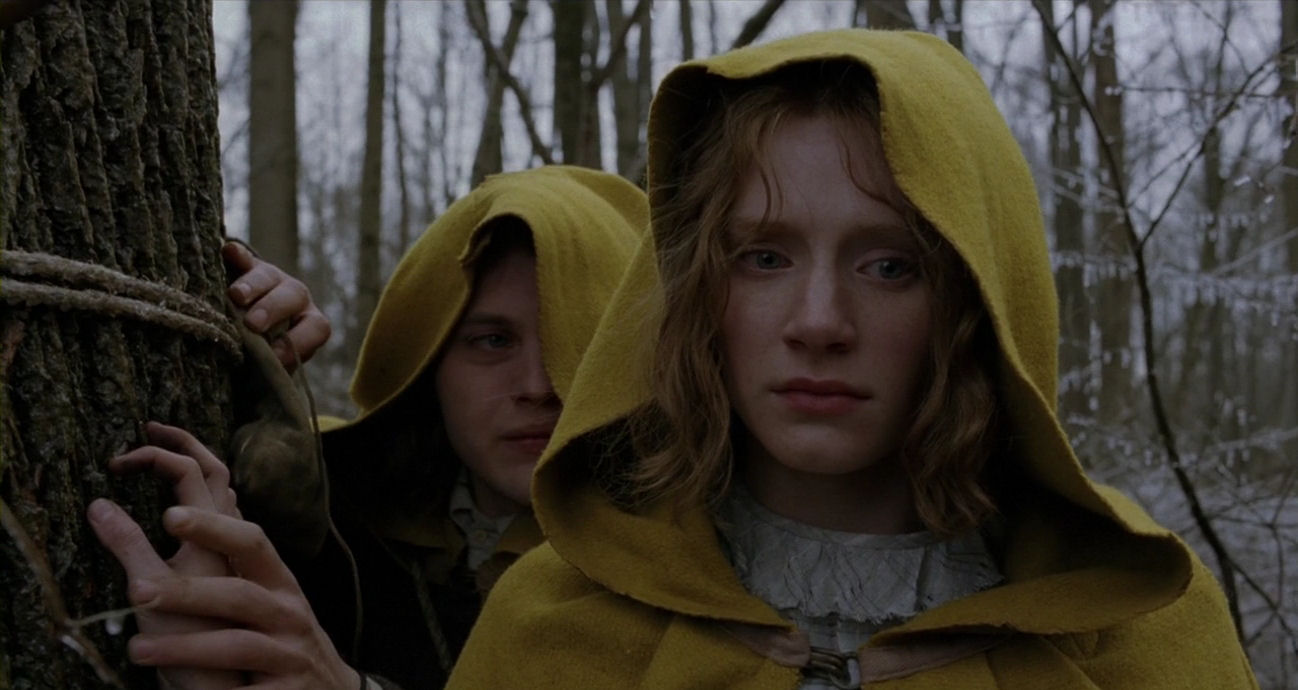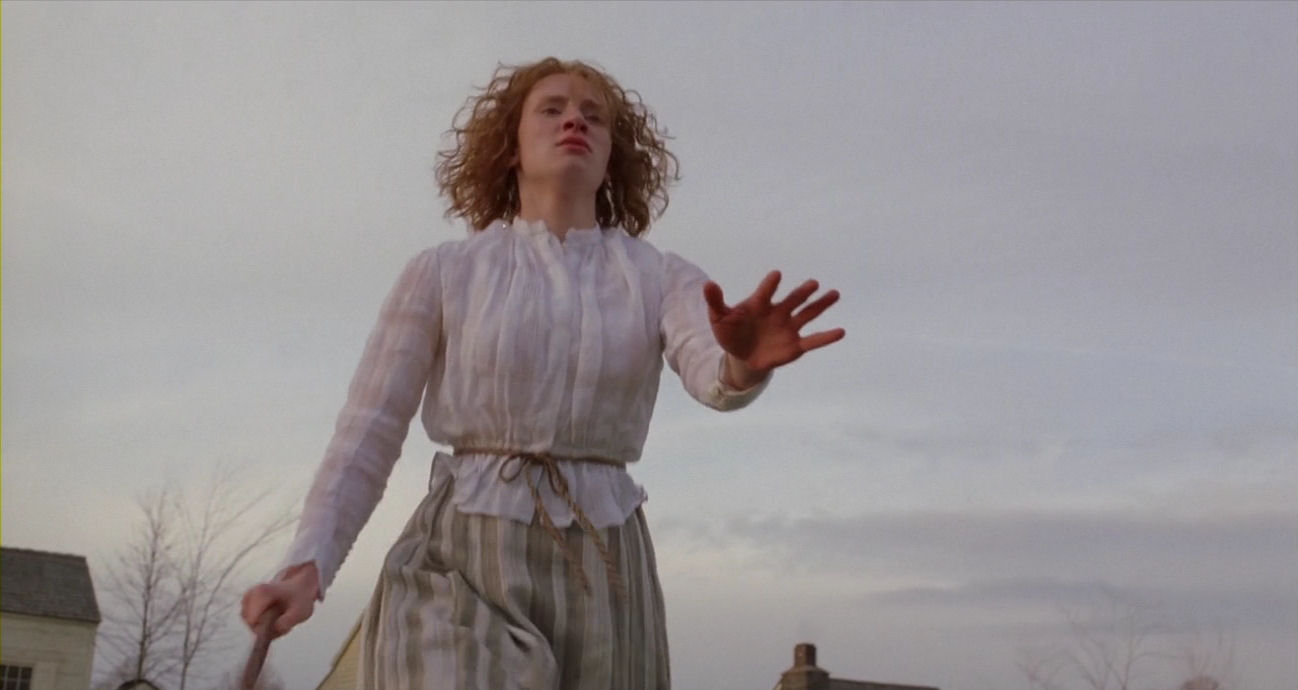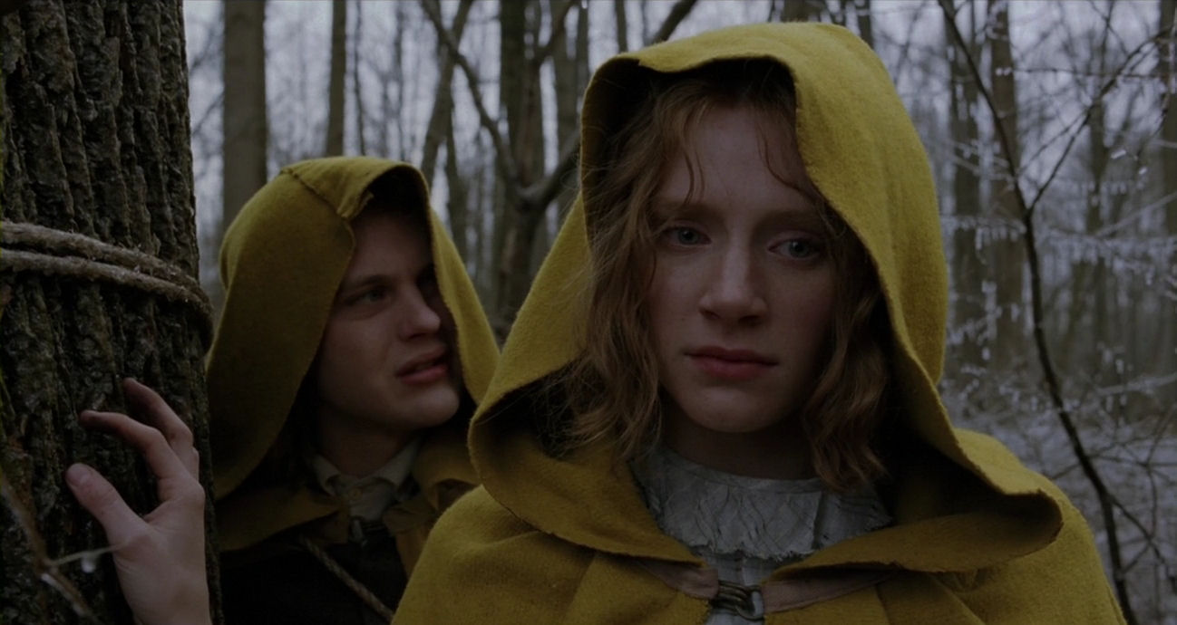The conditions in the valley of the village are very windy, as can be seen in many scenes (for example here). Just watch how the wind torments Ivy’s hair above – it is also clearly bending trees in the background of this scene, so it is not simply due to wind cannons – the weather adding immensely to the feeling of fatefulness of the situation, with Lucius close to death and Edward’s heavy voice saying: “The moment I heard my daughter’s vision had finally failed her, and that she would forever be blind, I was sitting in that very chair. I was so ashamed.” Below, just afterwards, having arrived at the old shed, the wind augments her look of sudden vulnerability: