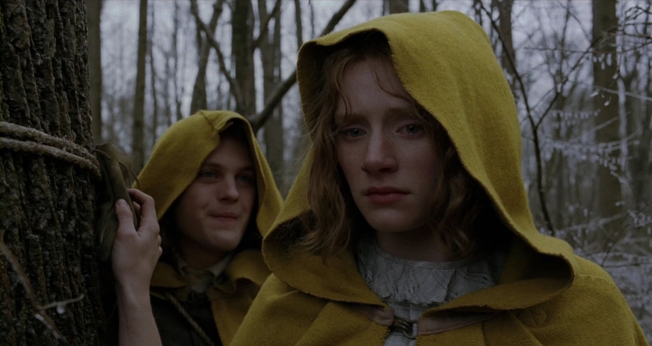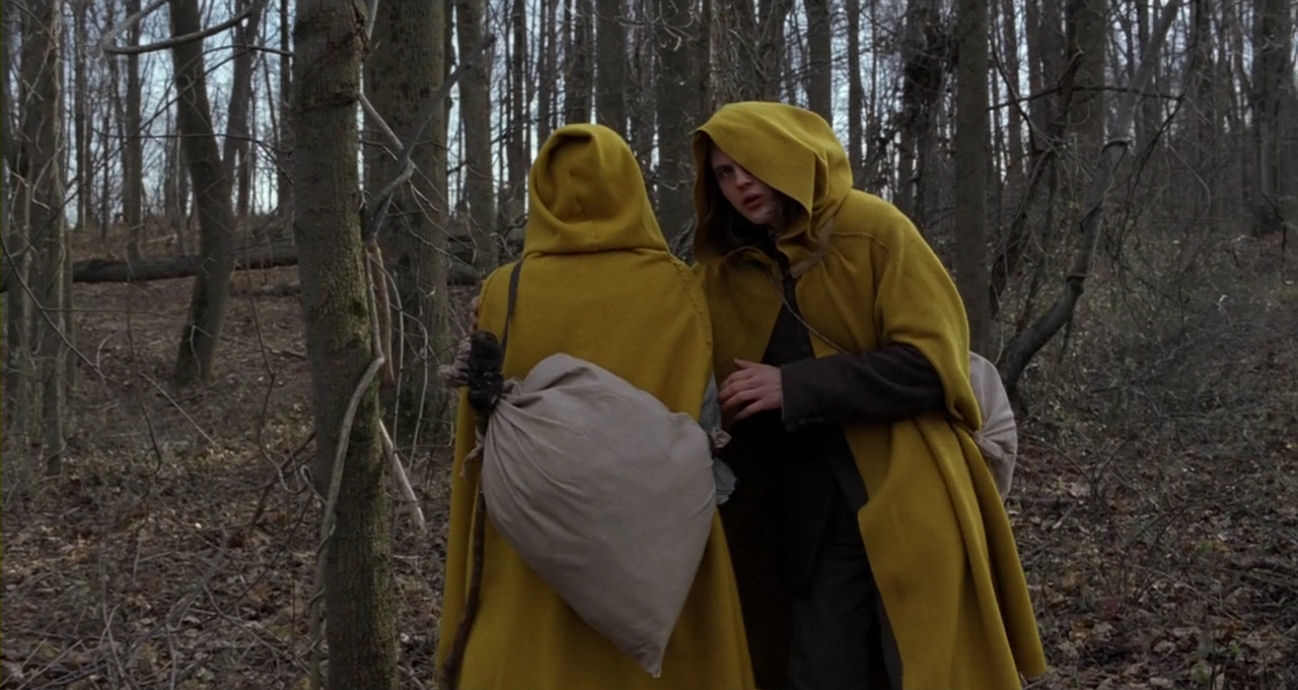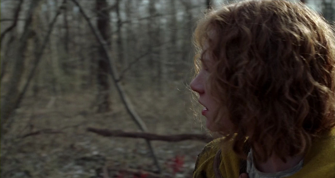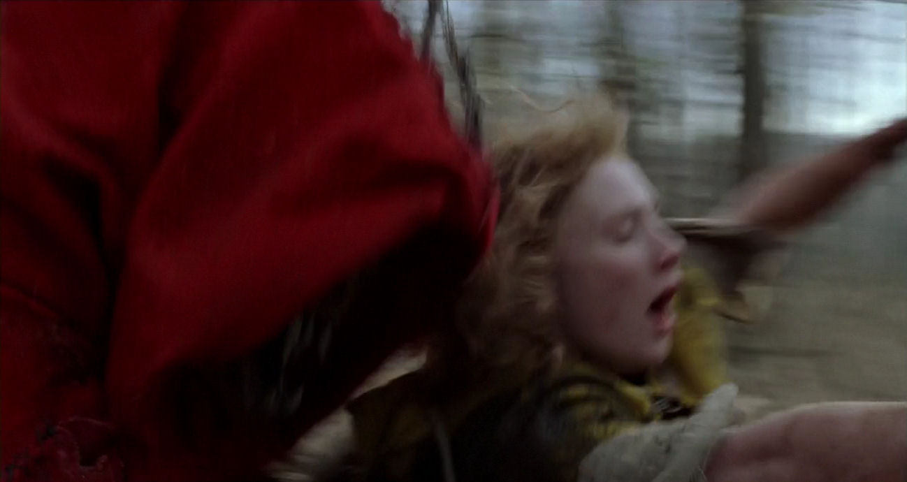 The start of the quest marks a monumental turning point in the film. Most of the action will now unfold trapped inside a desolate landscape, drained of colour, allowing feverishly bright-coloured figures to stand out as archetypal properties or elemental forces. The tone becomes obsessive, reinforced by the presence of characters who are unable to go into the woods unless they wear special clothes, as if they are governed by overwhelming neurosis – or as if they enter new personas to act out a medieval-looking ritual. It is a ceremony marked by serenity and calm, however, where the drama is kept smouldering below the surface. The hypnotic, ritualistic nature of the quest sequence is solemnly announced by a peculiar, stylised staging of the players’ first appearances. The last moments before they enter the woods are accompanied by doom-laden, blaring orchestral music, which is pushed over the edge into a modernist, frenzied piece as the border is breached.