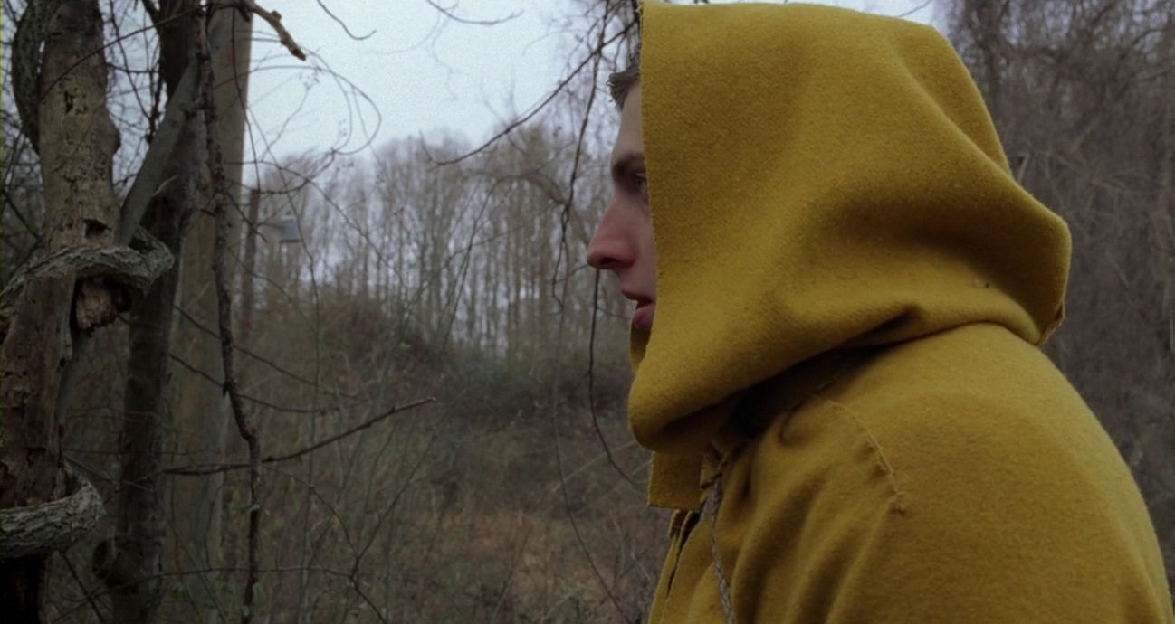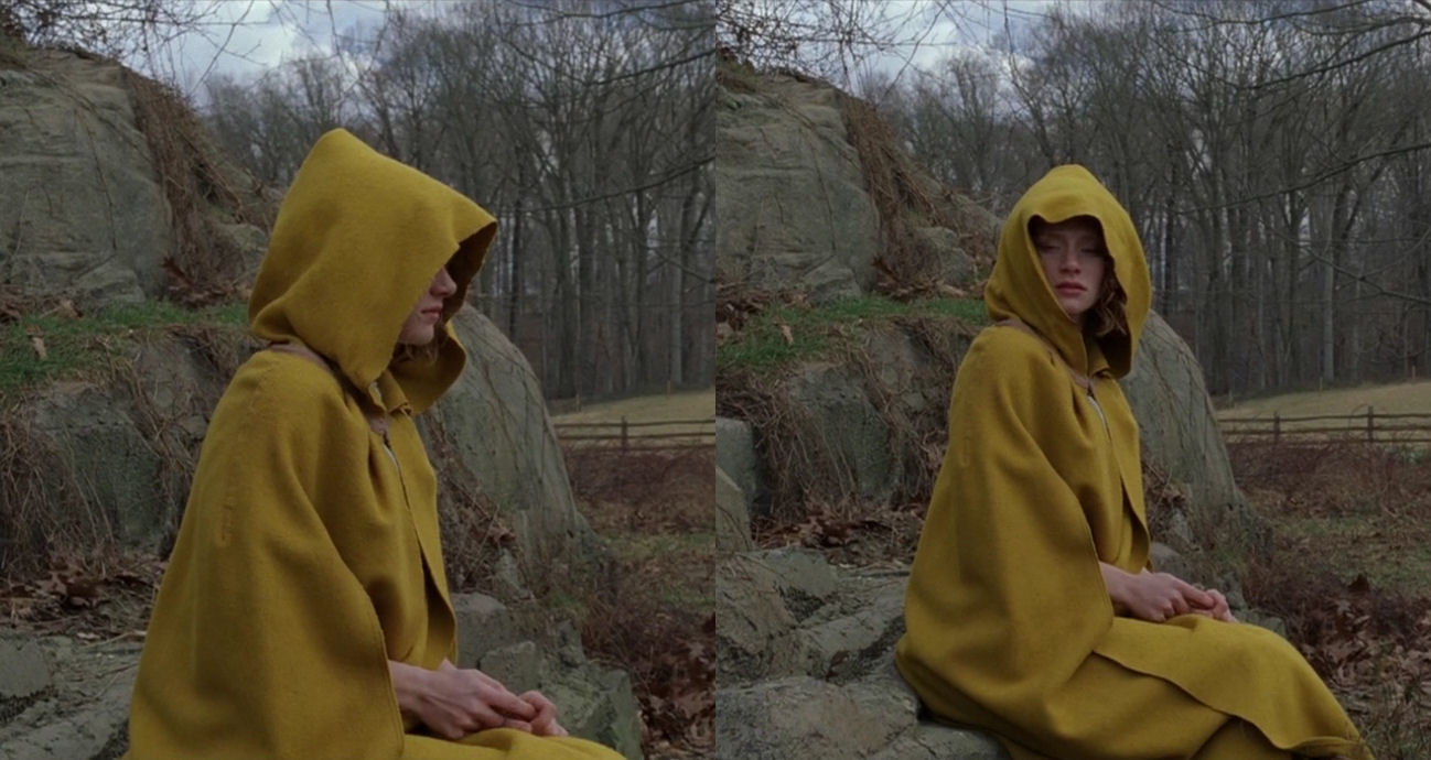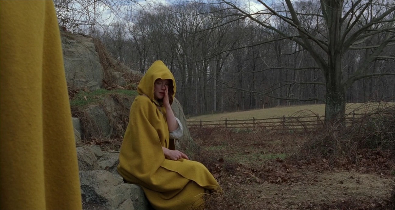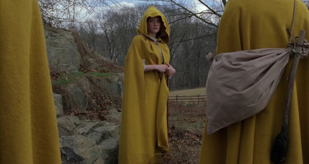 The start of the quest marks a monumental turning point in the film. Most of the action will now unfold trapped inside a desolate landscape, drained of colour, allowing feverishly bright-coloured figures to stand out as archetypal properties or elemental forces. The tone becomes obsessive, reinforced by the presence of characters who are unable to go into the woods unless they wear special clothes, as if they are governed by overwhelming neurosis – or as if they enter new personas to act out a medieval-looking ritual. It is a ceremony marked by serenity and calm, however, where the drama is kept smouldering below the surface. The hypnotic, ritualistic nature of the quest sequence is solemnly announced by a peculiar, stylised staging of the players’ first appearances. The last moments before they enter the woods are accompanied by doom-laden, blaring orchestral music, which is pushed over the edge into a modernist, frenzied piece as the border is breached.