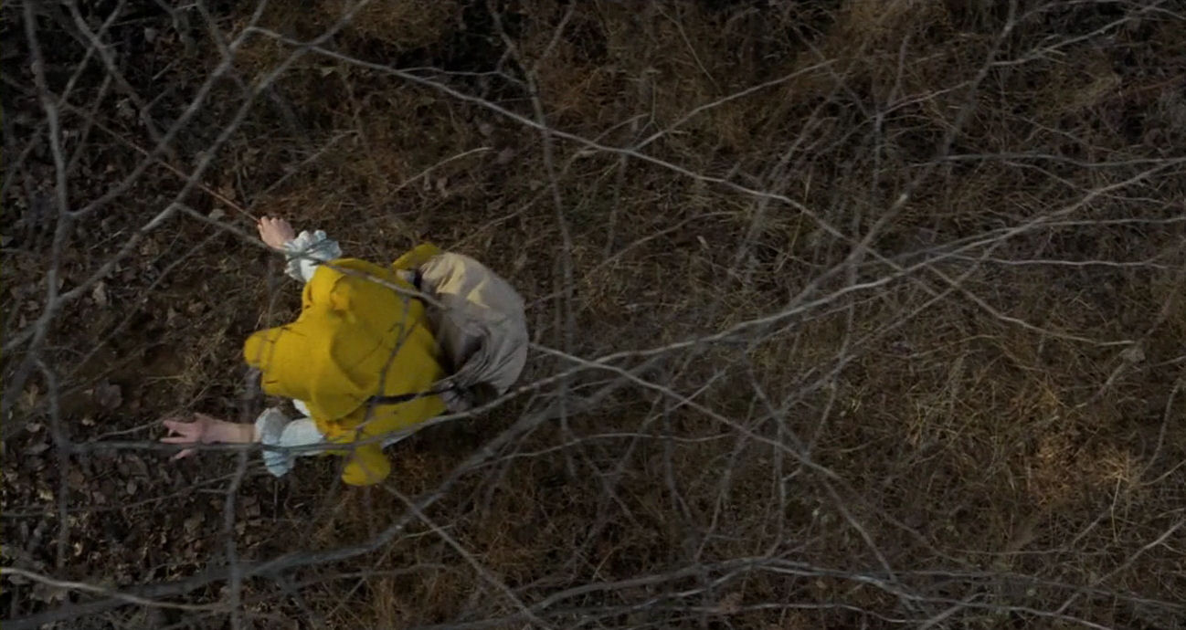 Below, we see that Ivy leaves the shot entirely before the next character enters. This fragmentation indicates their tenuous solidarity and foreshadows the coming disbandment. The distance between characters and their one-by-one appearance recall the dazed confusion emanating from the stylised shots in the aftermath of the livestock massacre:
