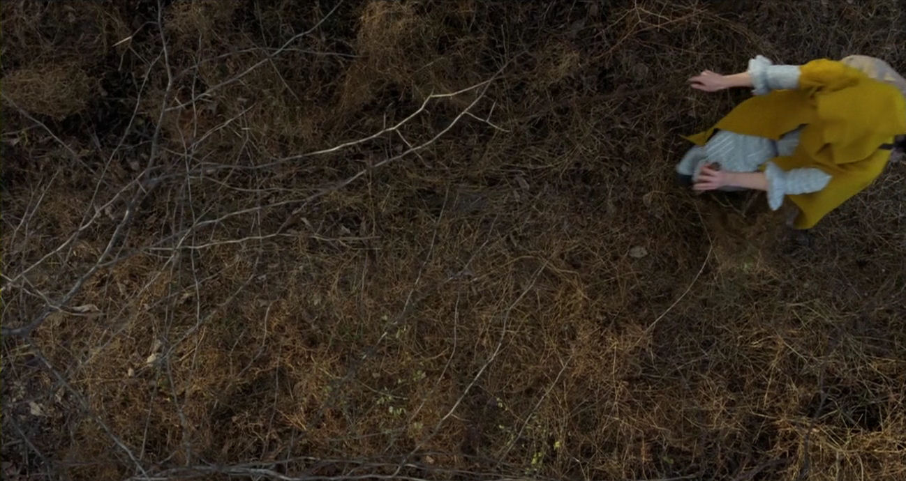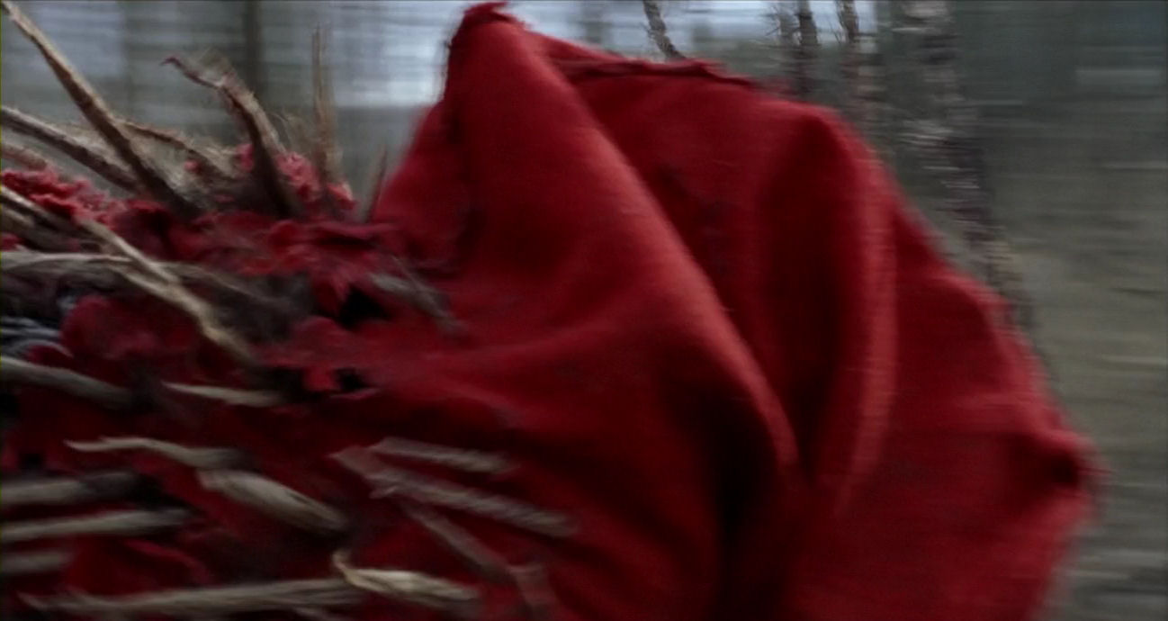 In this interpretation, drawing a connection between wind and breathing, which we have already touched upon, is especially useful. Ivy’s breathing is accentuated heavily during the quest, for example when she is hyperventilating before she is revealed as entrapped in the red field. During the final chase she is breathing heavily, especially in this shot. She is also constantly waving her hands as she runs, and this can be linked to the cut-aways of the trees: they are blowing in the wind (breathing), waving their own extremities, the branches. So there is already an alignment between Ivy and the forest: they breathe and wave together, as one.