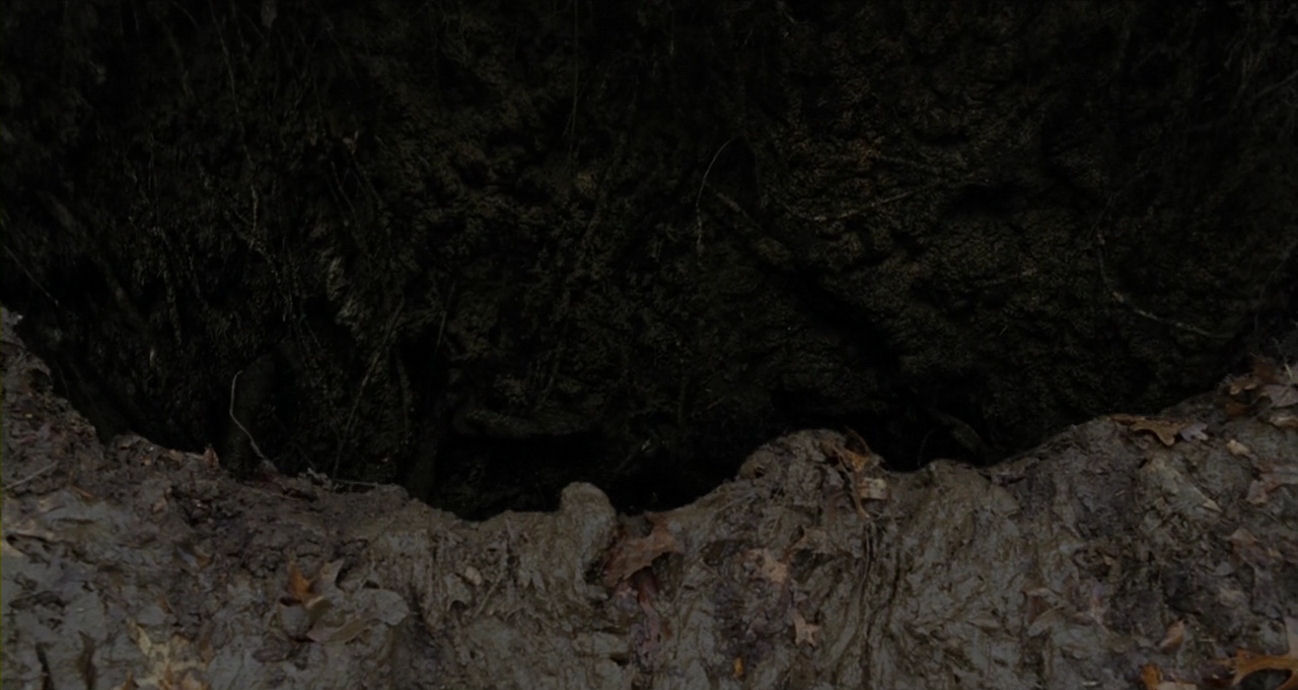 When she touches the root her head is cut off by the framing. When she feels her way around the pit (above) the hood covers her eyes (in decidedly unflattering fashion, she looks almost demented!). All of this conforms to a strategy of making the viewer implicit in her blindness. When her escorts were still around, Shyamalan eagerly shows her face, even in many bold close-ups, for example during the leaving of Christop (here) and Finton (here), not to speak of her stare into the camera (here). But on her own, without the eyes of others, she is truly blind. As soon as the film returns to the quest from the flashback, when in the lullaby scene the camera leaves her to be swallowed up in the darkness and spidery wood, it is not only a goodbye to dialogue, but also a farewell to her face. Thus, two five-second glimpses of her half-obscured visage, when she grapples with the pit, are the only views of the face of the protagonist of The Village for slightly more than two and a half minute. (But we have not seen the end of it yet.)
