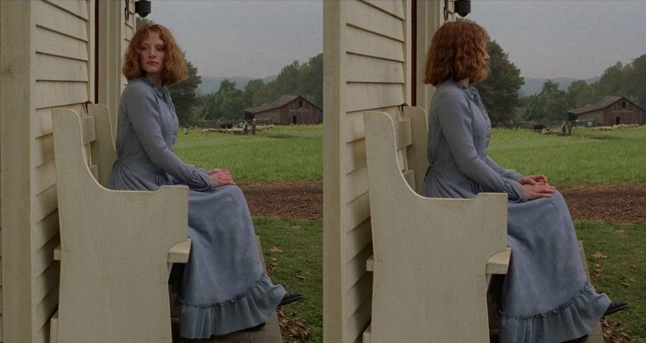 Their second porch scene, the point of departure for the current analysis, starts the same night as the livestock massacre that interrupted Kitty’s wedding party. Ivy suddenly wakes up to discover that Lucius is guarding her house. (The two shots leading up to the scene can be seen here. There are more stuff about the porch scenes in the second article, in the “Lucius and Ivy” chapter.)