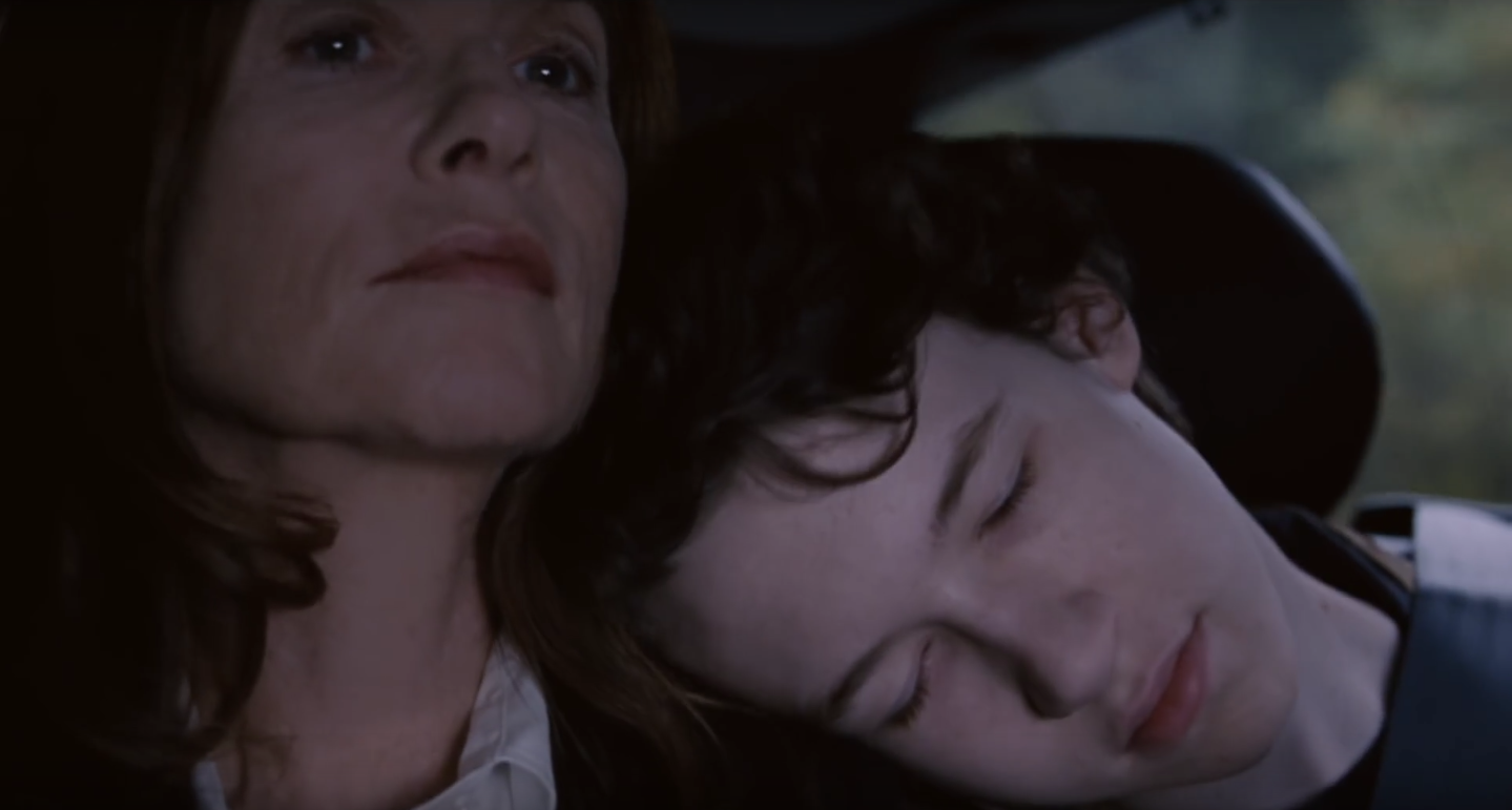Almost everything else in the film is superb, however. The acting and casting maintain the level we have come to expect from Trier. Especially Huppert’s effort is magnificent, most of all through her sheer force of presence, fronted by the dark, sadly melodius, French-accented voice. It is easy to see her role as underwritten, as quite a few reviewers did, but its impact expands enormously on repeated viewings. Standout moments, among many: her face shot from above in heavy chiaroscuro when trying to speak about her depression to her son. The immensely sad scene in the airport where she seems half dead already, looking almost transparent in the bright lighting. The shot in the car from behind where the ragged outline of her face seems almost inhuman in its depression. There are many such moments of truth in the film, for example when the teacher is stacking her papers and trying not to cry in front of the class.
