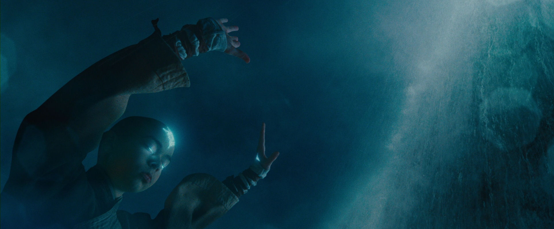 The five-minute crest of the extensive climax must be among the most monumental in film history, without ever losing the rigorous formal restraint I pointed to above. The Last Airbender here turns into a silent movie, the monochrome colours reminiscent of black-and-white cinematography, or a tinted silent film. Its dignified, delicate grandeur and lyricism is seductive but also awakens emotion, because the film is succeeding, like Aang, in finding its purpose.