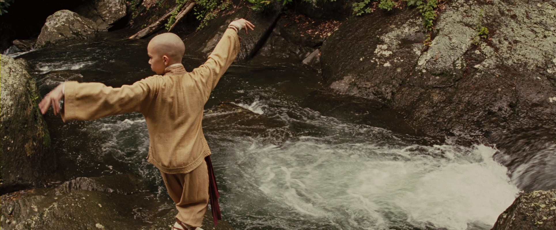 This is actually a climax-within-a-climax, for the battle has been raging for some time, with many tumultuous events. Its five-minute crest, however, is set apart with its calm, rigorous formal restraint that emphasises not brute force and domination, but the effortlessness and harmony of the Avatar’s powers. The Last Airbender turns into a silent movie here, the monochrome colours reminiscent of black-and-white cinematography, or a tinted silent film. Its dignified, delicate grandeur and lyricism is seductive but also awakens emotion, because the film is succeeding, like Aang, in finding its purpose. The musical score, camera motion, character movement, production design and surroundings act in unison to create an aesthetically alluring, atmospheric piece of art.