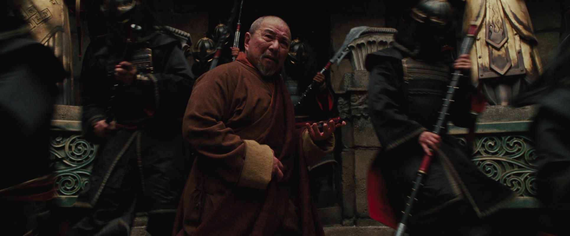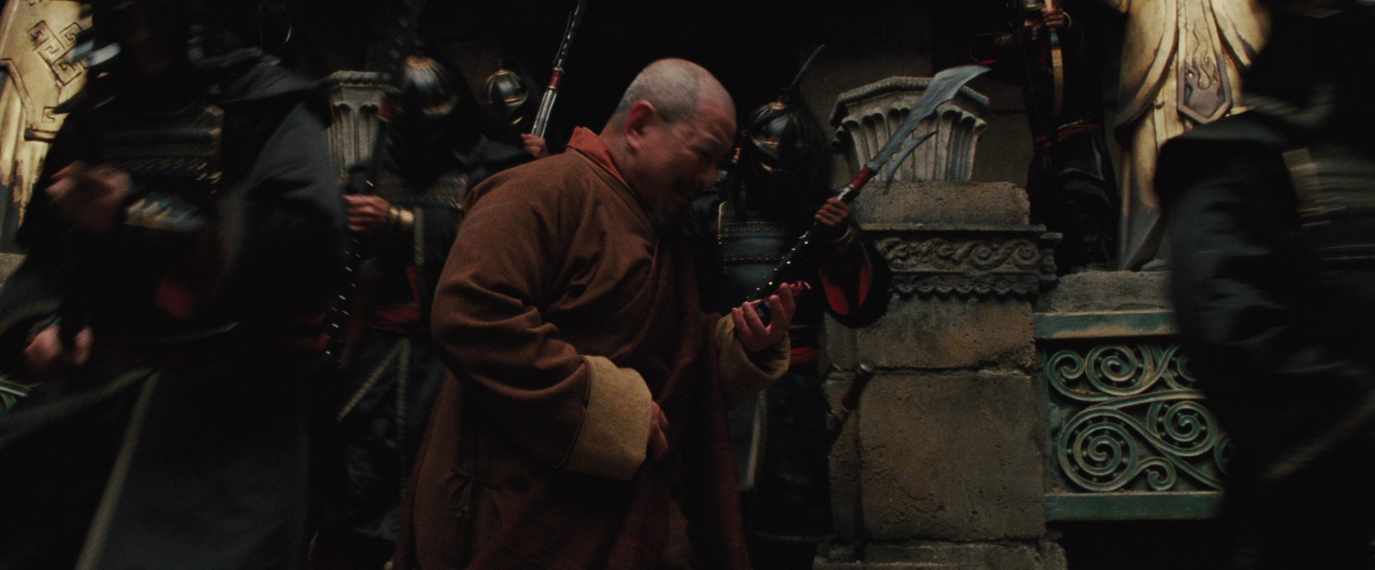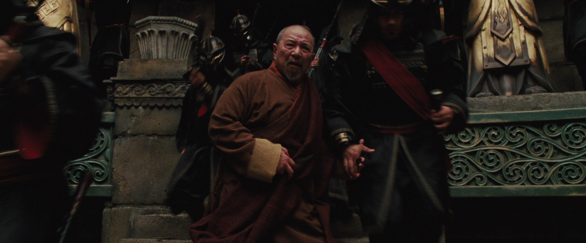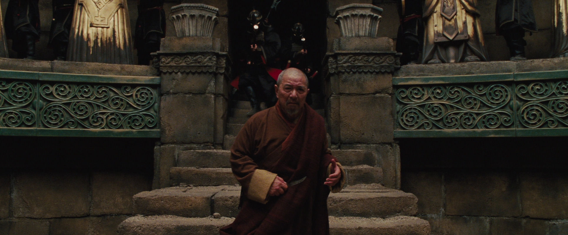 The shot reflects the monk’s conflicted emotions in multiple ways. He and the soldiers are moving in opposite directions. He is splitting their rank into two lines. The torrent of their entrance indicates the unstoppable flow of events he has set in motion. His walking backwards reflects his shameful unease. He holds out his hand for his “thirty pieces of silver” and one soldier deposits a small bag in it. Until now he has been unable to tear his gaze away from Aang, as if punishing himself, but now he looks down at the money, back at Aang, and down at the bag again with disgust. The shot (and the scene) ends with the monk disappearing up the stairs, his figure and stature diminished.