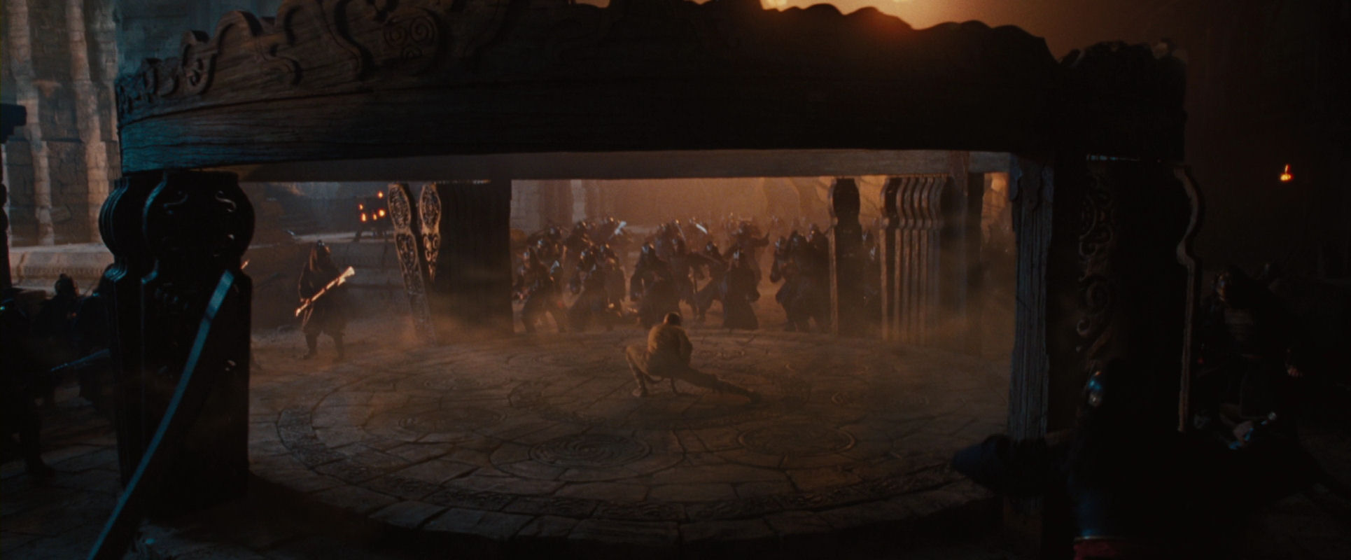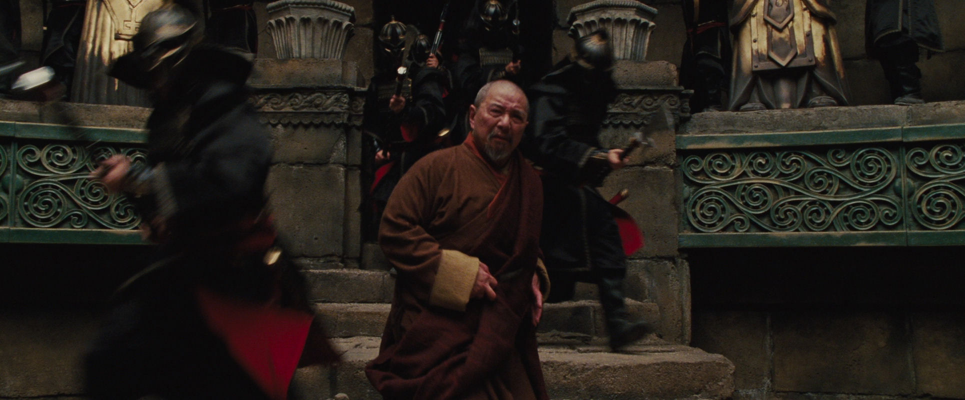 Now come several brief shots revealing that Fire Nation soldiers have been hiding behind the statues, of which this is the most interesting, the action nicely framed by two soldiers.