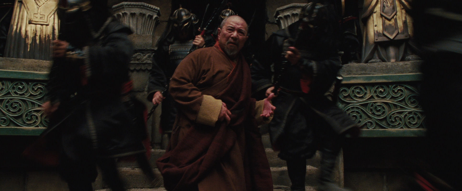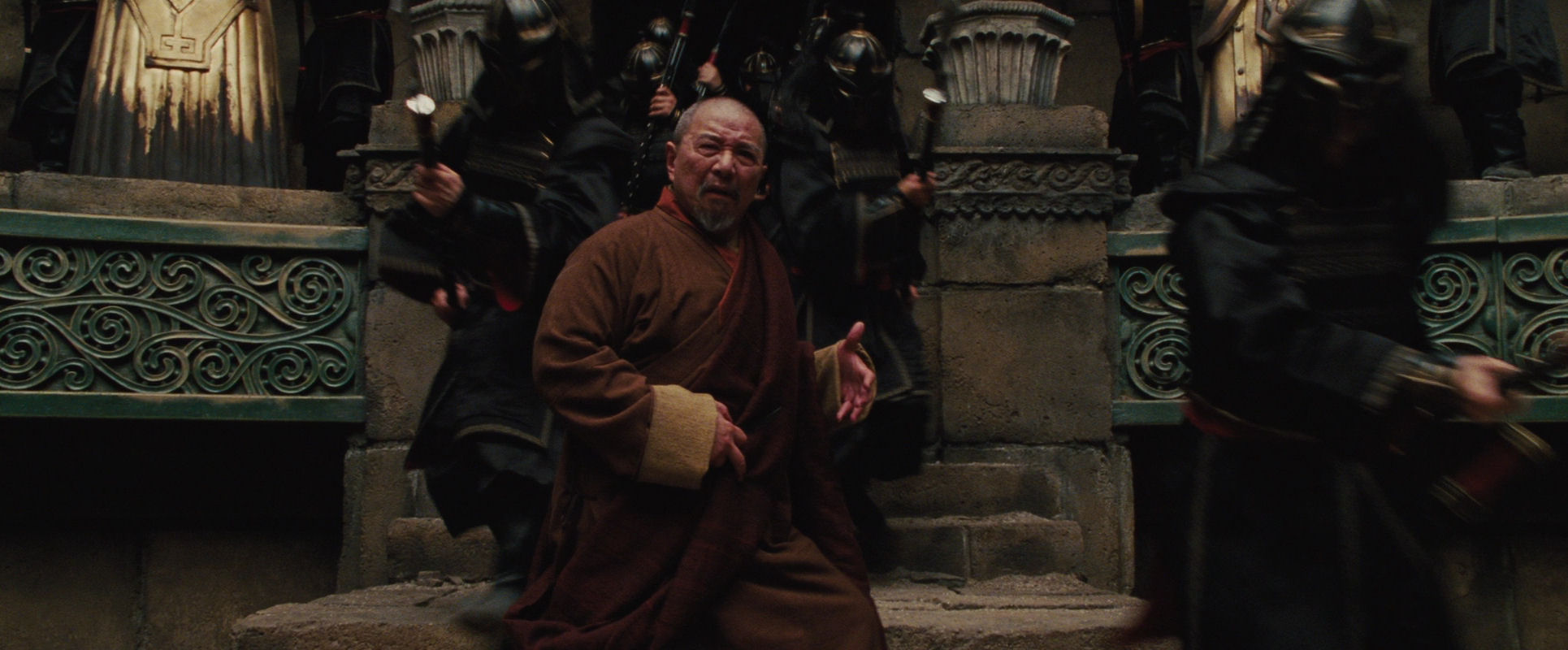 The scene ends with another very nice shot, depicted in the slide show below, where the staging is full of meaning underpinning the scene’s uppermost narrative layer. The monk has asked Aang’s forgiveness: “I have lived in poverty because of your absence, Avatar. So you will understand my actions today.” Still he is racked by guilt and self-disgust. He is backing out and up a staircase, as a phalanx of soldiers are pouring into the chamber, down the same steps.