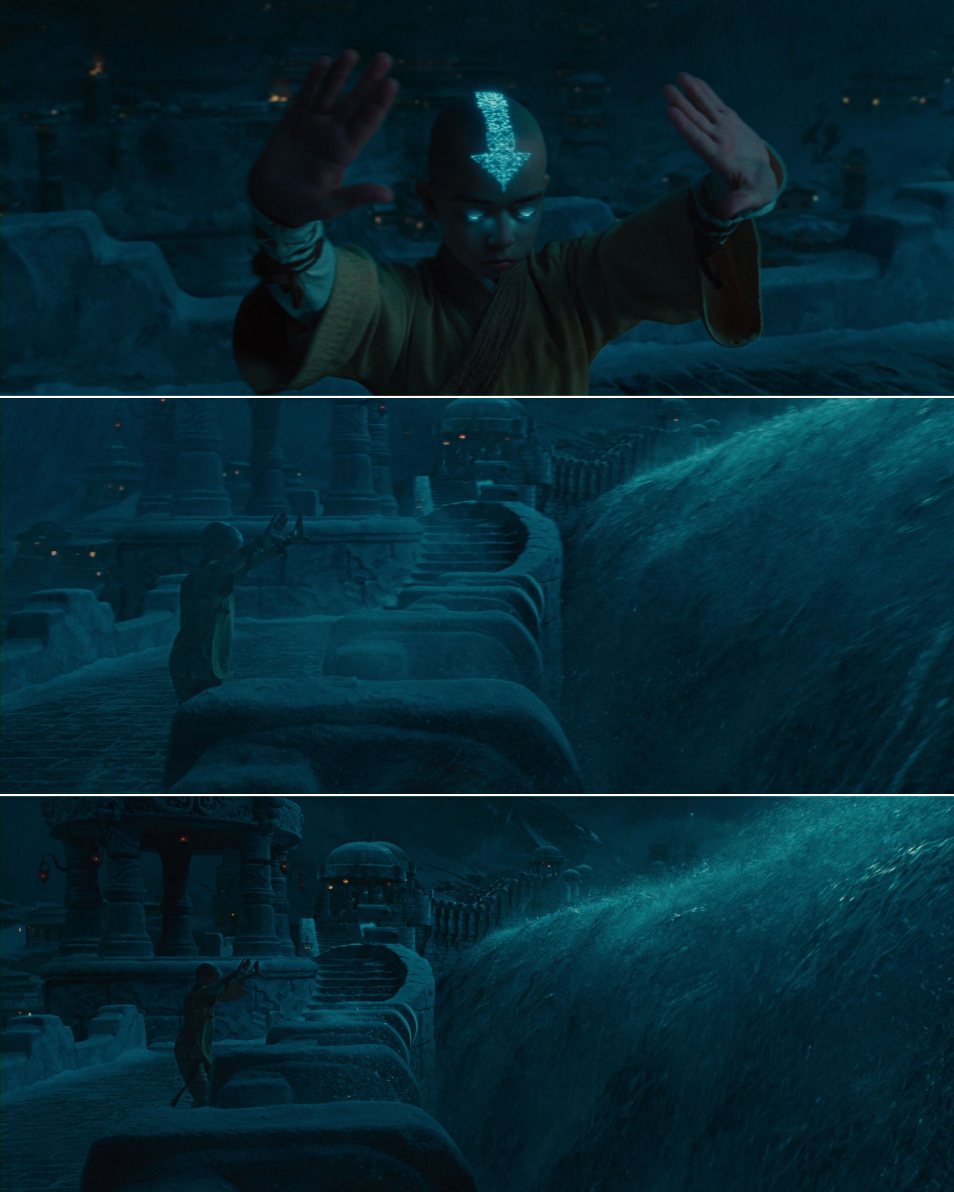 …and swoops exhilaratingly in on Aang, as if he is pulling it in with his hands, controlling the camera as well as the water…