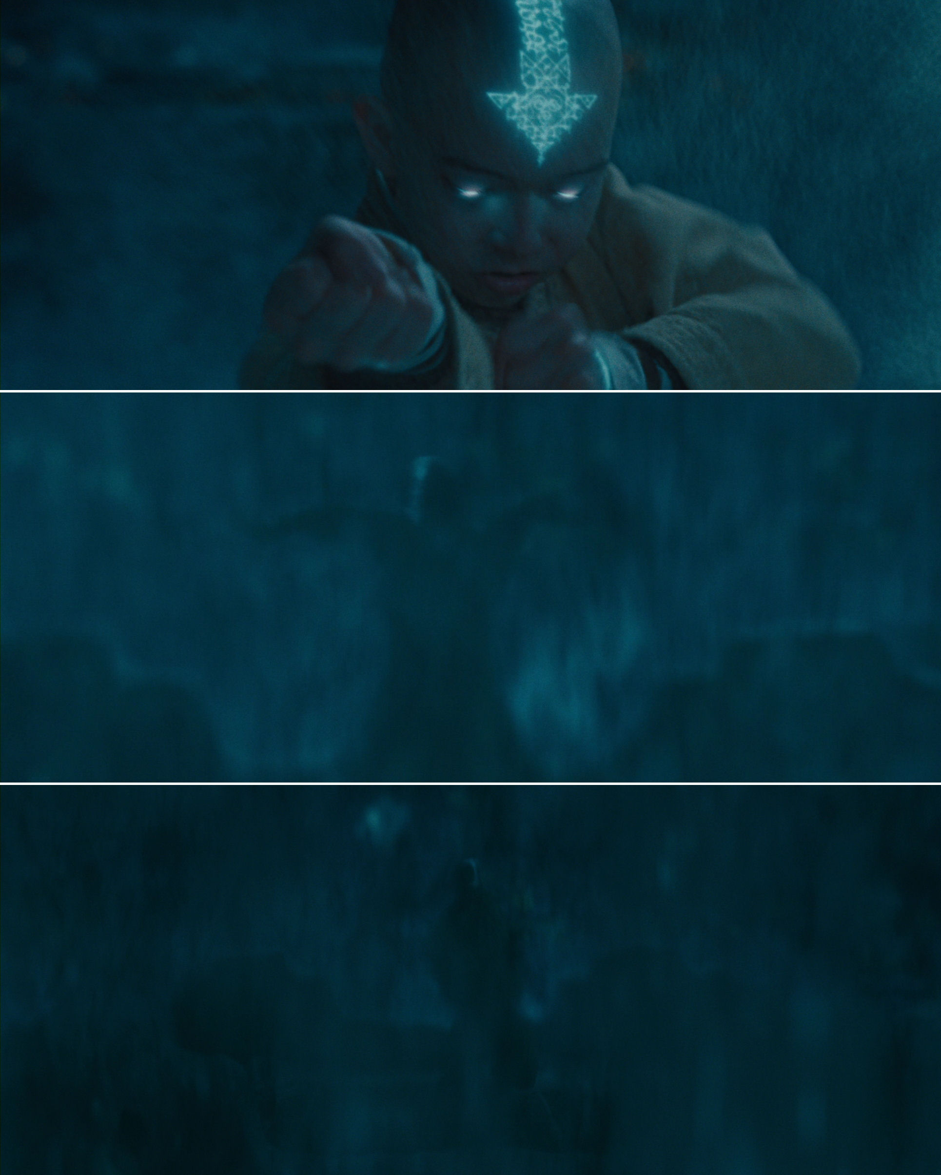 …to record this moment (while his hands still seem to lift the camera). So far Aang has been warming up. The glow of the eyes and tattoos signifies that he is now turning on full power…