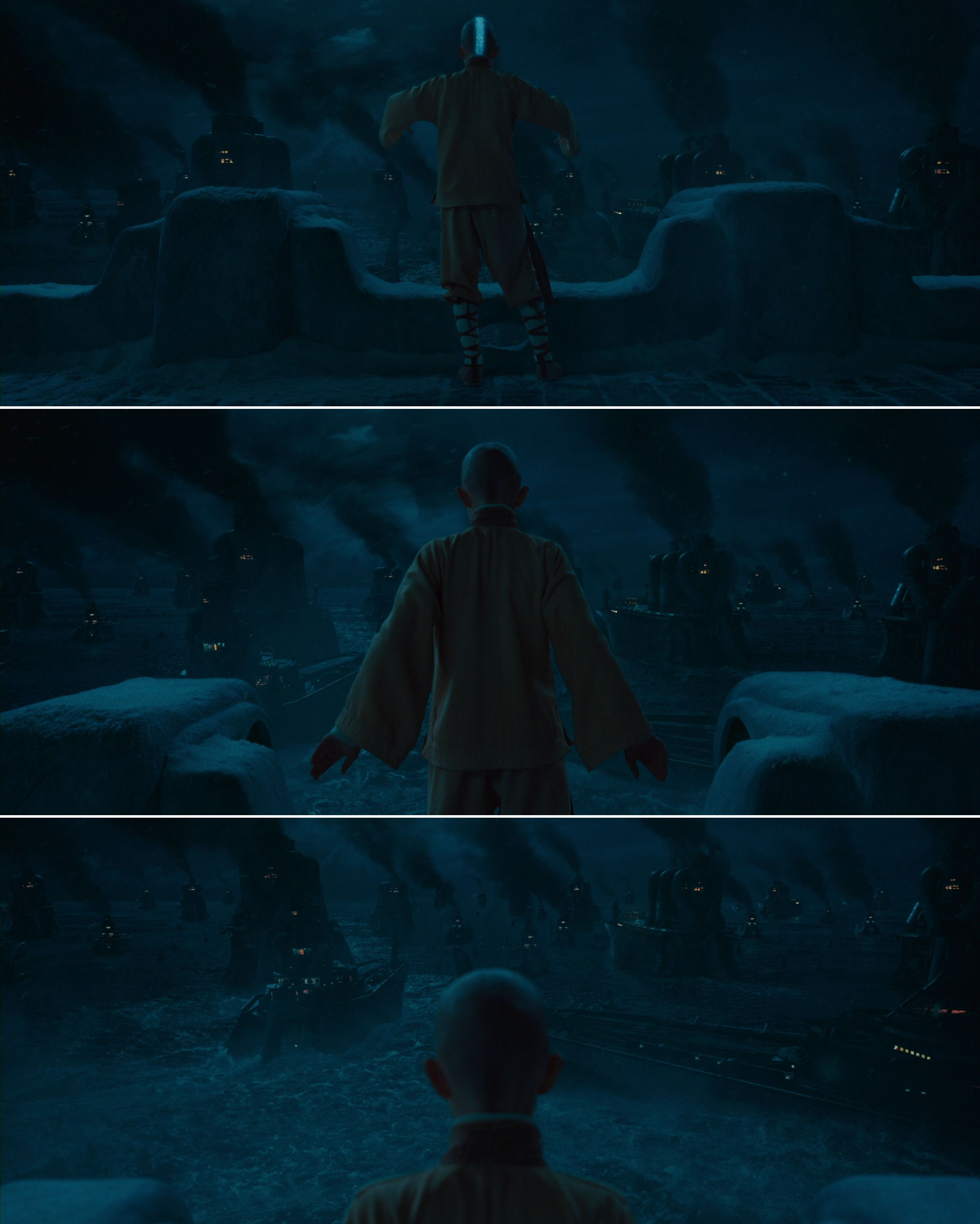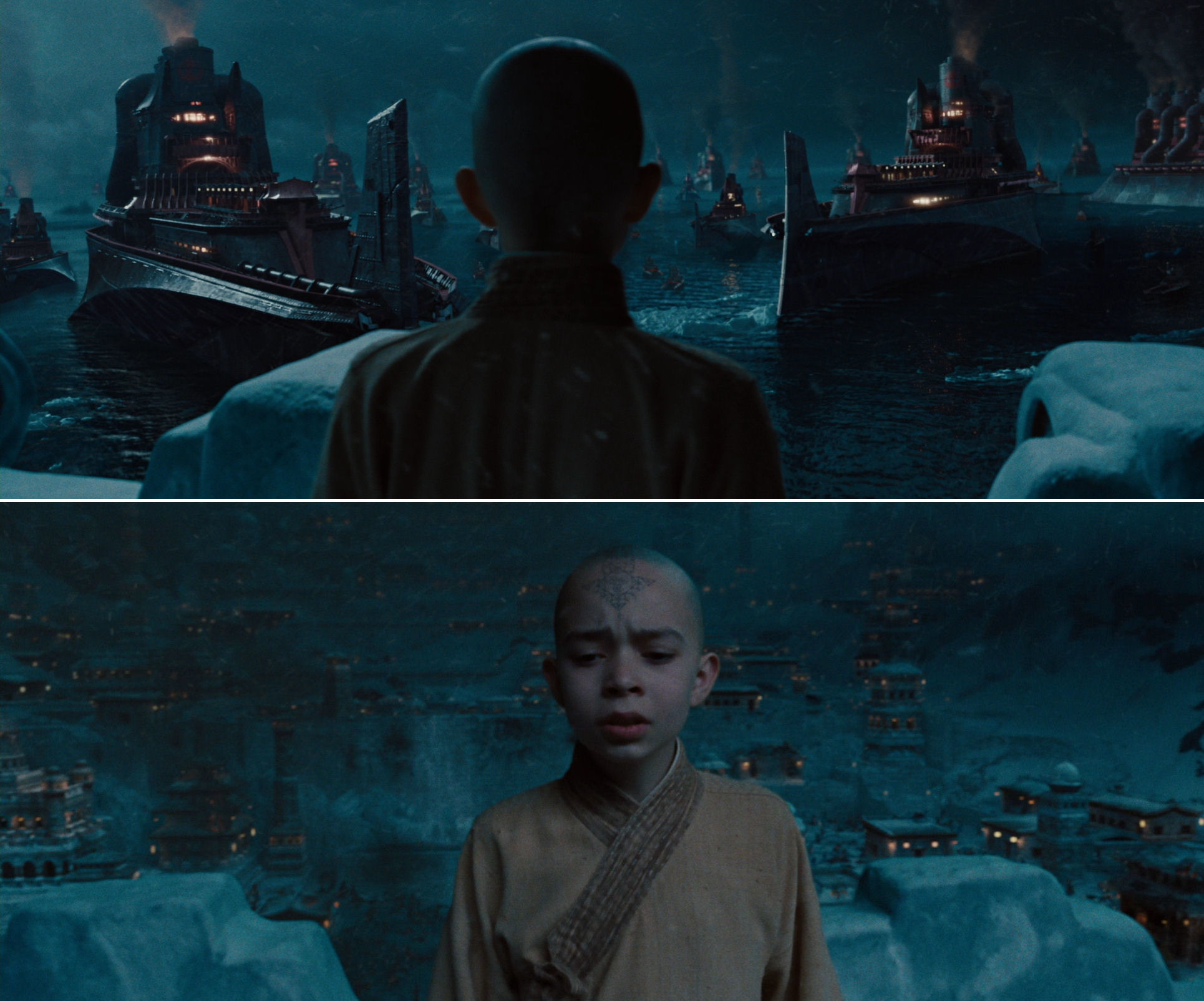 This slide show shows a tiny touch that speaks volumes about Shyamalan’s attention to detail. Aang has been abducted by Zuko and his raiding party, and the water tribespeople are shot through the distorting field of a fire hidden in the foreground, as a cohesive device of continuity with, and a harbinger of, the next shot…