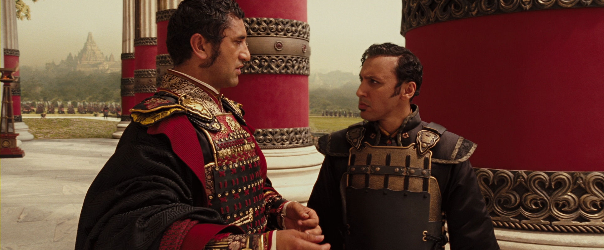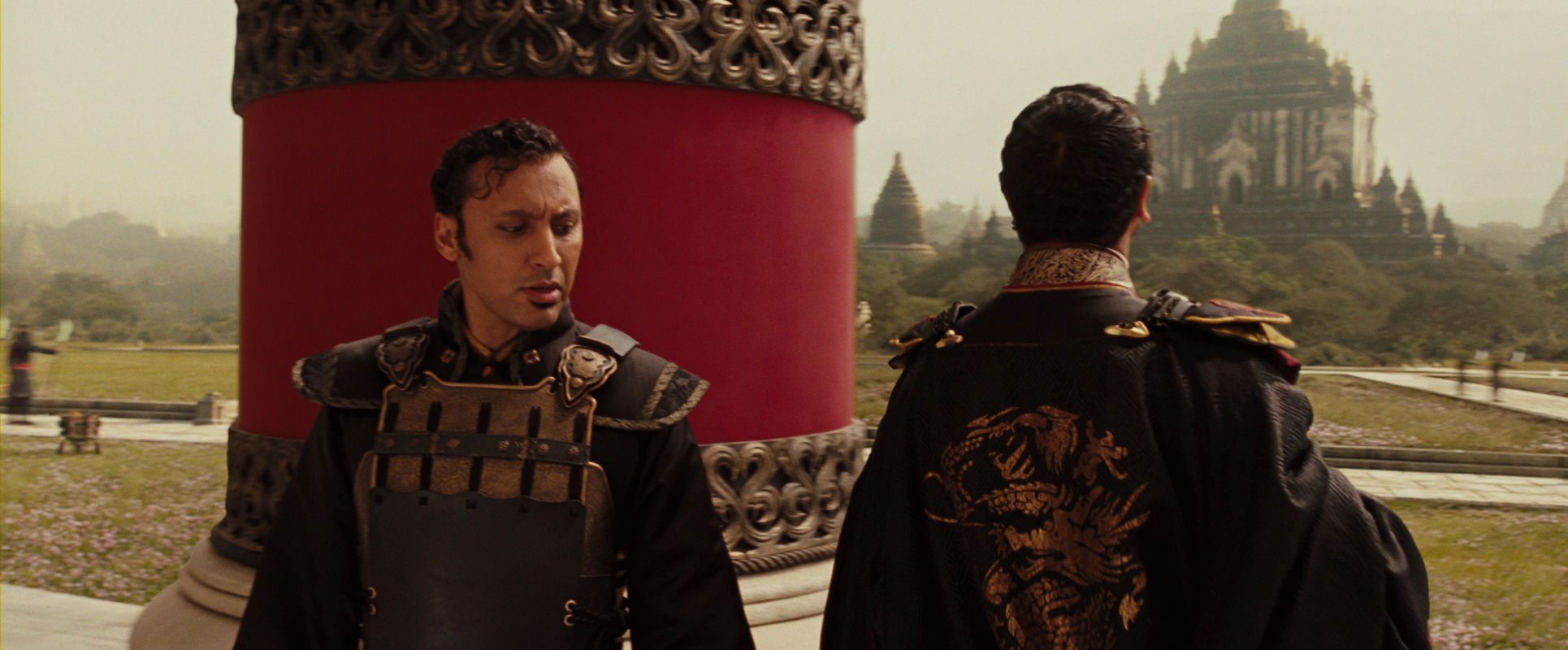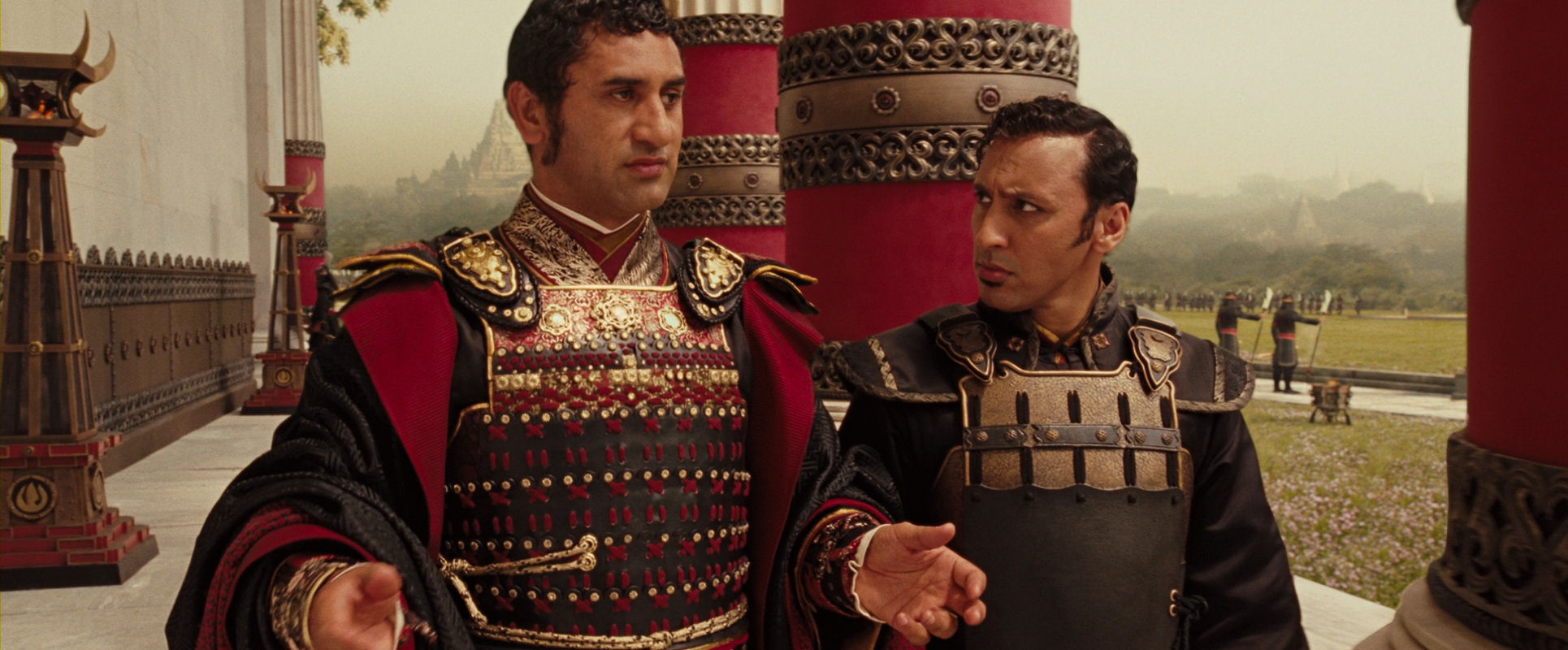Commander Zhao (left) and Lord Ozai of the Fire Nation. As they walk towards the camera, which moves to keep the distance, Zhao is briefing Ozai about the situation…
