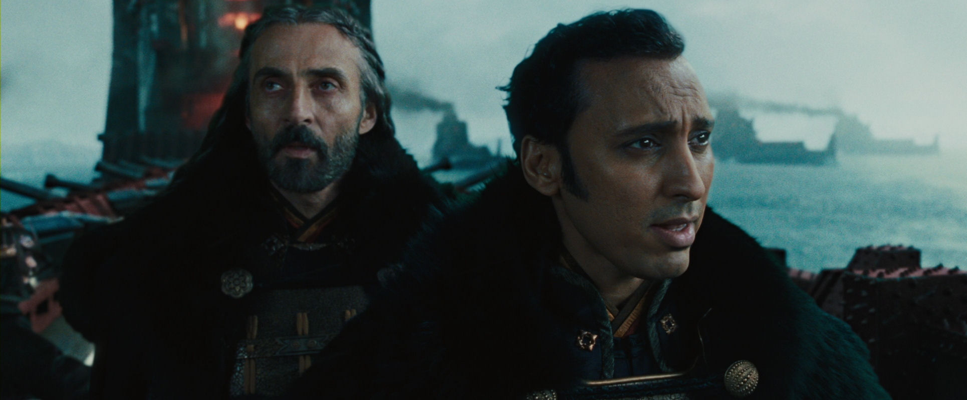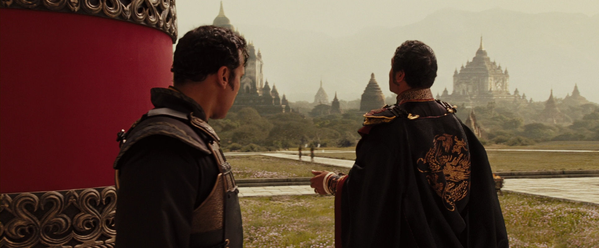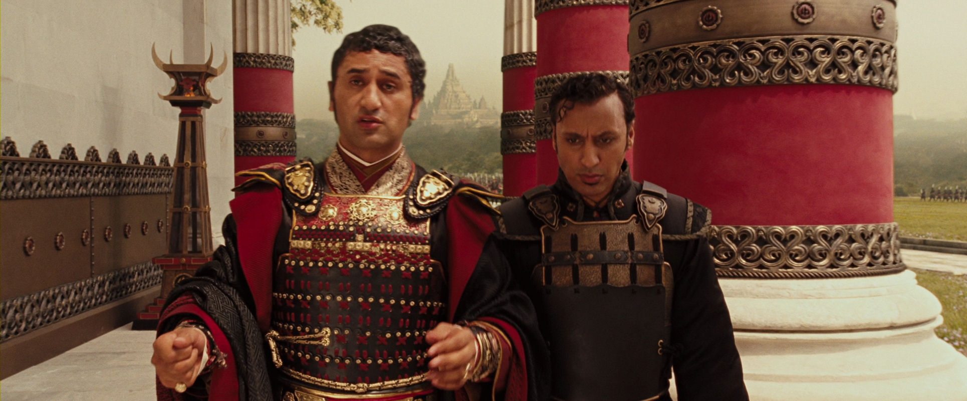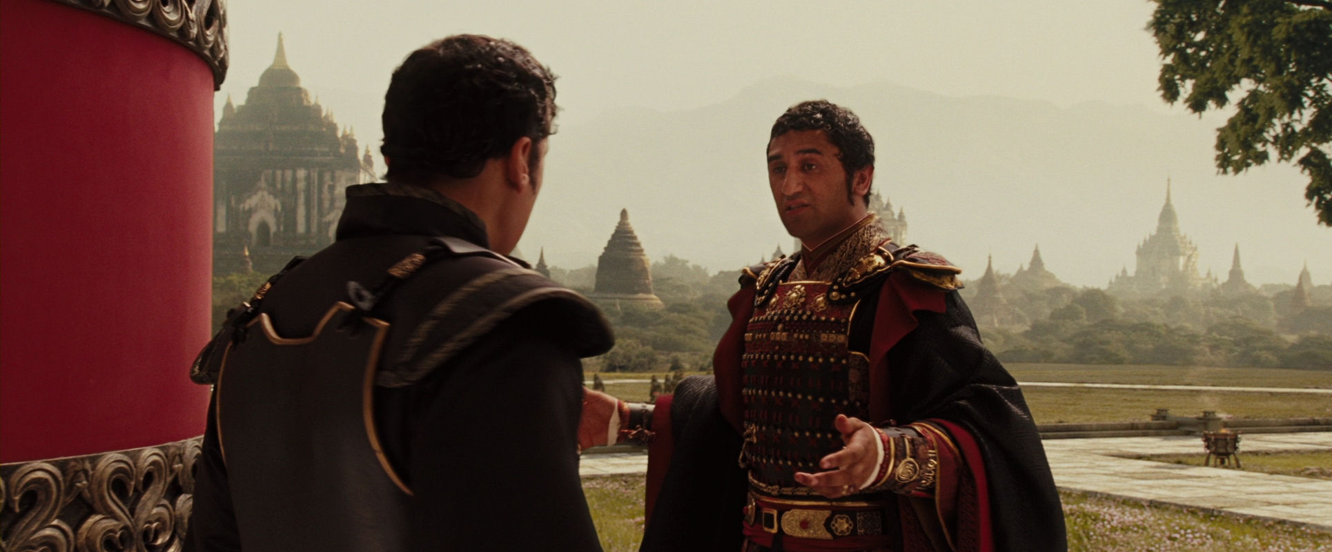 Commander Zhao (left) and Lord Ozai of the Fire Nation. As they walk towards the camera, which moves to keep the distance, Zhao is briefing Ozai about the situation…
