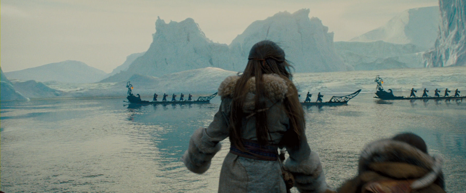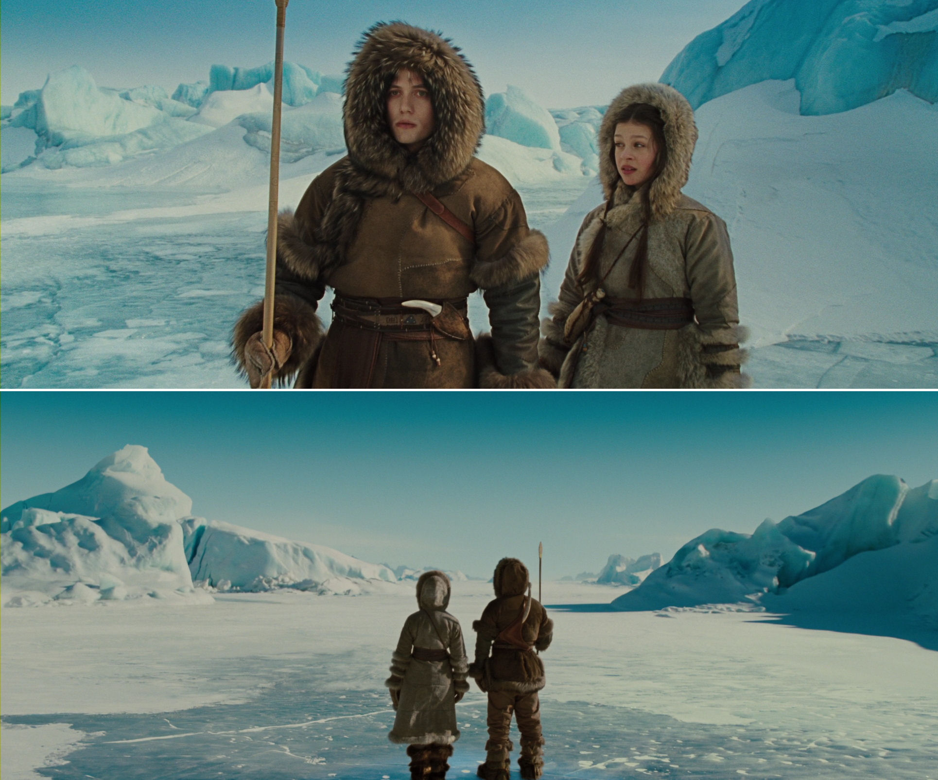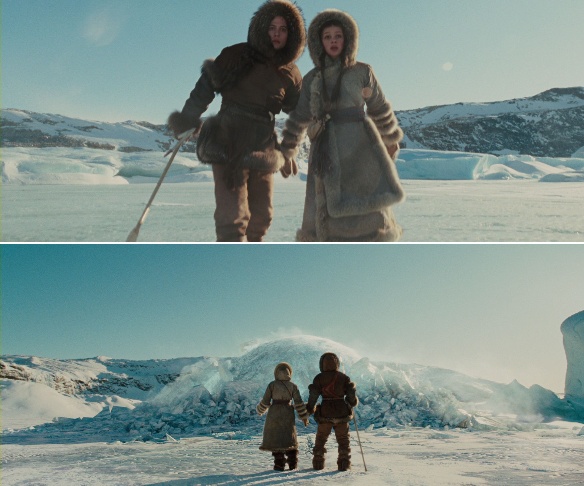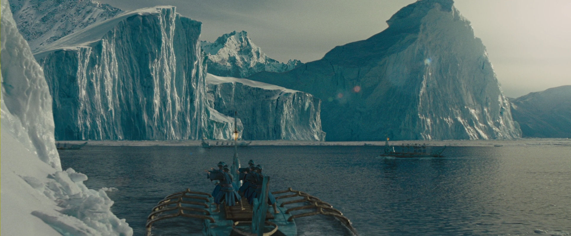 The opening sequence, including the discovery of Aang inside the globe of ice, is (without being brilliant) a very well-made piece of film, always interesting to look at however many times the film is watched. It has a nice mixed approach of immersing us in the characters’ point-of-view and a more objectively observing position, with fine use of crane and overhead shots, and the almost featureless surroundings.