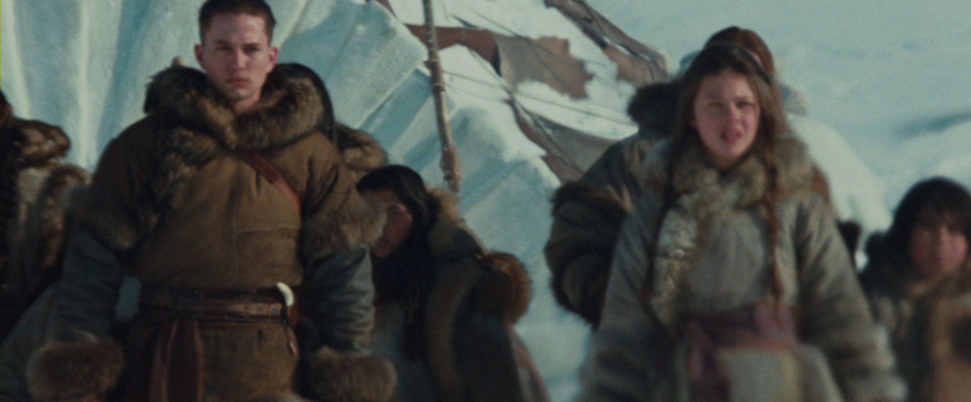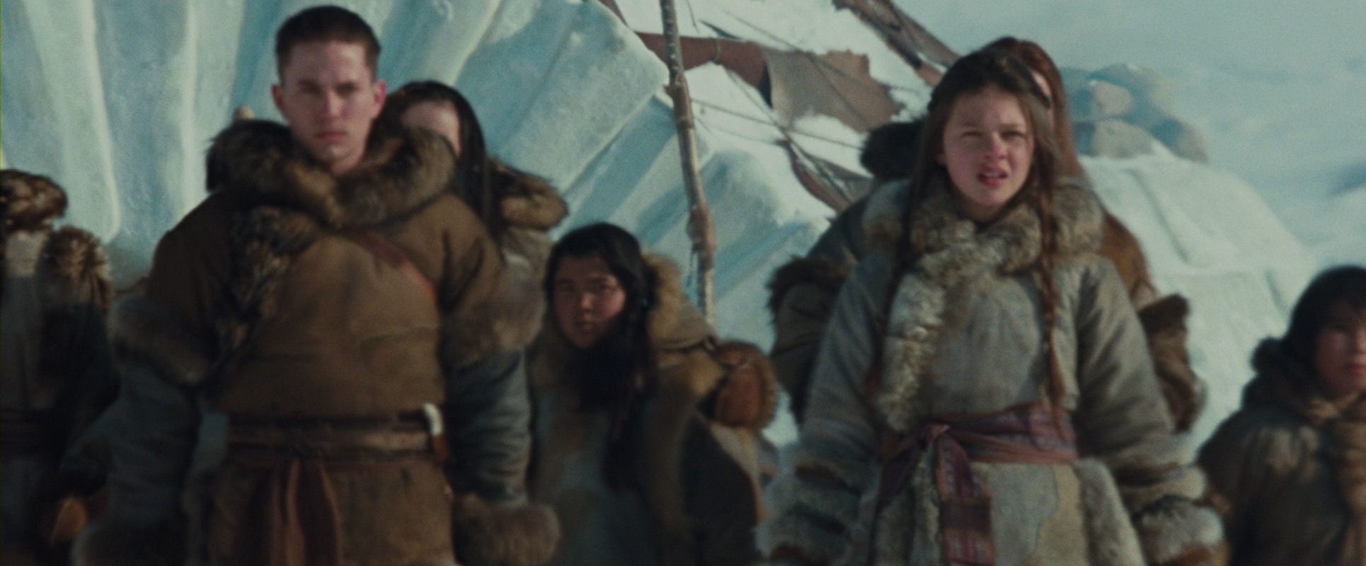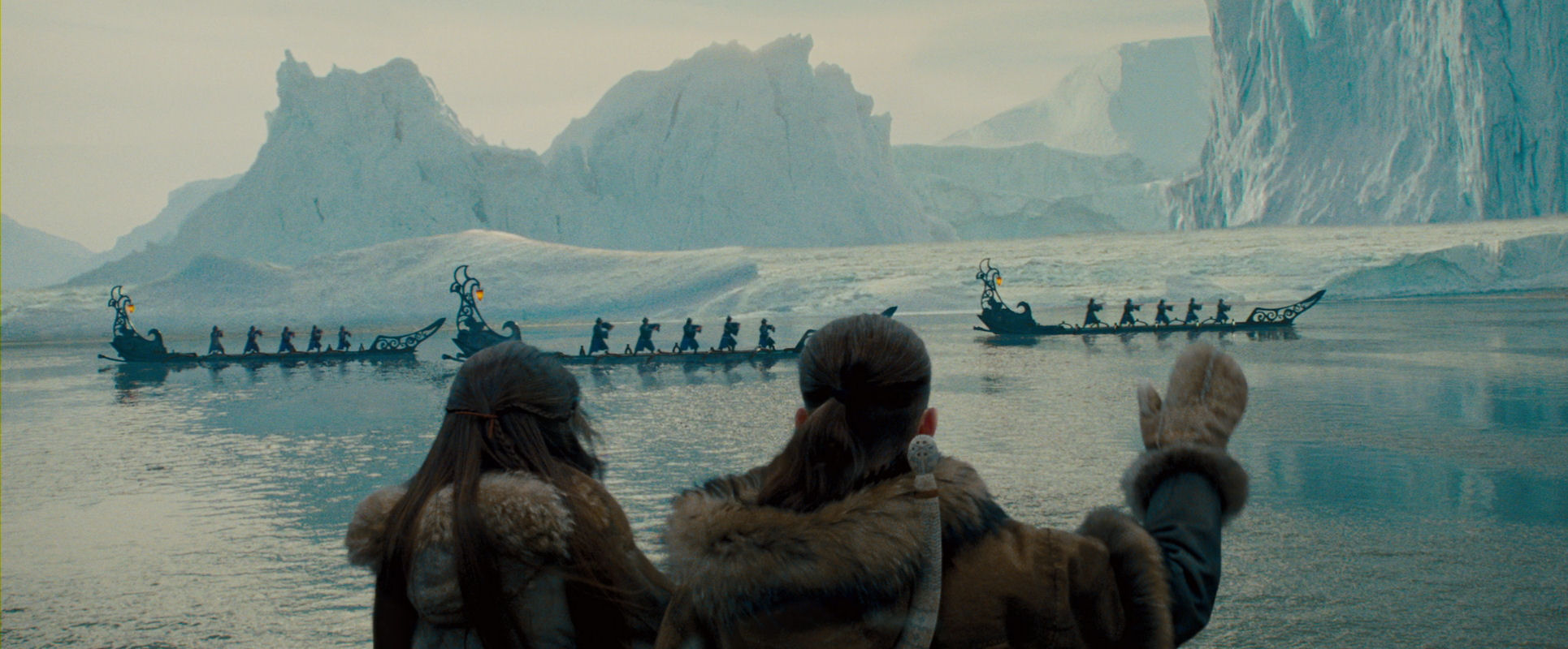 The opening sequence, including the discovery of Aang inside the globe of ice, is (without being brilliant) a very well-made piece of film, always interesting to look at however many times the film is watched. It has a nice mixed approach of immersing us in the characters’ point-of-view and a more objectively observing position, with fine use of crane and overhead shots, and the almost featureless surroundings.