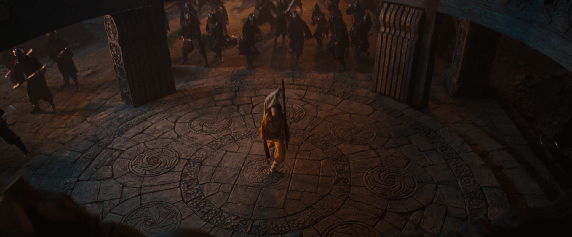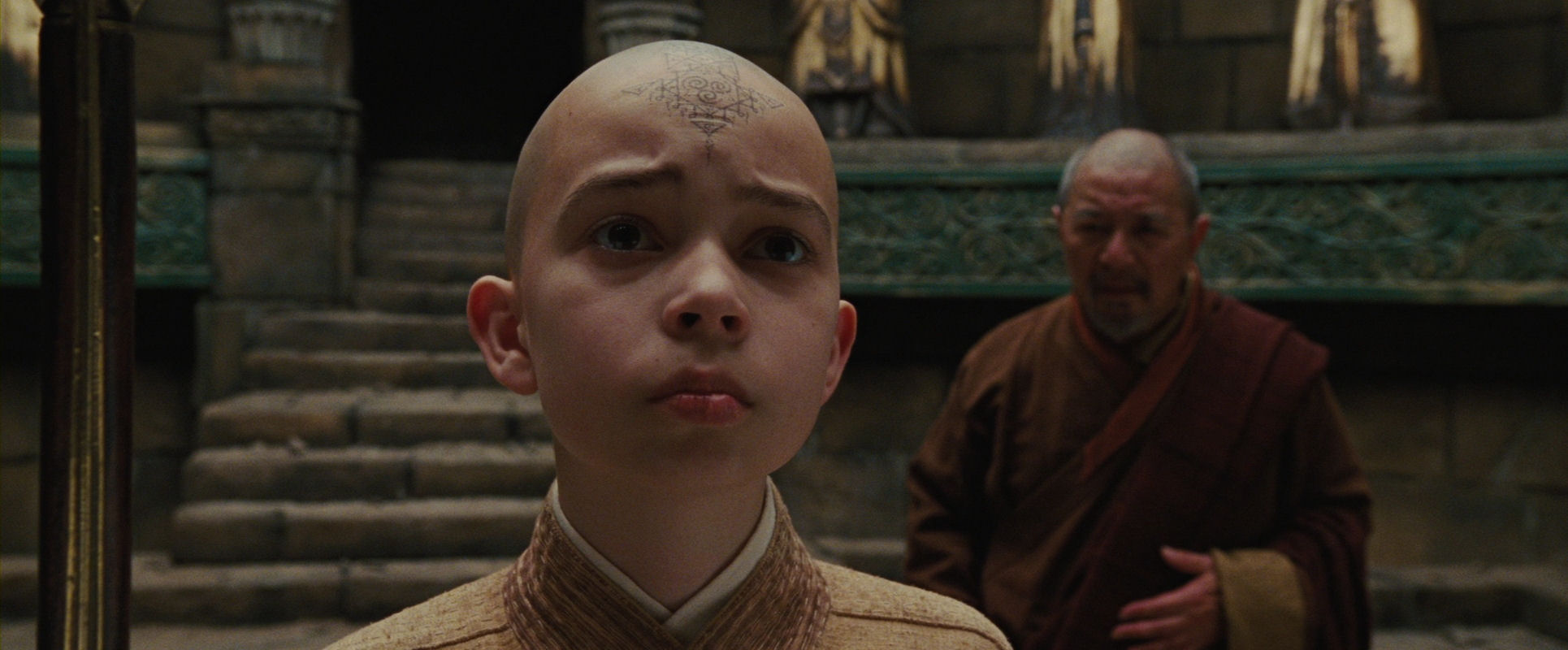 The circular movement scenes are of course also an aspect of staging. But there are many more occurrences of elegant mise-en-scène in The Last Airbender. In the spirit of the previous chapter, let us start with circle-related stuff. Before Aang was imprisoned in the dungeon, he was captured by the Fire Nation in the chamber of statues scene. In Shyamalan’s films the camera is not something that is merely pointed at the action to record it, it is a living, sensitive, intelligent entity, breathing together with the film, smoothly repositioning itself and the framing to convey the story.