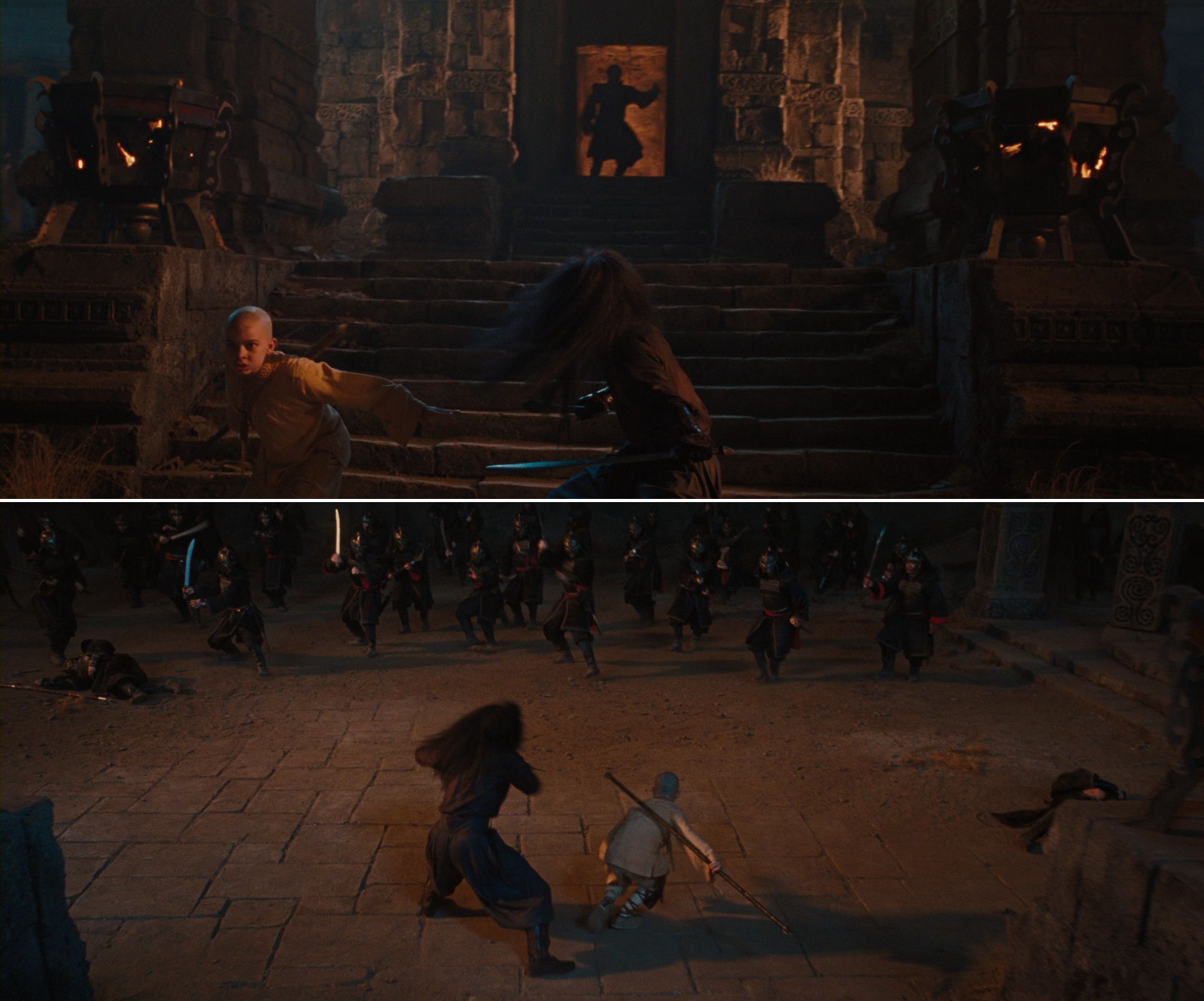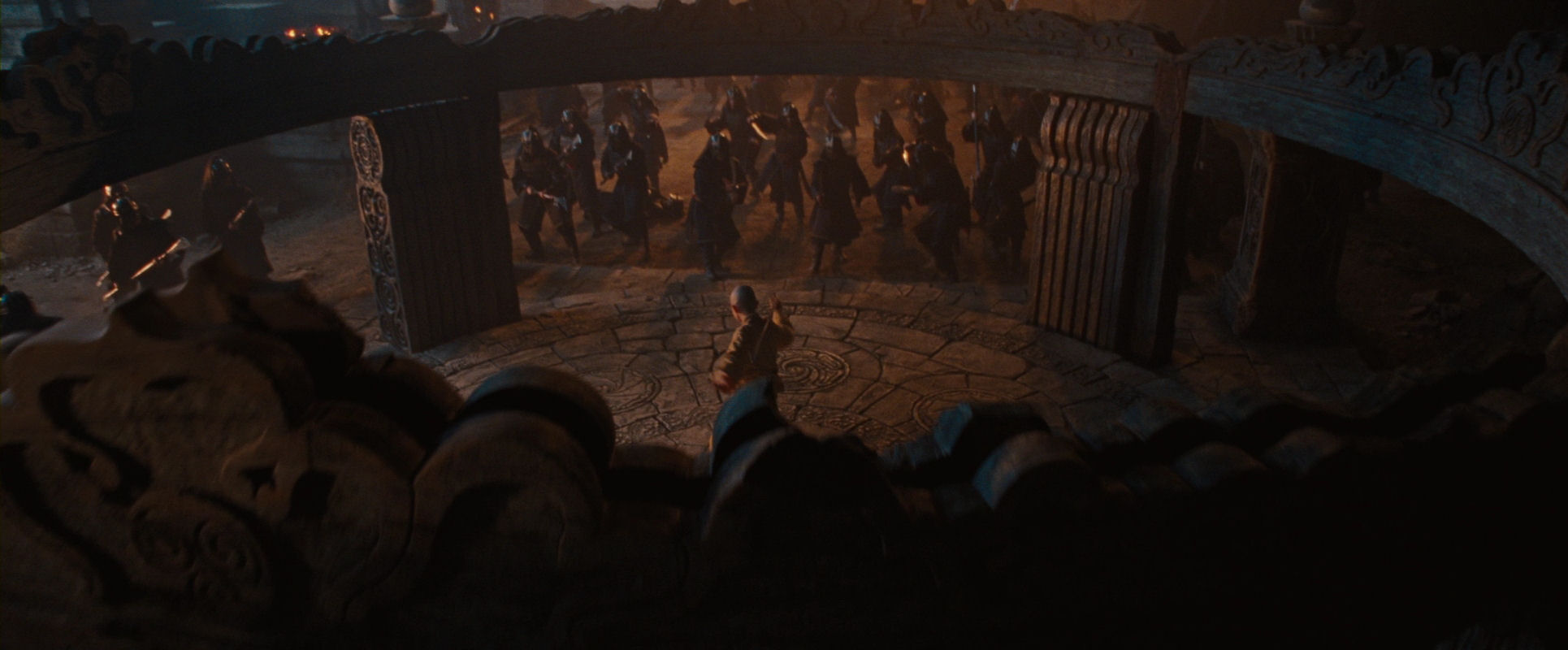 This echo seems very meaningful. Aang alone mans the parapet in the climax, compared to the phalanx of defenders before the battle. Again there is a reversal: while the camera pulls back from Aang, it is gliding forward along the line of defenders, in a revealing shot.