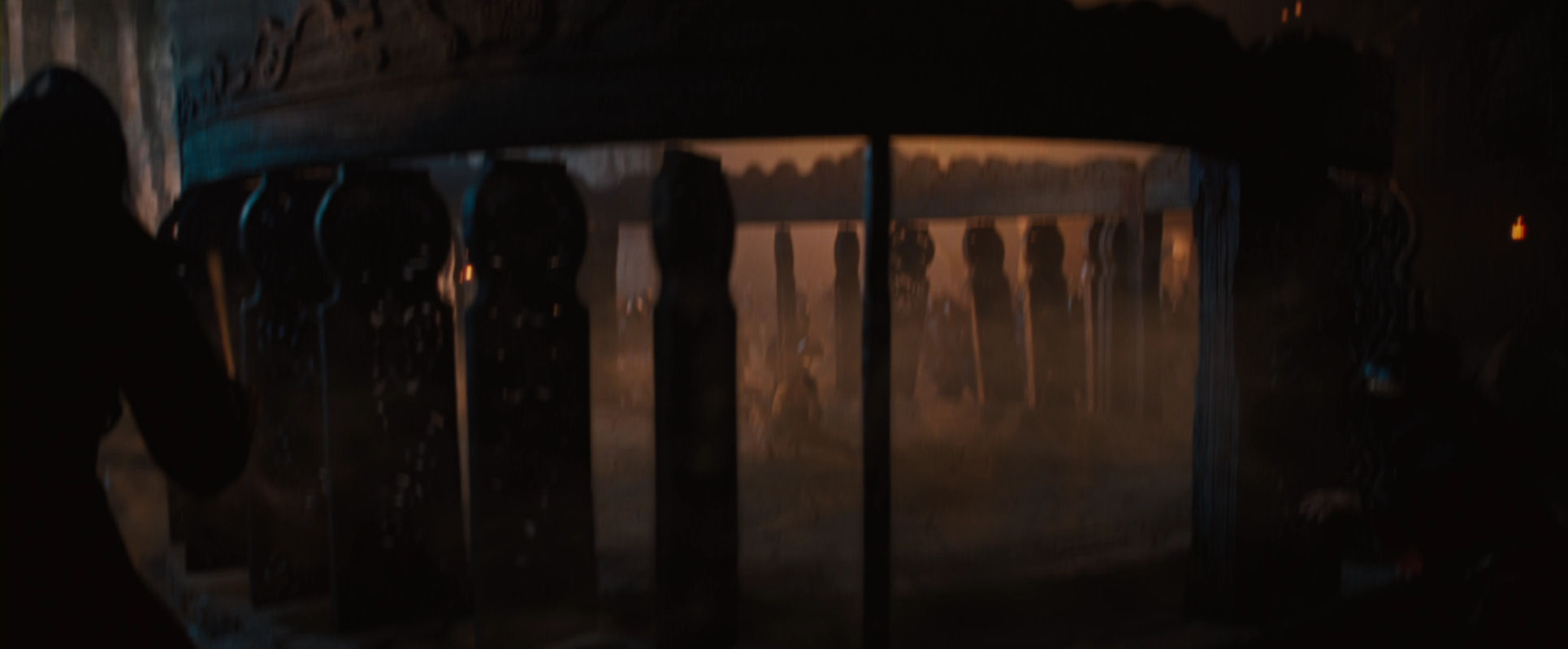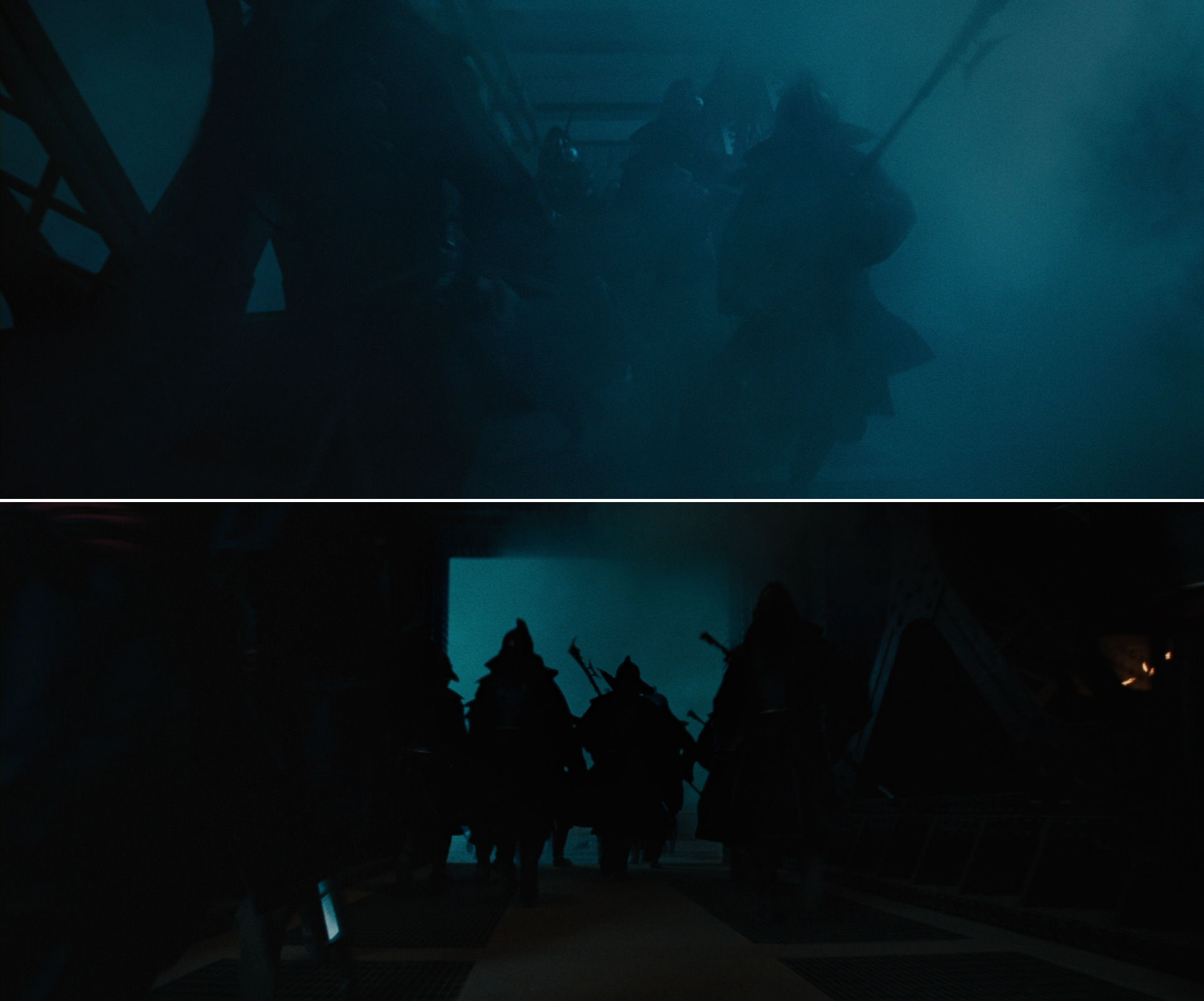 There is even a similar downward camera movement, but instead of a straight tilt there is a slanted movement in the chamber scene. Also, the urns might be seen as a pathetic downgrading of the majestic statues of the chamber.