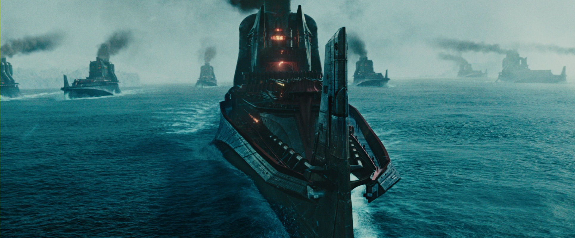 But first there is some sort of establishing shot, another of the film’s many reveals. A helicopter shot is passing by the small peninsula in the centre in order to look around it, disclosing a far away Fire Nation ship. At the same time the camera is panning from left to right…