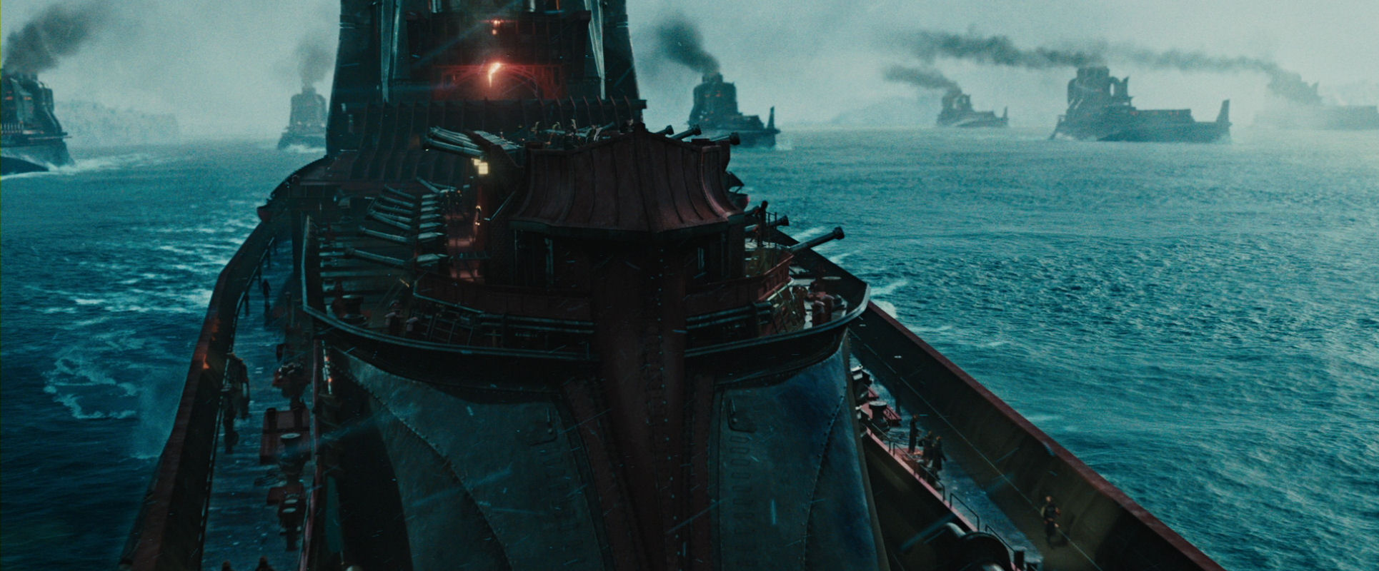 …while he is kicking the water even higher, the camera elegantly moves over the watery wall to peek down at the fleet…