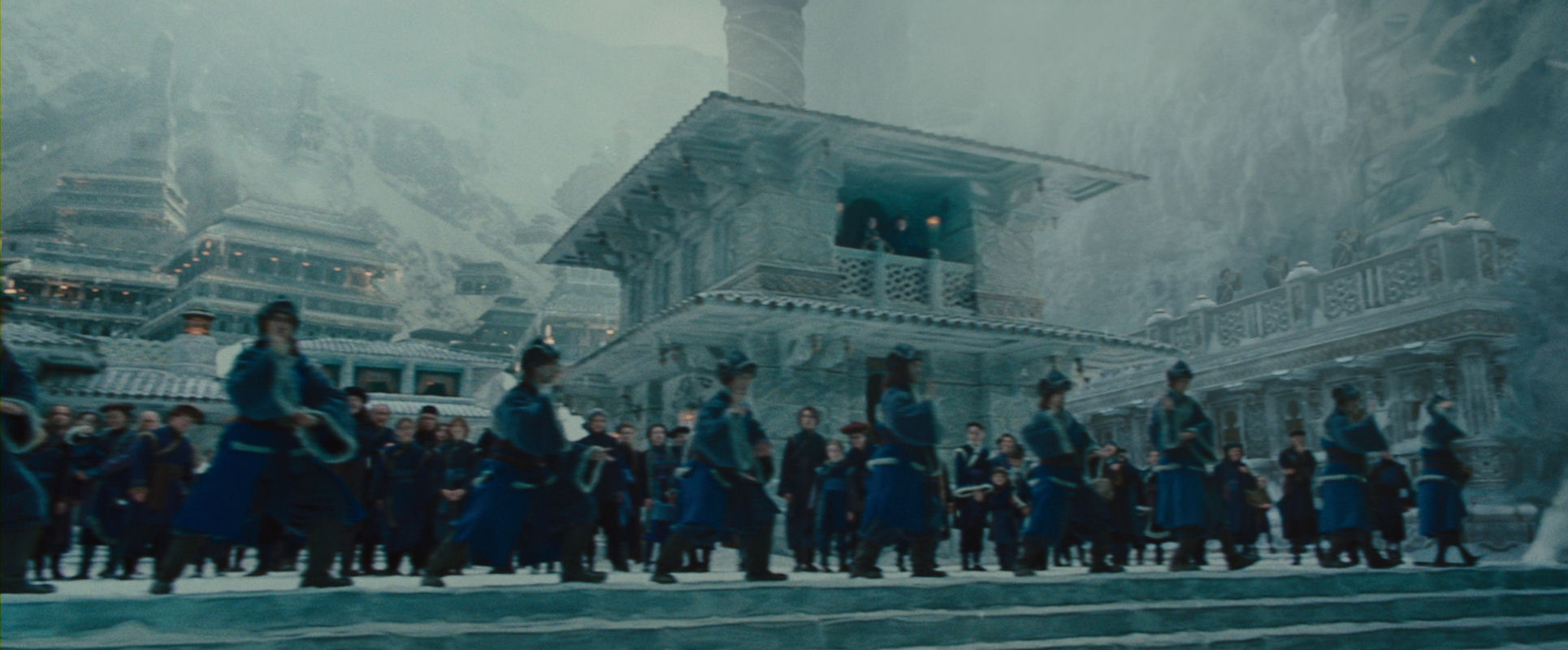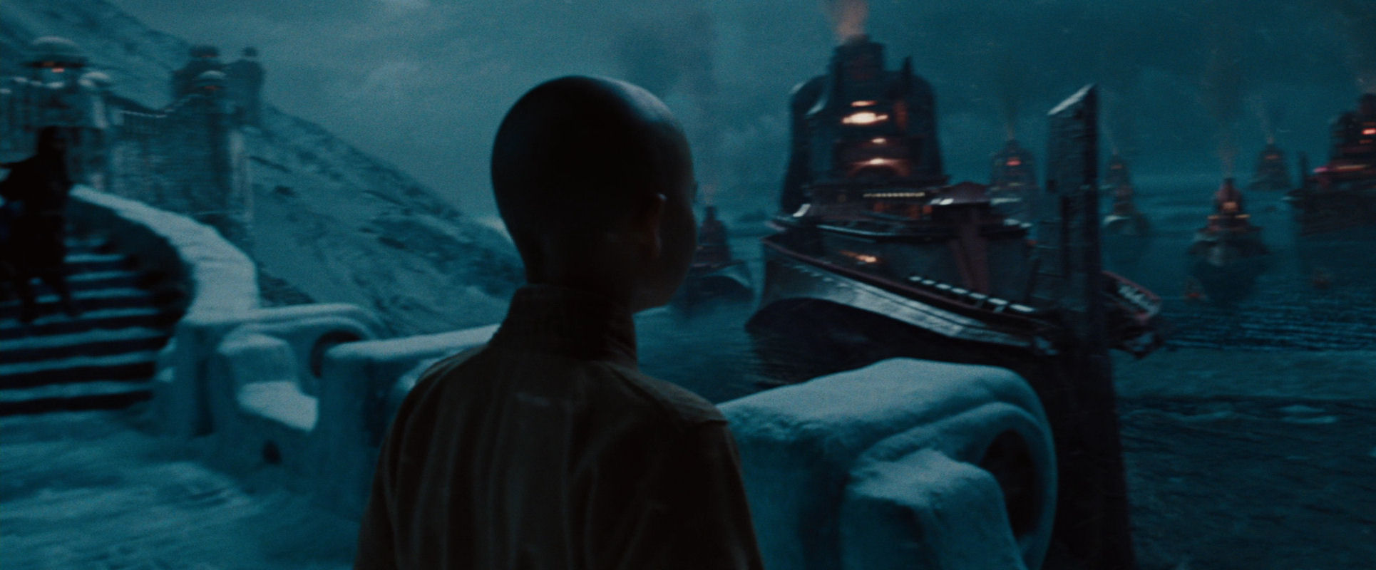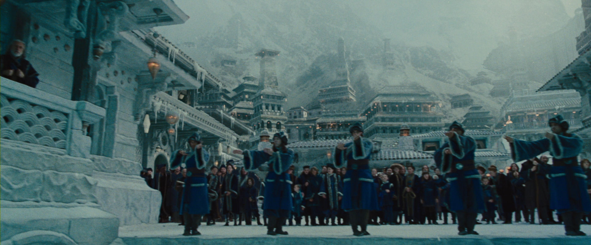 Like in the first article, you are getting an appetizer here, as I am jumping straight to the climax of the film. Even though the Moon Spirit has been revived and the defenders of the Northern Water Tribe city have regained their strength, everything is still hanging in the balance. It is up to Aang to find the inner resolve and peace required to fulfil his role as the Avatar, and to succeed in unleashing his full waterbending powers. He is hurrying up to the parapet, to face the warships of the invading Fire Nation. The following slide show unfolds that shot (please note that all slide shows can be restarted from the beginning by clicking on the current image to enlarge it and then return to the article):