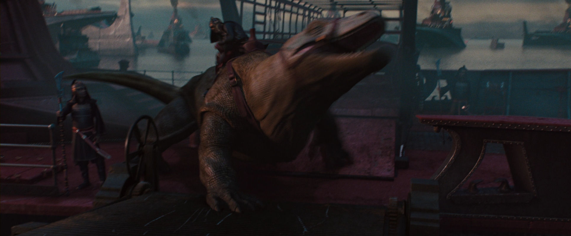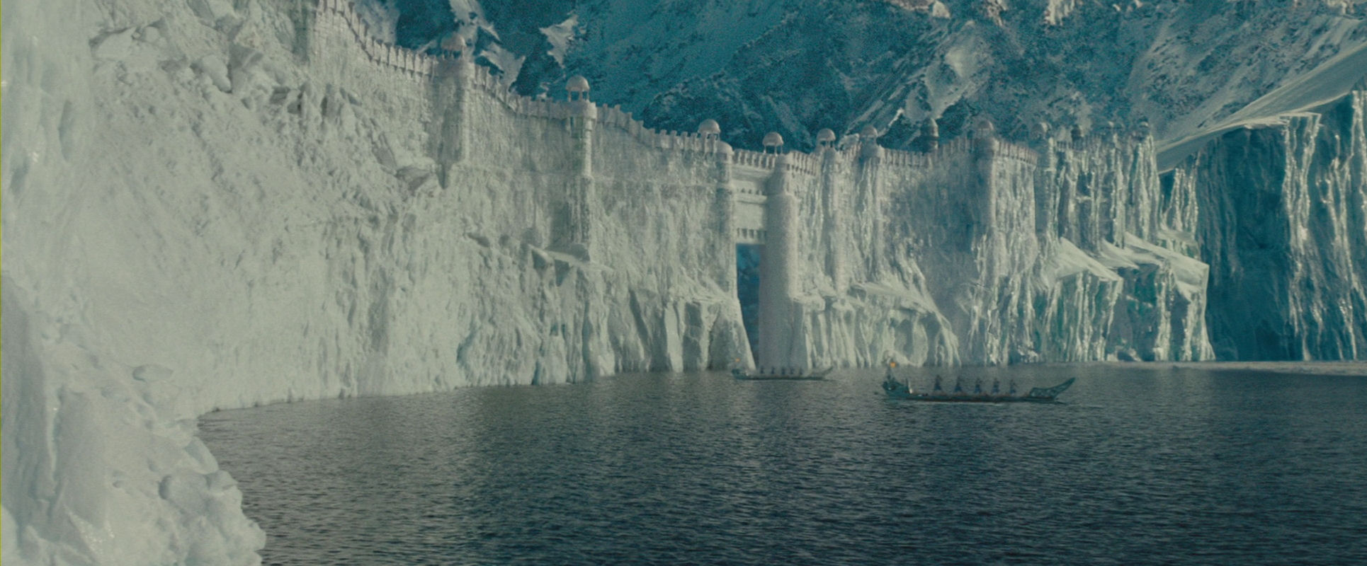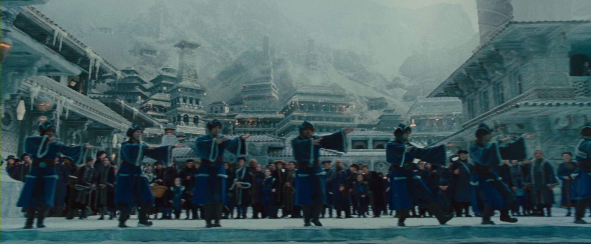 Like in the first article, you are getting an appetizer here, as I am jumping straight to the climax of the film. Even though the Moon Spirit has been revived and the defenders of the Northern Water Tribe city have regained their strength, everything is still hanging in the balance. It is up to Aang to find the inner resolve and peace required to fulfil his role as the Avatar, and to succeed in unleashing his full waterbending powers. He is hurrying up to the parapet, to face the warships of the invading Fire Nation. The following slide show unfolds that shot (please note that all slide shows can be restarted from the beginning by clicking on the current image to enlarge it and then return to the article):