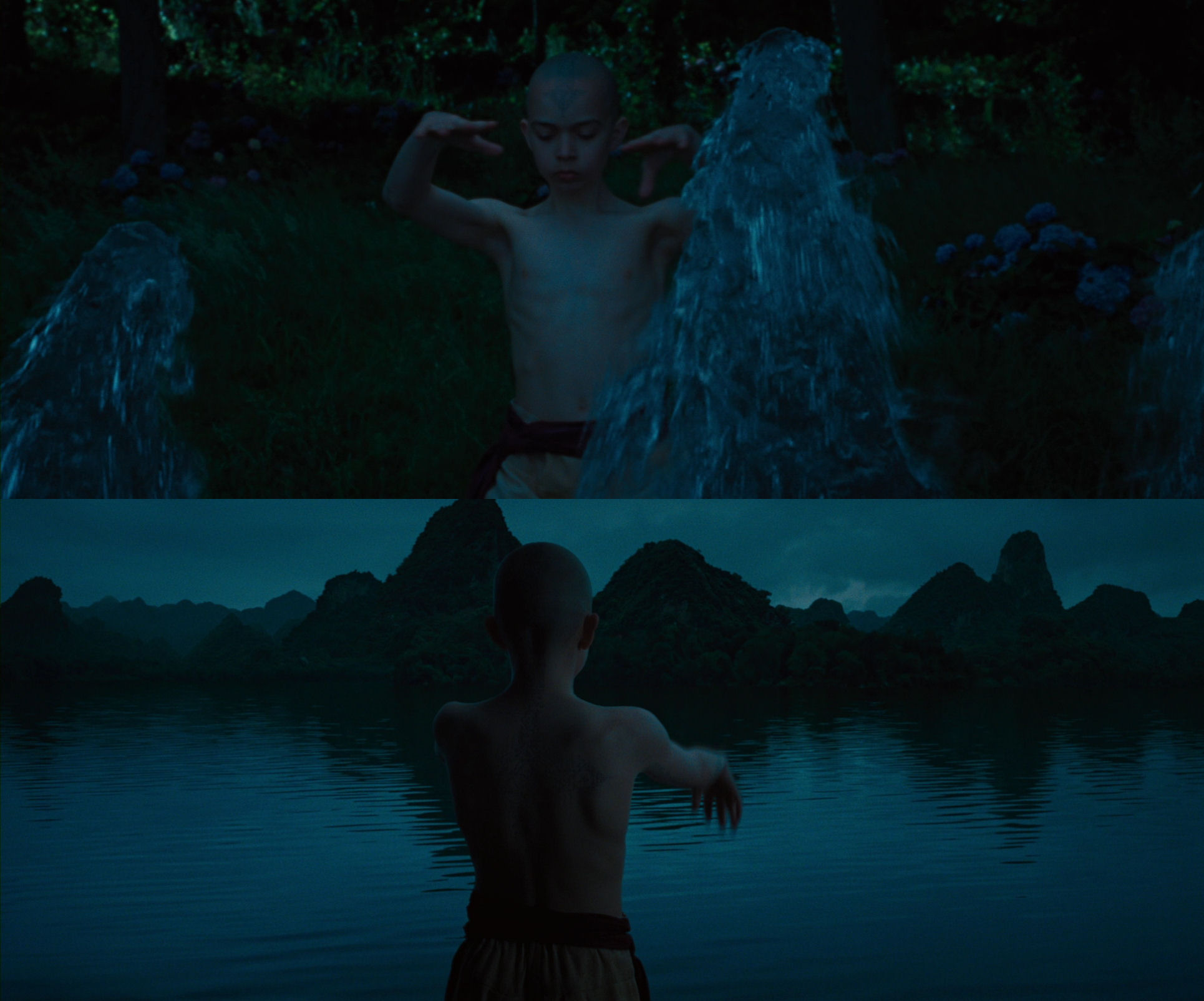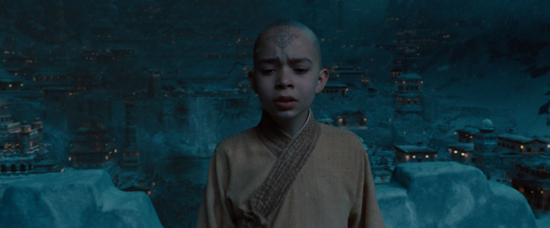…the camera in The Last Airbender just can’t stop moving, so it continues to pull out even though we can only see a faint outline of Aang. (Please recall that this almost abstract take started already here.)