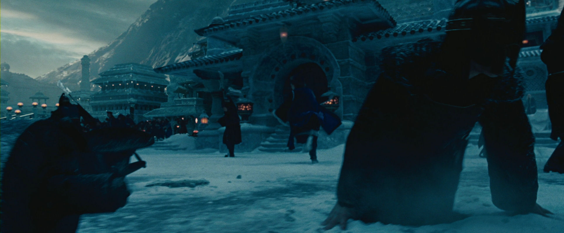 This shot is a model of clarity, however – one of the most beautiful and serene moments of the film. In a long take the camera is circling Aang and Katara as they are practising their waterbending “dance”, until they are interrupted by the “black snow” (visible in the last snapshot), a sign of the approaching Fire warships. Both camera and characters stop moving when the snow starts falling. This shot is also a prime example of the reveal motif, since the background is gradually disclosed with great lucidity.