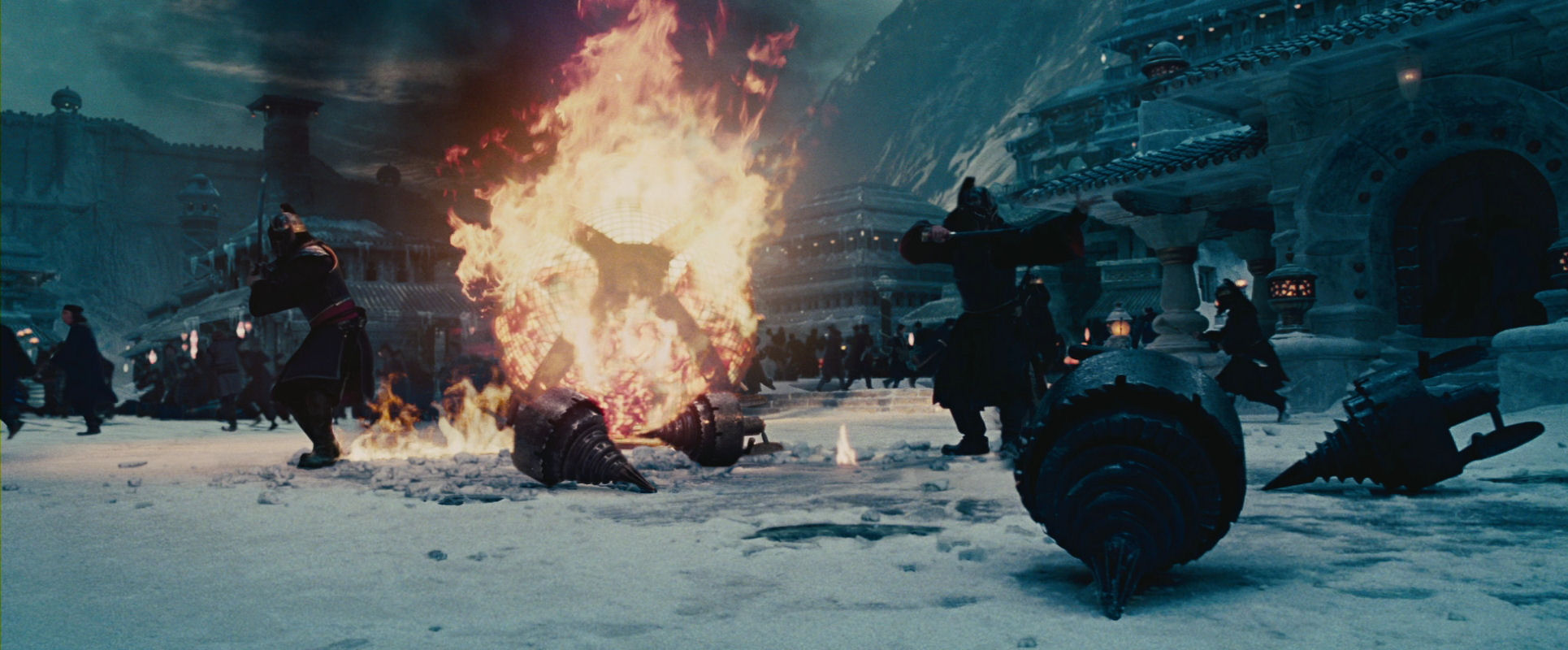 Finally, in a fight scene just before Aang storms up to the parapet to take care of the climax, rhythmical alternations between several modes of slow-motion are used to quite exhilarating effect – most memorable here, when an enemy soldier is encased in a prison of ice while Aang is somersaulting over him.