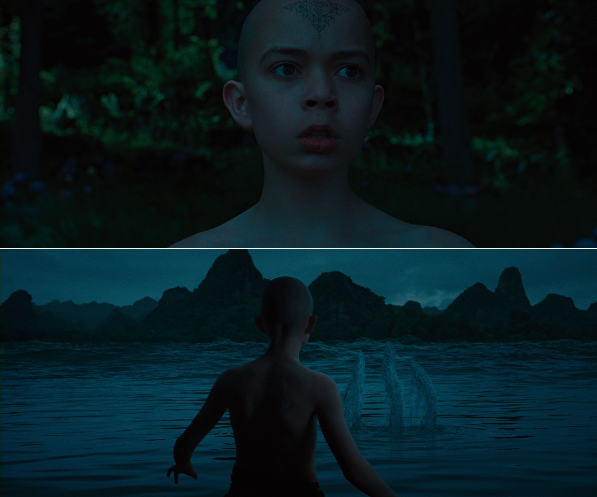 …the camera starts pulling out, taking in his head tattoo in its full glory, as Aang is pulling at and conducting the water…