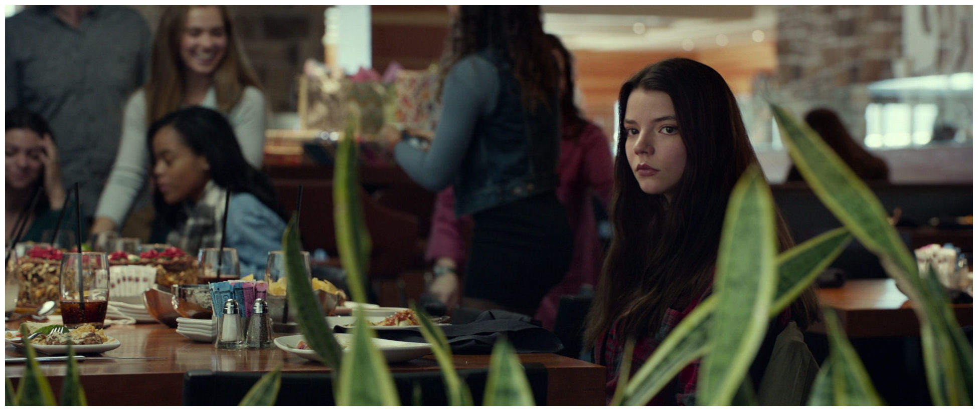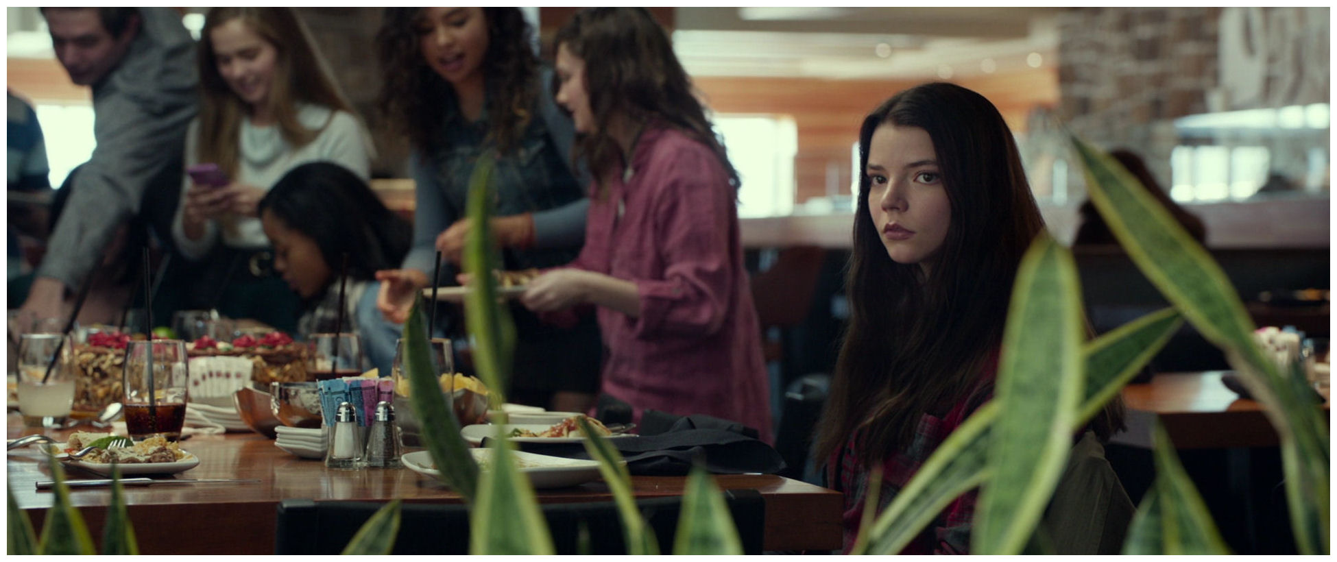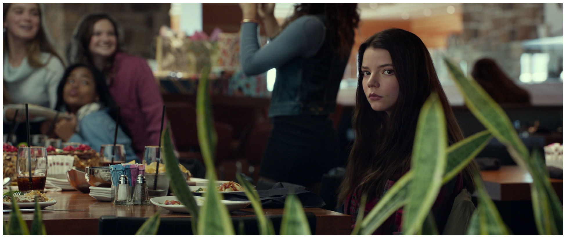 The opening of Split is particularly inspired. We see Casey in splendid isolation from the other girls frolicking at Claire’s birthday party (in the up-market King of Prussia mall just outside Philadelphia). Visually it exerts an enduring fascination, through a device that it feels innovative to utilise as early as in an opening shot: a judicious use of a Vertigo shot, so subtly applied as to be almost invisible, but also a bit hard to get a grip on. The camera seems to be tracking out while zooming in, but in a hesitant, arhythmic, “impure” fashion, and there also appears to be some panning going on. The icky-looking plants in the foreground basically stay constant.