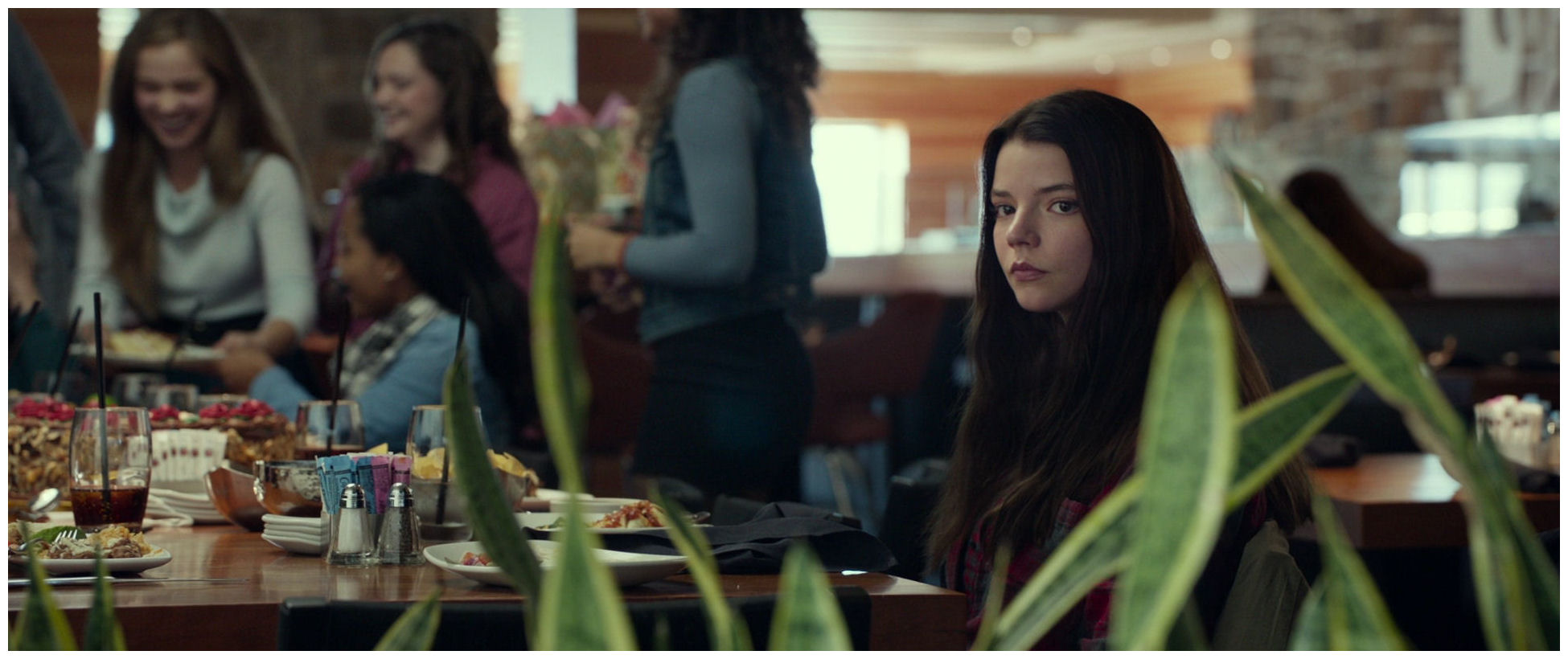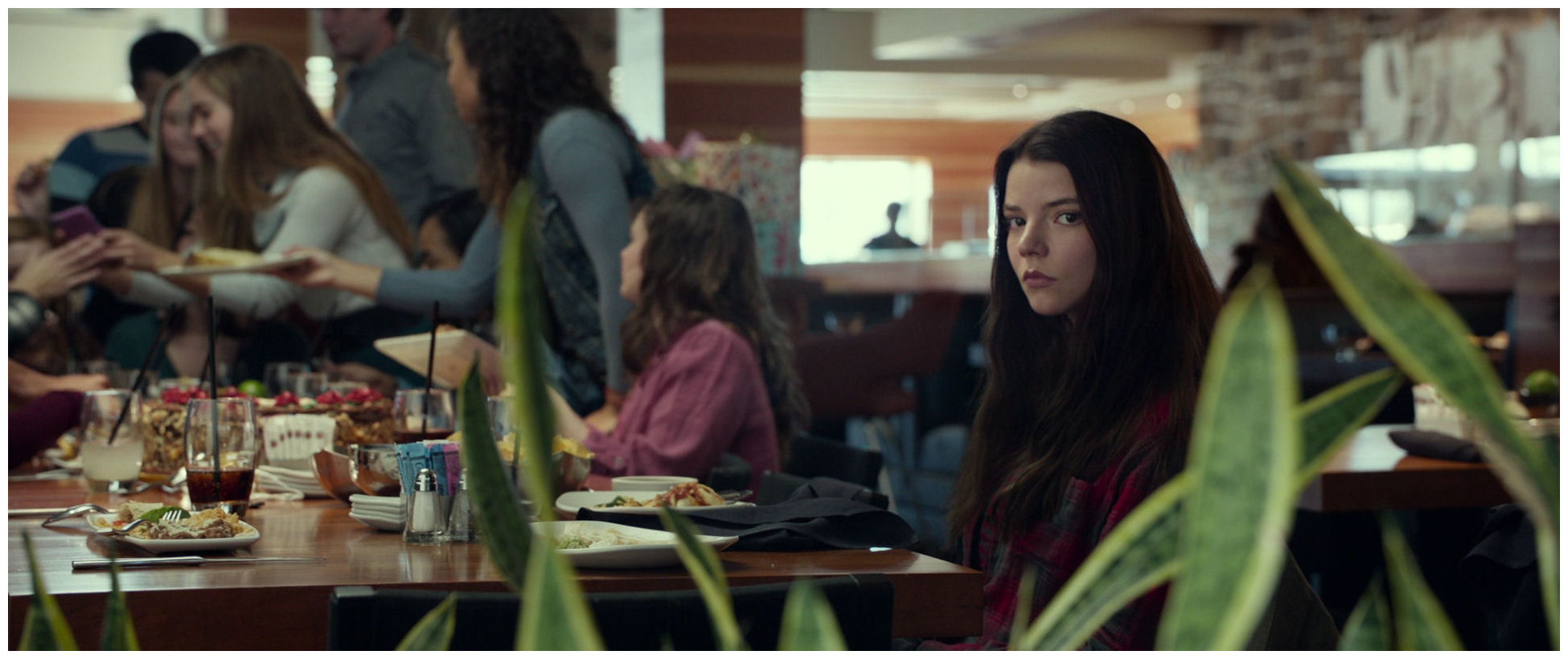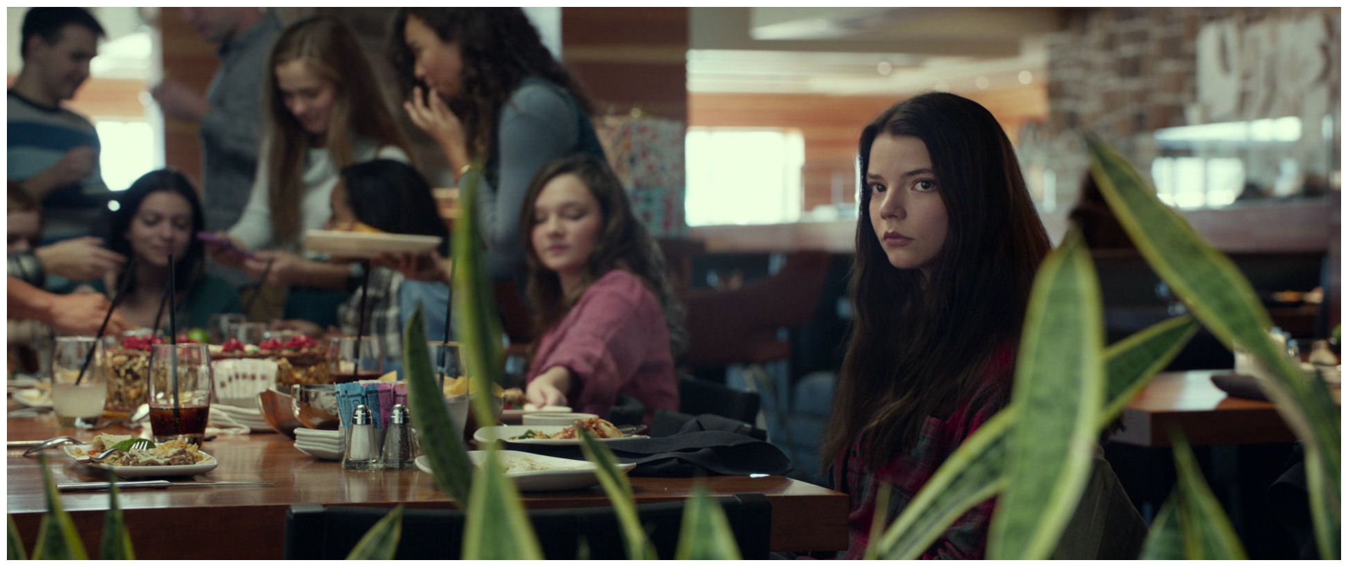 The opening of Split is particularly inspired. We see Casey in splendid isolation from the other girls frolicking at Claire’s birthday party (in the up-market King of Prussia mall just outside Philadelphia). Visually it exerts an enduring fascination, through a device that it feels innovative to utilise as early as in an opening shot: a judicious use of a Vertigo shot, so subtly applied as to be almost invisible, but also a bit hard to get a grip on. The camera seems to be tracking out while zooming in, but in a hesitant, arhythmic, “impure” fashion, and there also appears to be some panning going on. The icky-looking plants in the foreground basically stay constant.