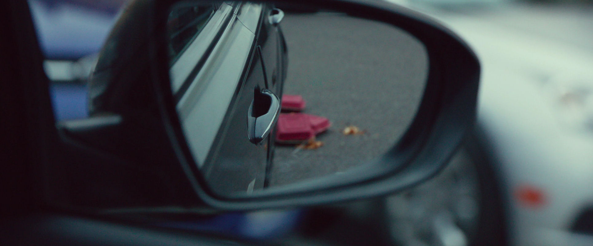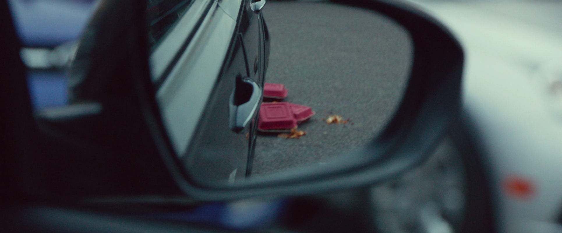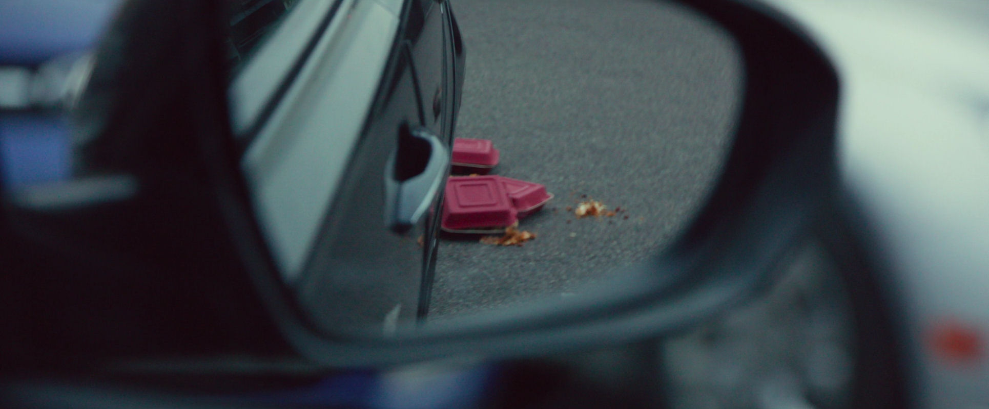 The new visual information is very unsettling: why is left-over food from the restaurant now spilled on the tarmac?! At the same time the utter mundanity of the items is disarming. The red colour, however, might signal danger. Also, there are three boxes, two close together and one further away, the number and placement corresponding to the girls and their position in the car. The untidiness is in ironic contrast to Dennis’s soon-to-be-revealed obsessive neatness.