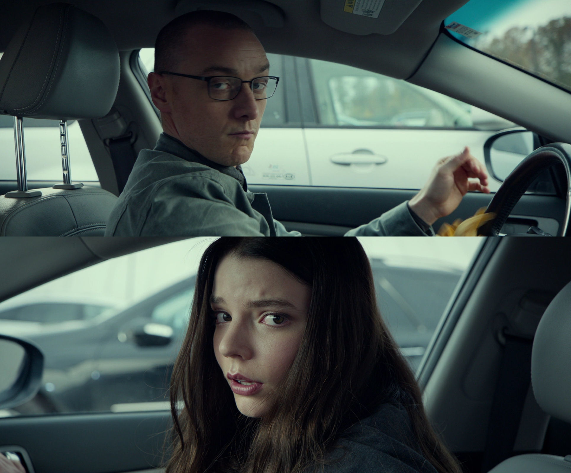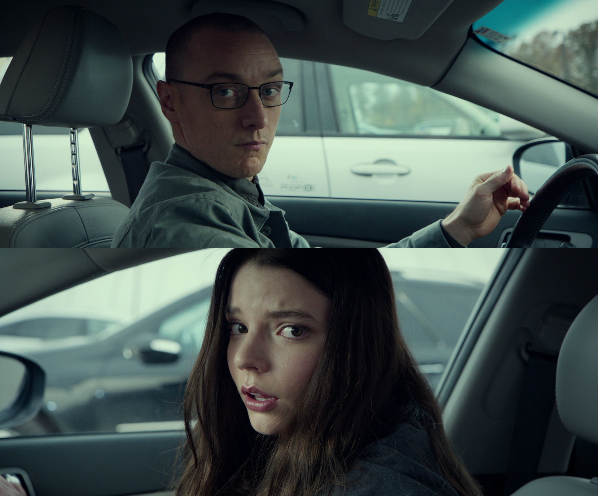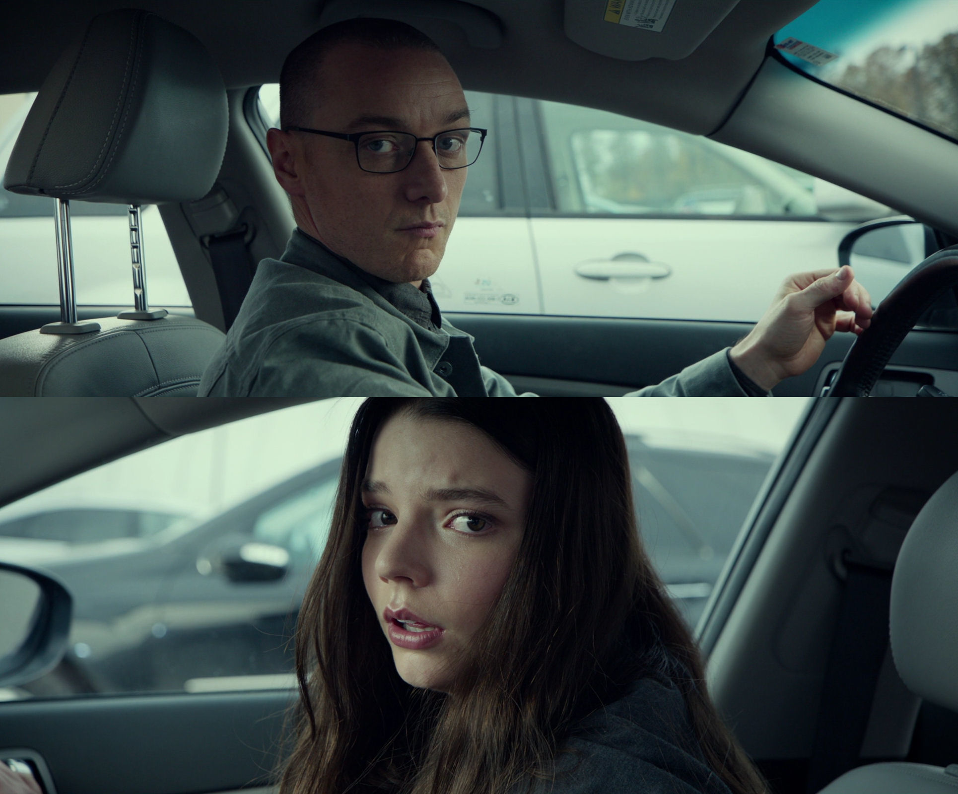 The car is also an arena for another Shyamalan concern: the home invasion, unfolding in film after film. This interview describes the director’s fear of a disruption of normal life (and how his children at various ages have influenced him). In Split, however, most of the invasion has already happened: the evil mother tormenting Kevin, the guardian/uncle abusing Casey. In the car invasion, history repeats itself for Casey in a parallel version: Claire’s father is replaced by a tormentor – literally speaking, by taking the father’s place behind the wheel – who proceeds to claim dictatorial control over their lives.