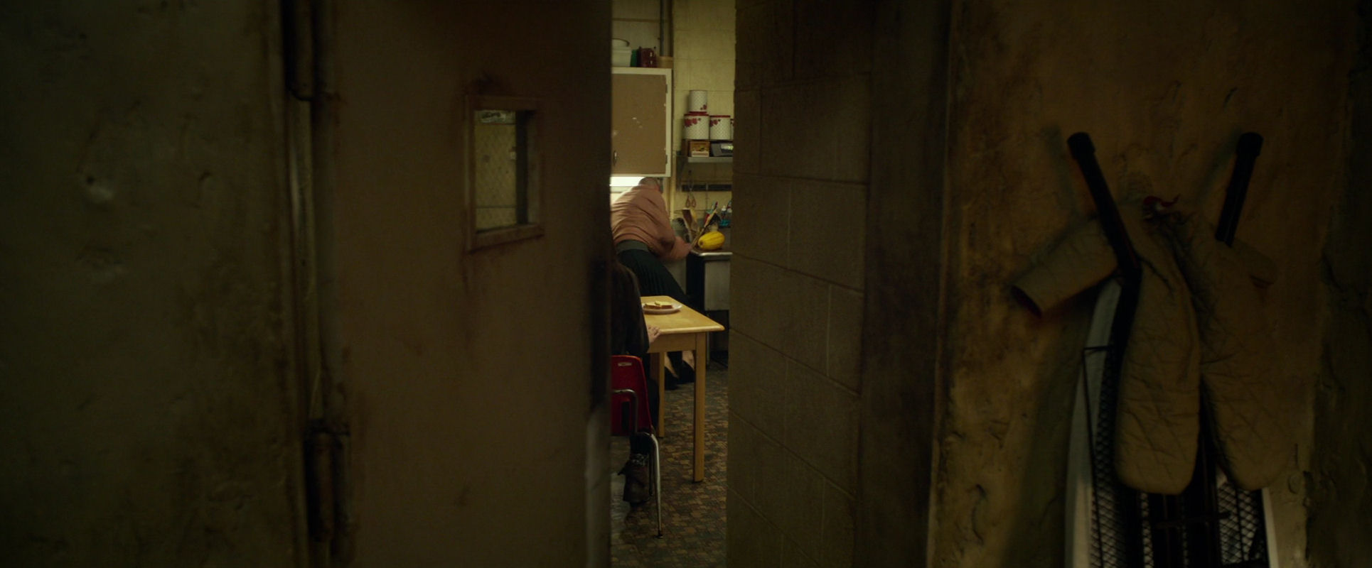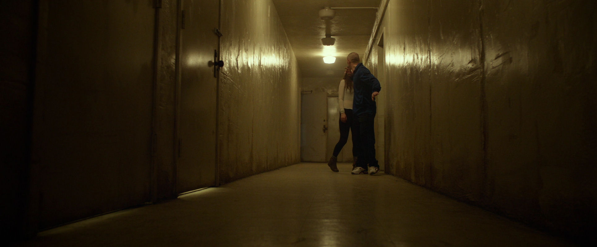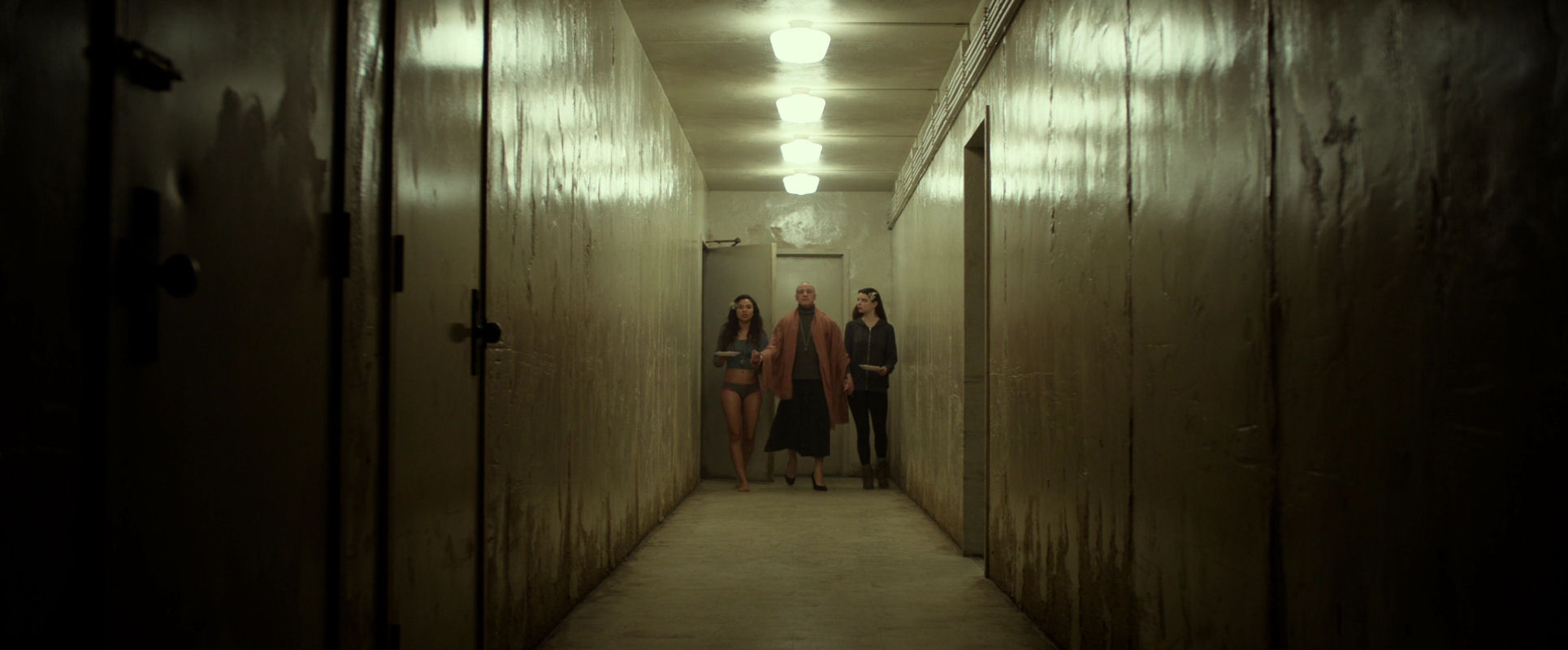 Most of the doors in Split are infuriatingly, despairingly closed. Its second-most prevalent motif is corridors, captured in a way that conjures up a world of limited options, lines of perspective receding, inexorably narrowing, as if a metaphor of the point-of-no-return consequences of The Horde’s actions. The main corridor is the tight, yellow passage that links most of the important locations: the anteroom leading to the cell, the kitchen, Hedwig’s room, the two closets that will hold Claire and Marcia. There is another corridor, more like a tunnel, which will engulf Split, as it grows darker and murkier, more id-like, towards the end. Leading into the basement itself, there is an outer, broader corridor…