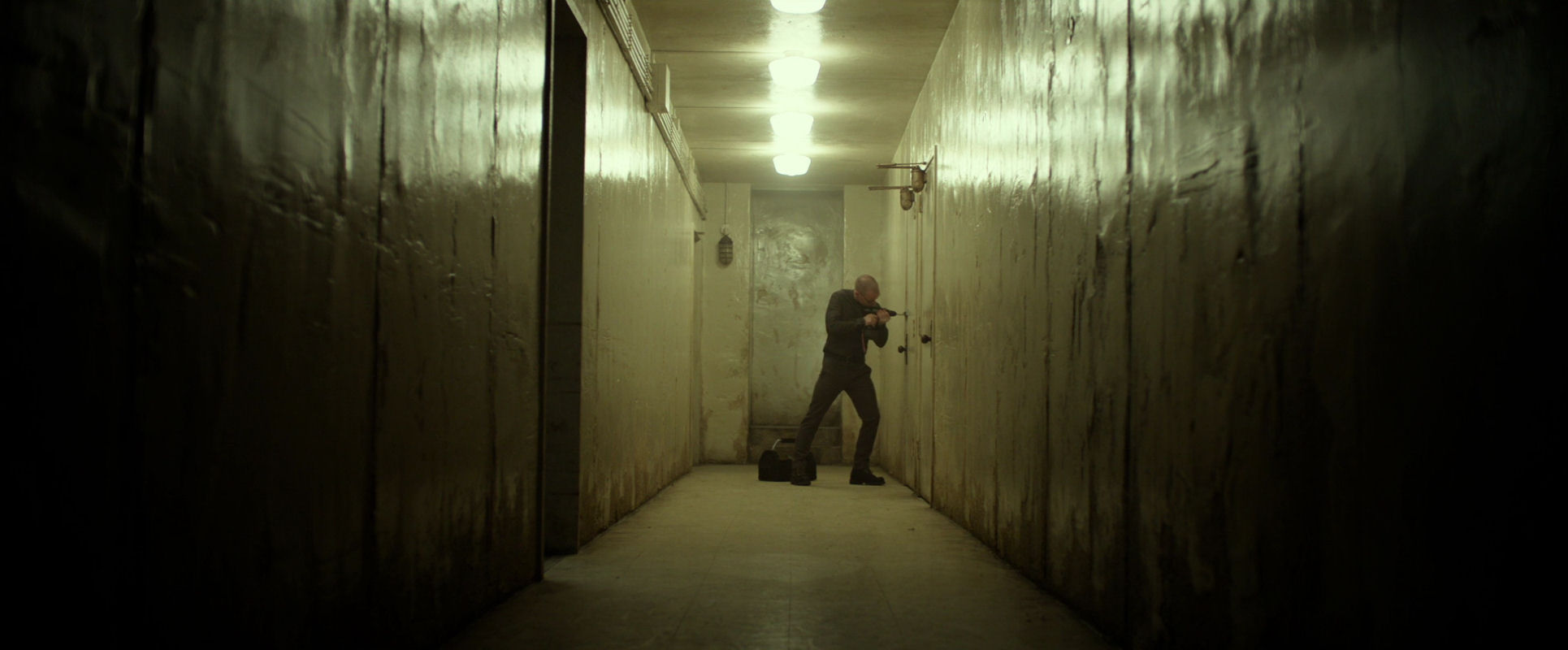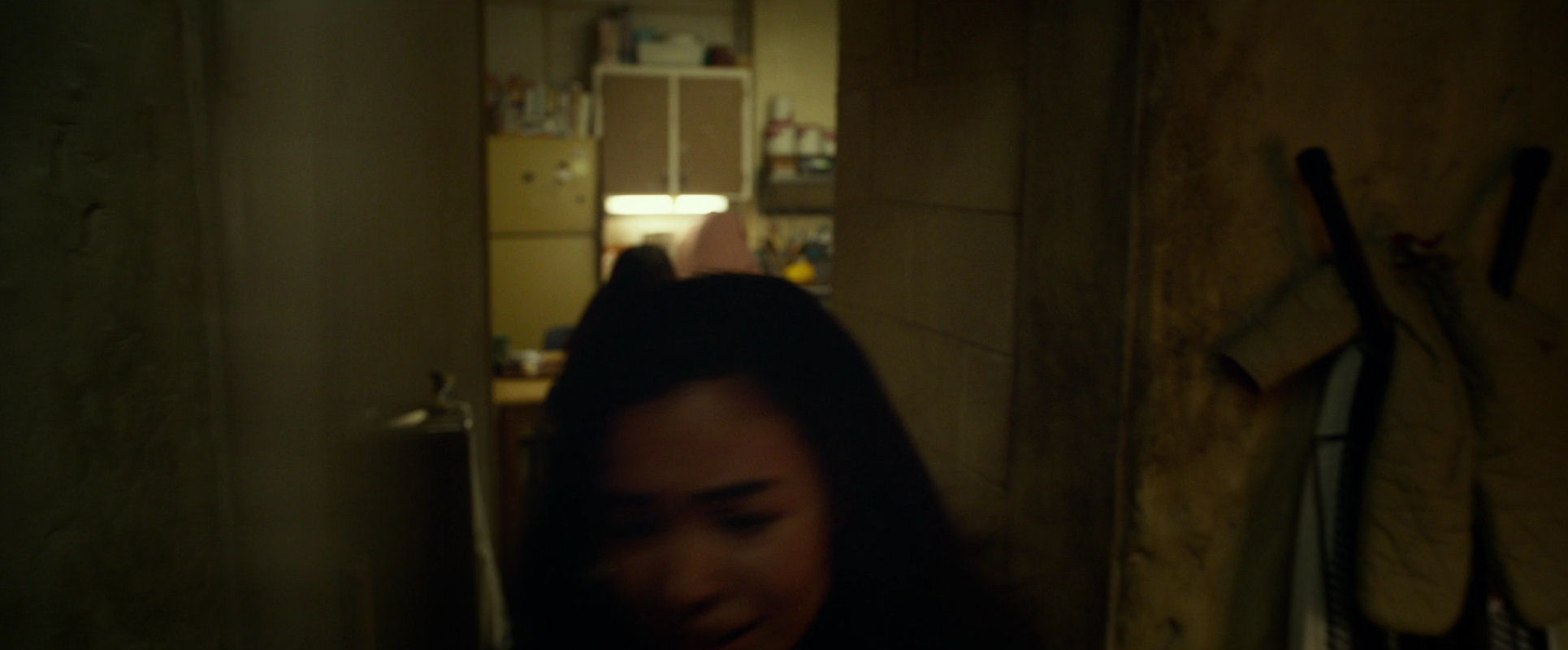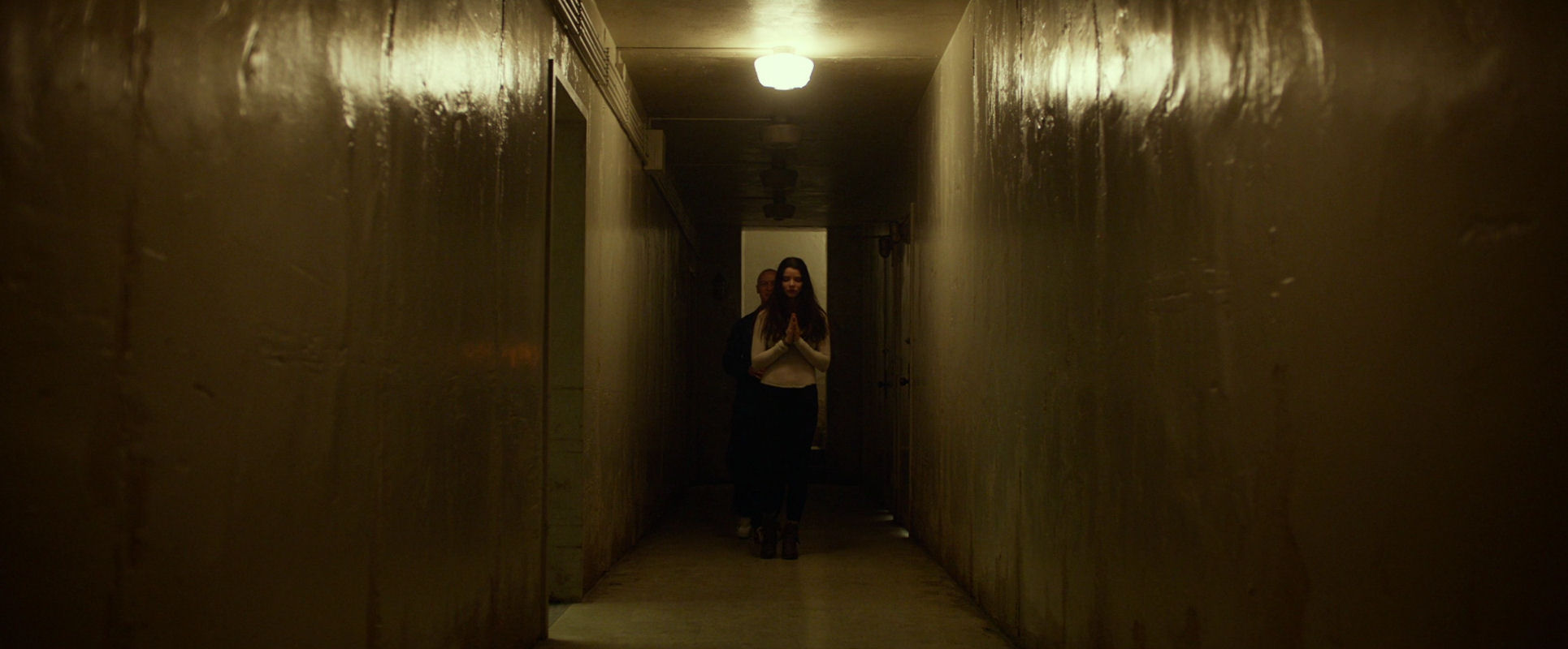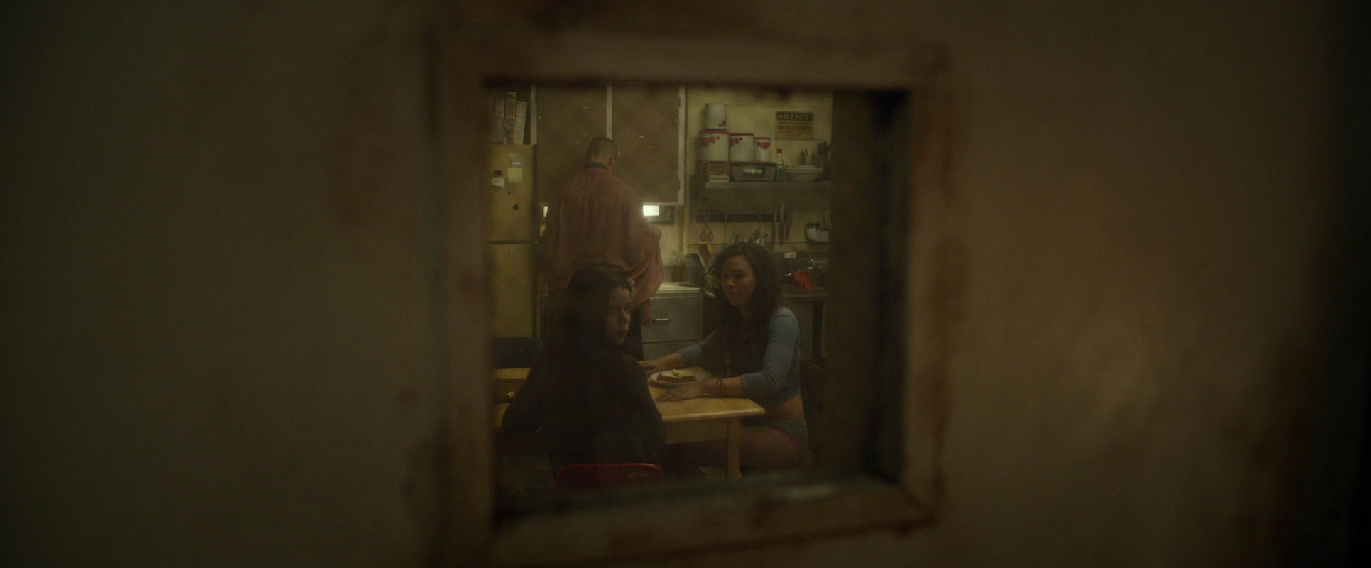 Most of the doors in Split are infuriatingly, despairingly closed. Its second-most prevalent motif is corridors, captured in a way that conjures up a world of limited options, lines of perspective receding, inexorably narrowing, as if a metaphor of the point-of-no-return consequences of The Horde’s actions. The main corridor is the tight, yellow passage that links most of the important locations: the anteroom leading to the cell, the kitchen, Hedwig’s room, the two closets that will hold Claire and Marcia. There is another corridor, more like a tunnel, which will engulf Split, as it grows darker and murkier, more id-like, towards the end. Leading into the basement itself, there is an outer, broader corridor…